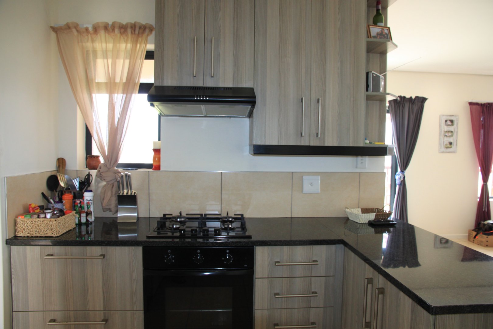 The kitchen is fully fitted with cupboards, gas hob and electric oven. There is also an extractor above the hob.