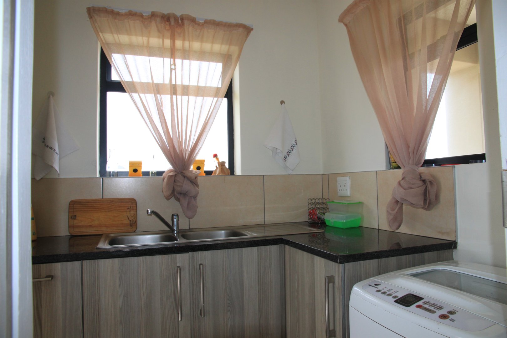 There is a scullery attached to the kitchen, where the sink, and washing machines are located, and leads out into the private courtyard, where the washing lines are located.