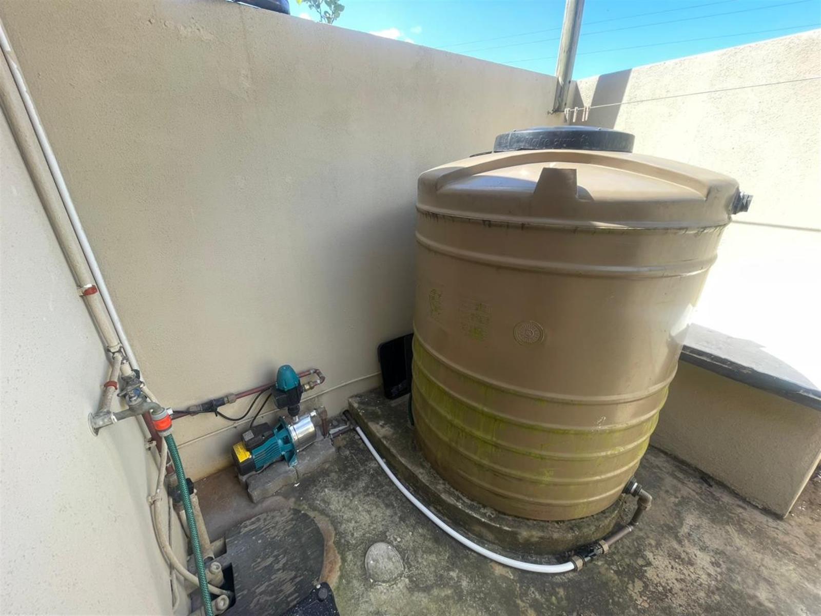 The passage leads you to three bedrooms, all fitted with built in cupboards including the main bedroom with en suite. A second bathroom conveniently serves guests and the two additional bedrooms. Outside, you’ll find a beautifully maintained garden with fruit trees, a small courtyard off the kitchen, and water tanks with a pump for added sustainability.
