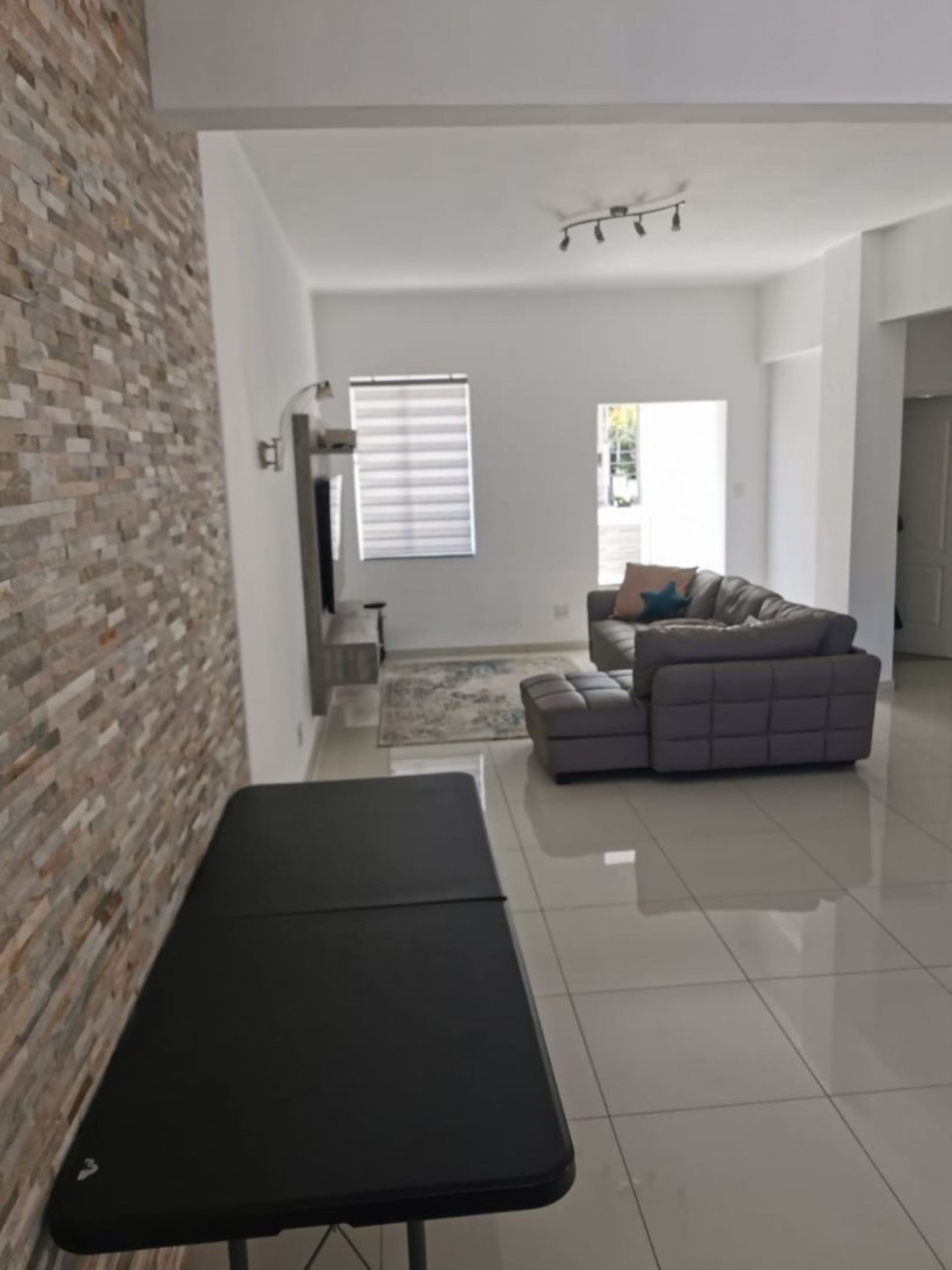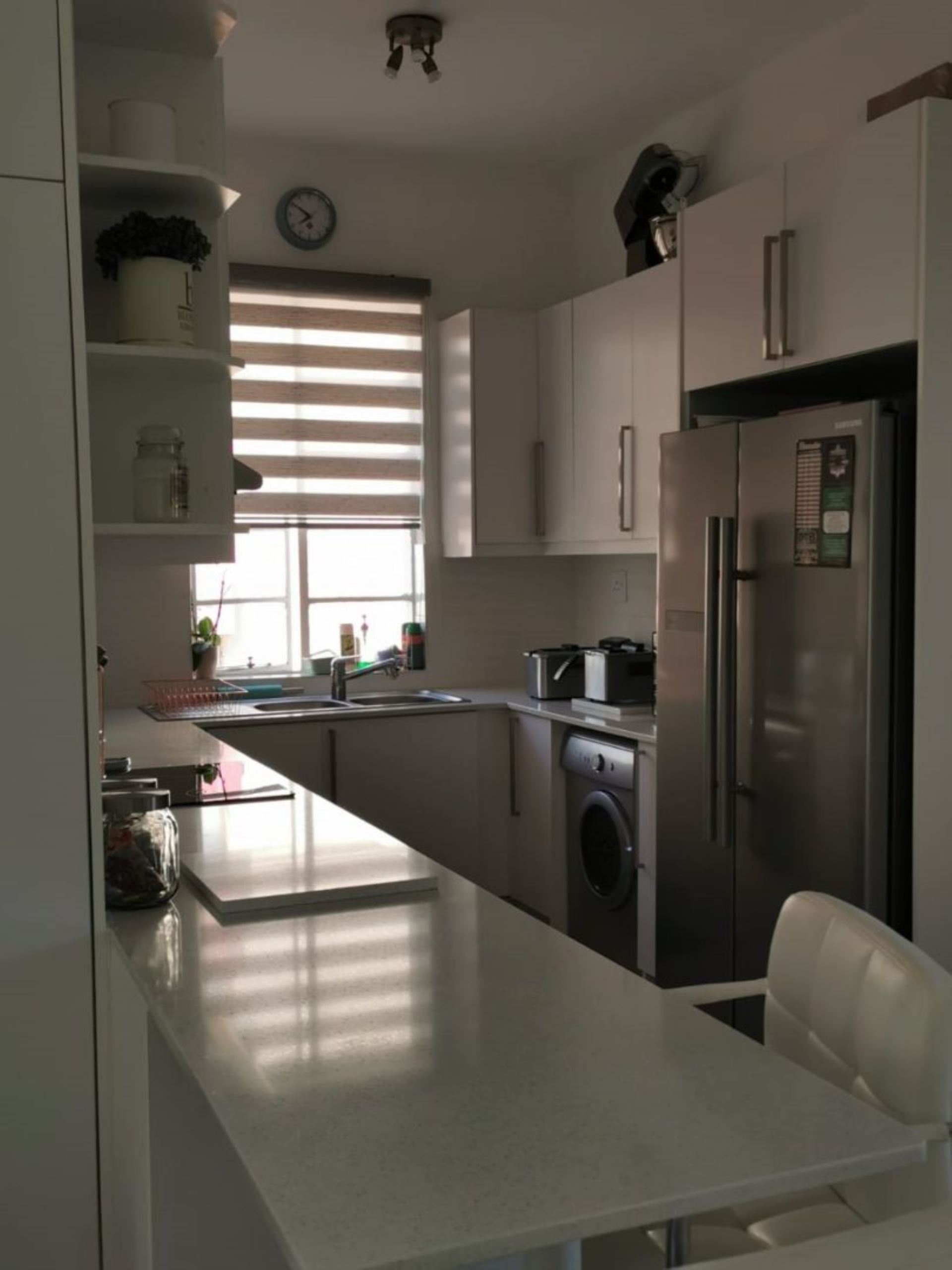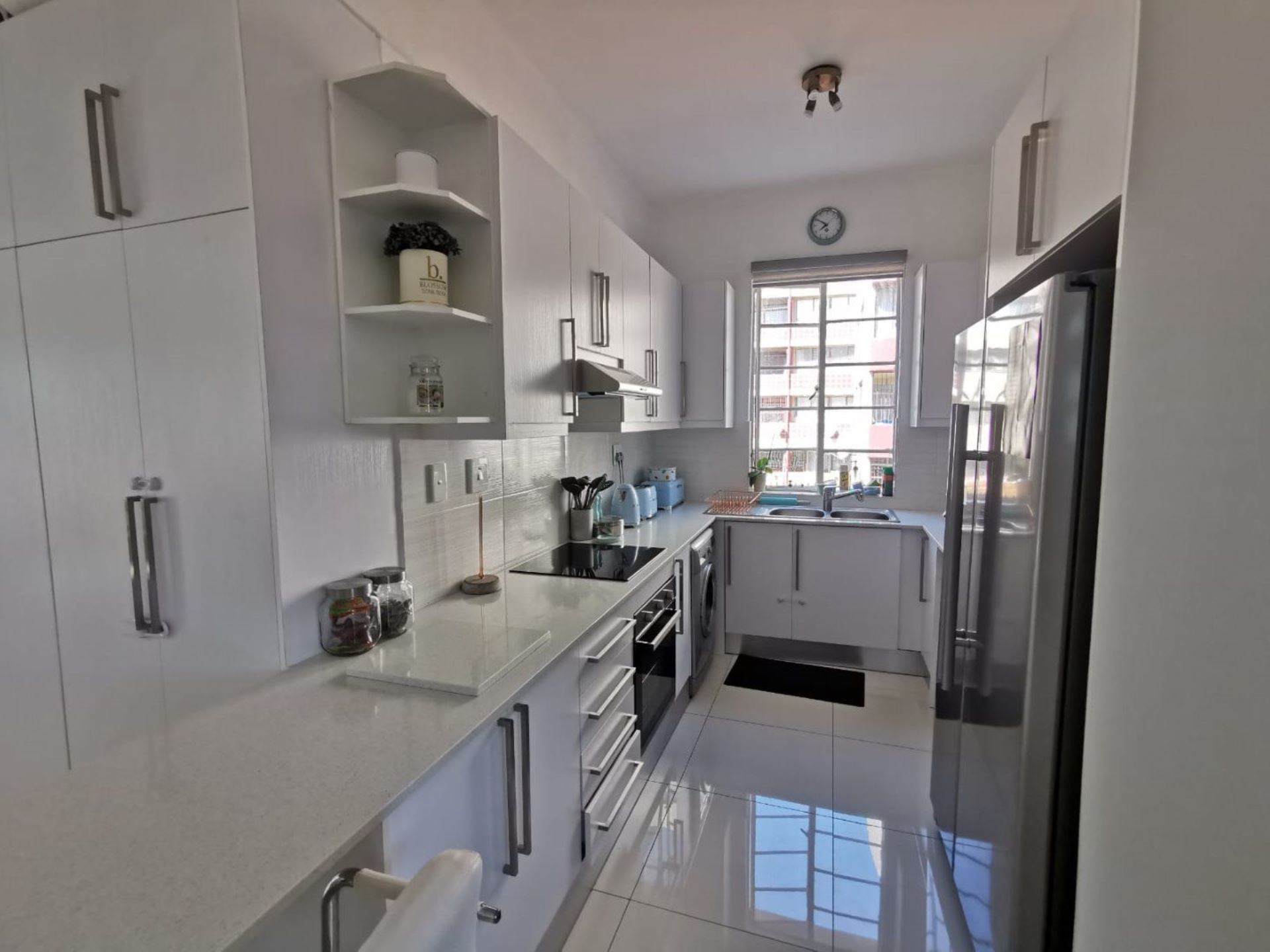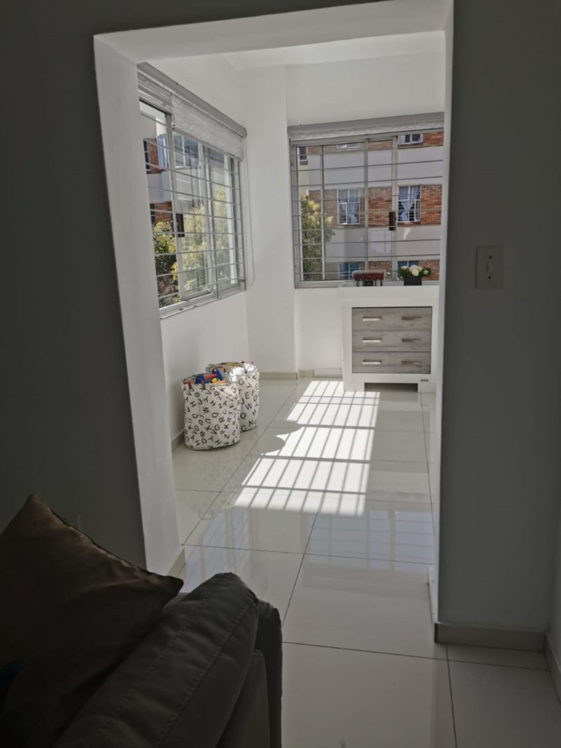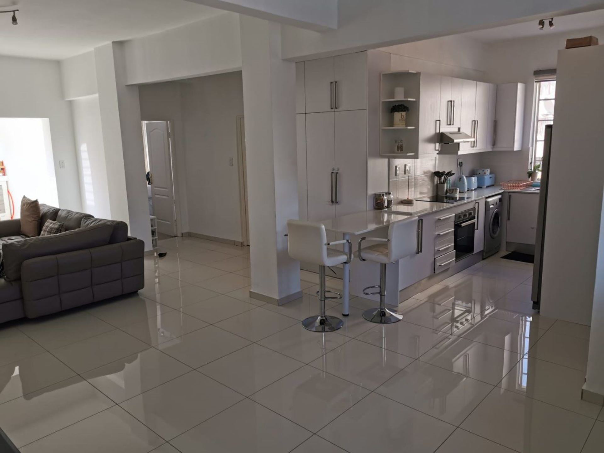 Amazingly ultra modern renovated lock-up-and go apartment. 108 Square meters. Two bedrooms, one bathroom. Welcoming open plan entrance, kitchen, dining area, lounge enclosed balcony. Floors boasting of carpets and tiles. One garage, one staff quarters. Visitors parking, communal gardens, pet friendly complex. Close to all amenities, Gaubus/Train, schools, hospital, clinics and freeways. Don't miss out on this lovely home.