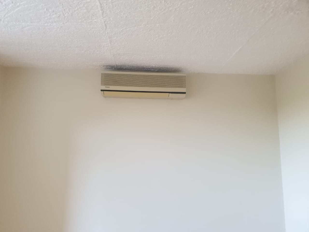 Open plan kitchen, lounge, and dining room air conditioner in lounge.