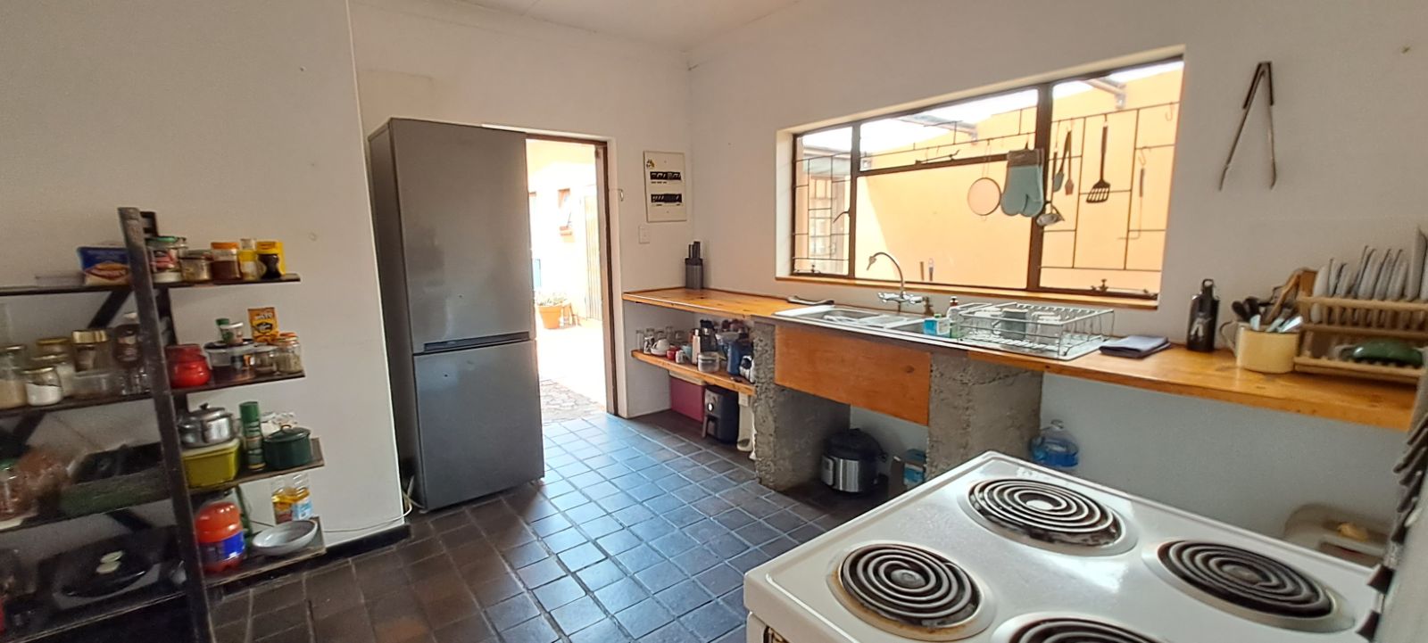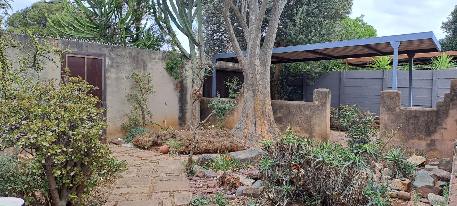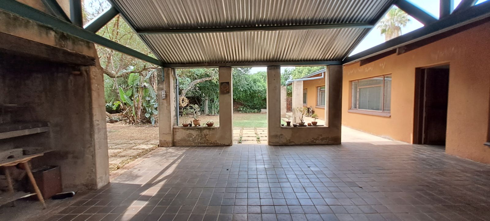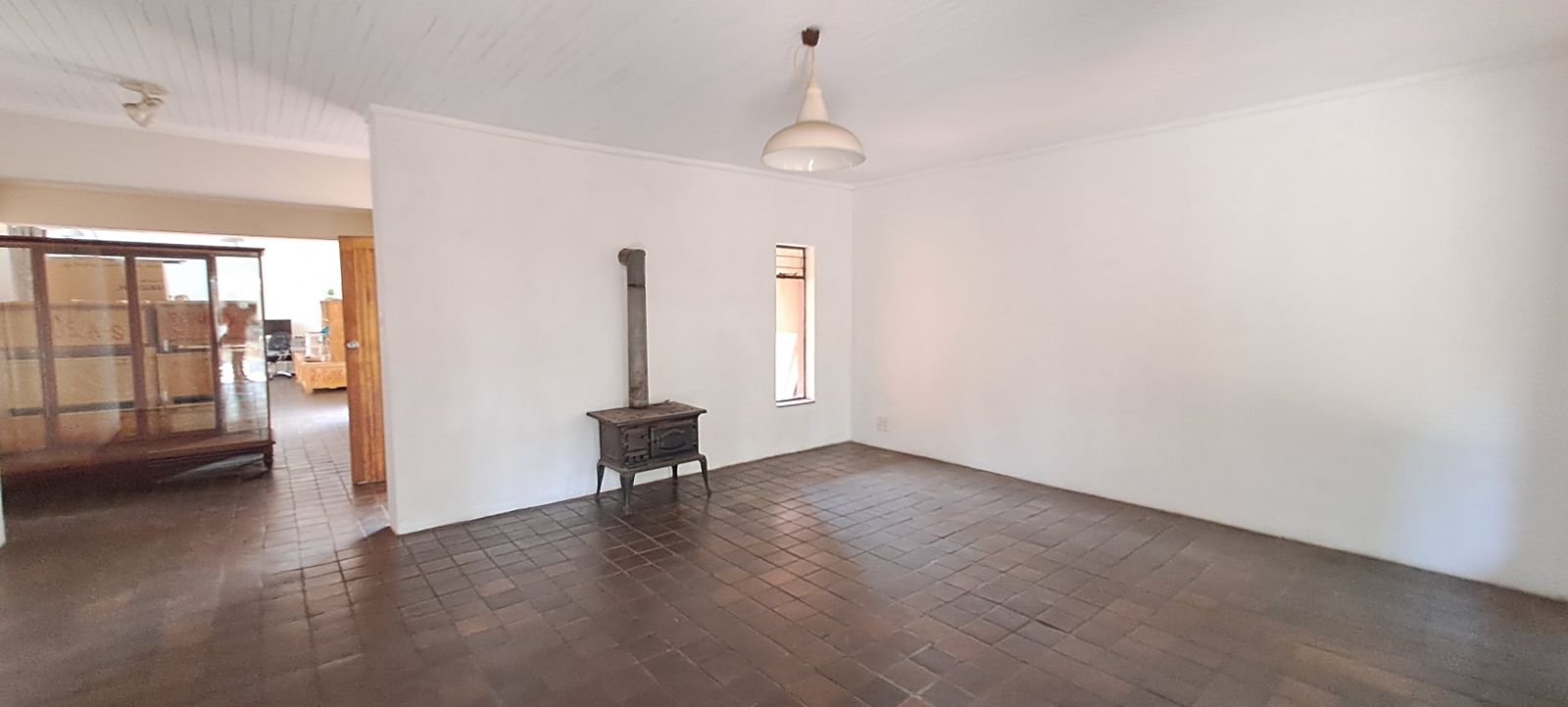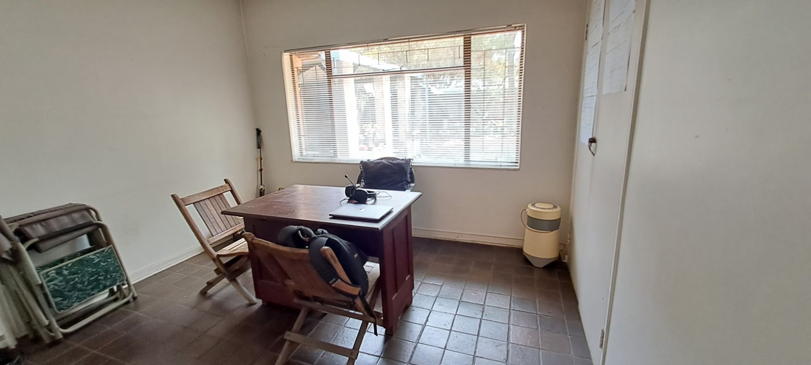 The fully tiled main house offers 3 north-facing bedrooms, a study, 2 modern bathrooms and vast open-plan living areas. One living area/studio with a loft and the other a lounge with an authentic coal stove. The lounge opens to a rustic looking braai/entertainment area and a fully walled, tree filled garden. The kitchen is well positioned and needs built in cupboards.