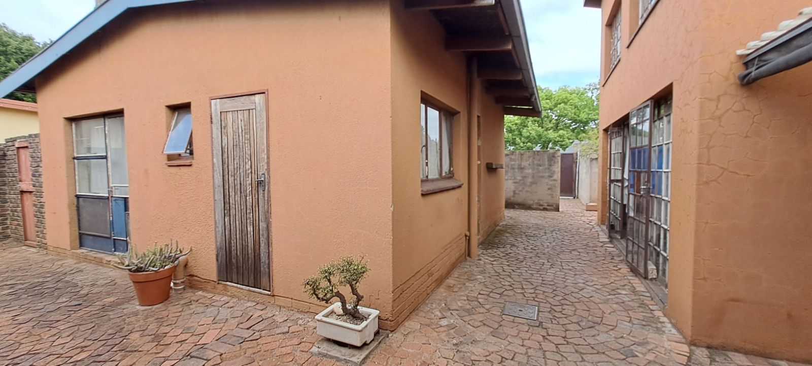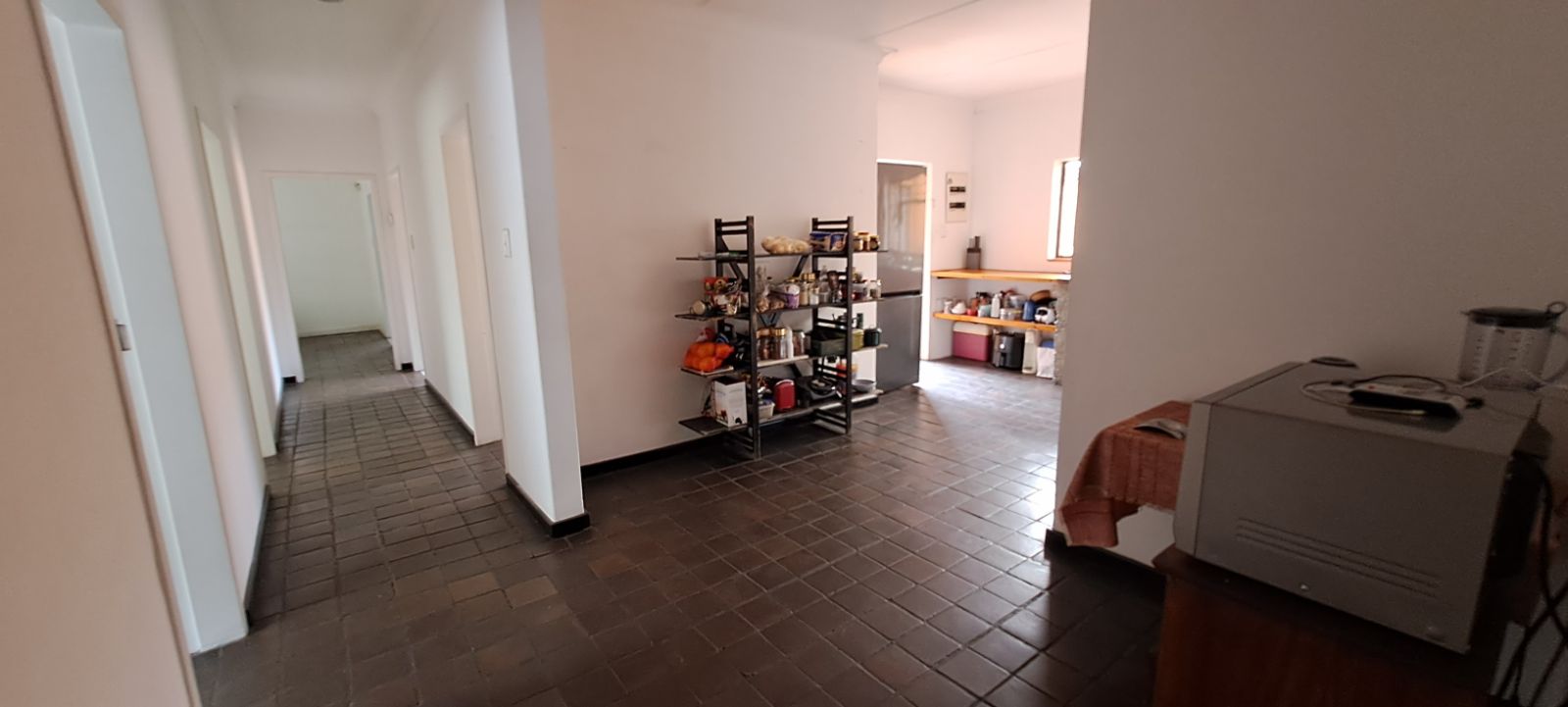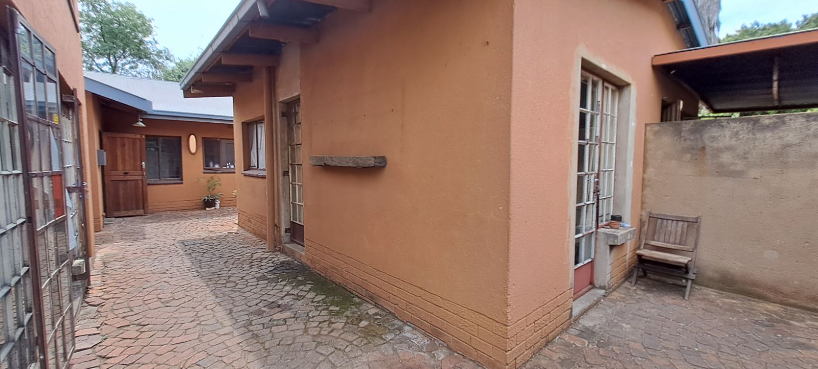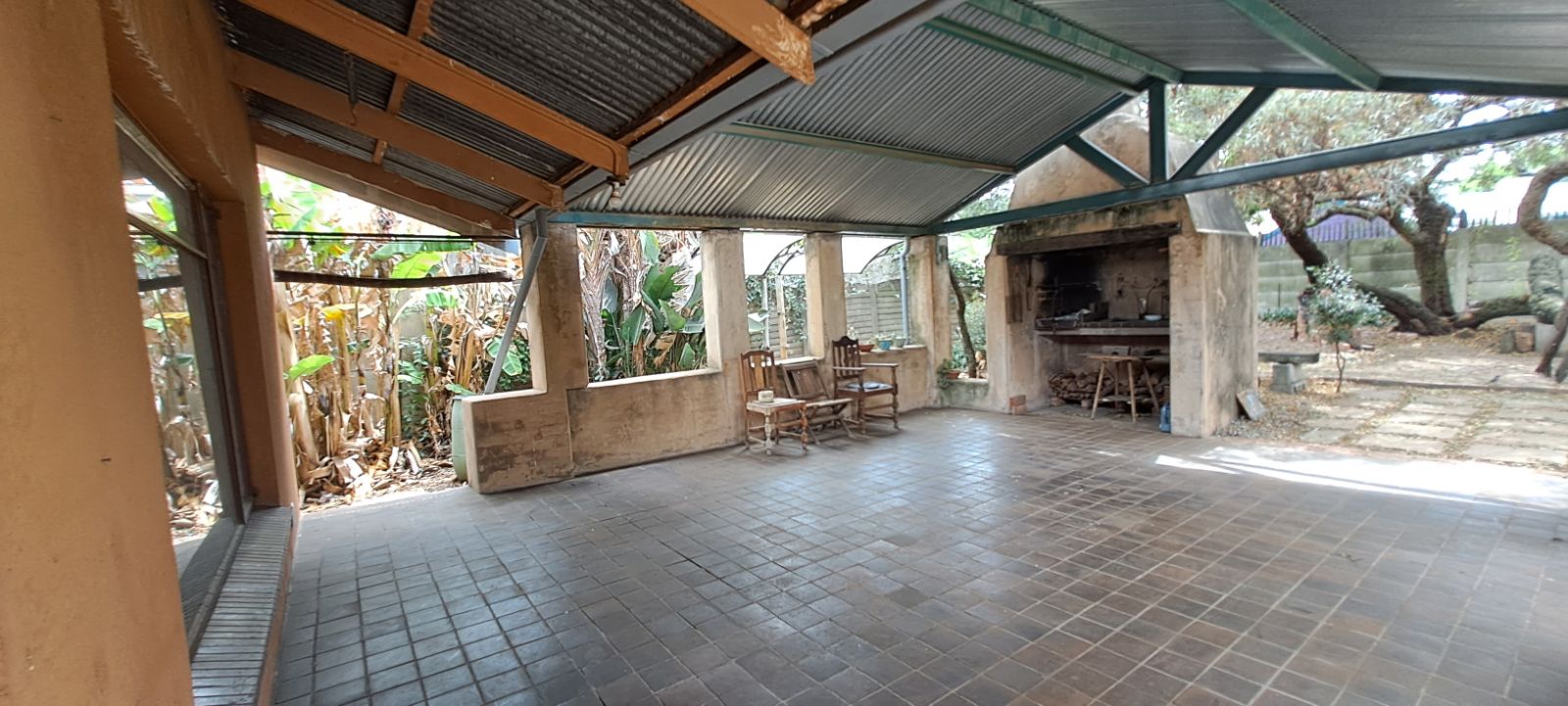 The fully tiled main house offers 3 north-facing bedrooms, a study, 2 modern bathrooms and vast open-plan living areas. One living area/studio with a loft and the other a lounge with an authentic coal stove. The lounge opens to a rustic looking braai/entertainment area and a fully walled, tree filled garden. The kitchen is well positioned and needs built in cupboards.