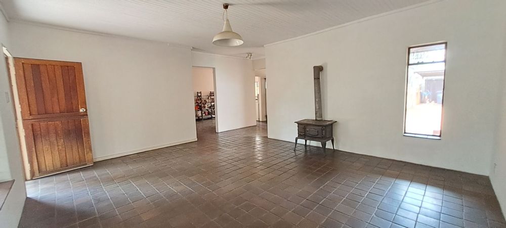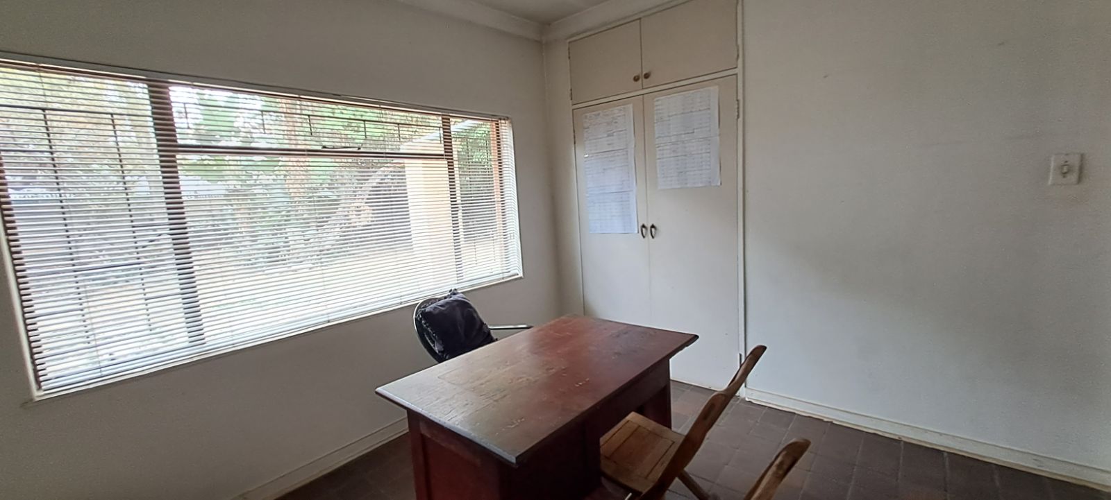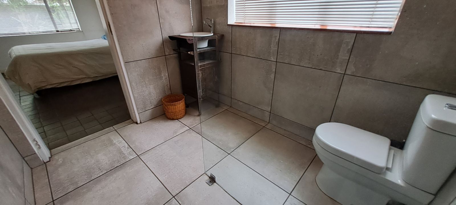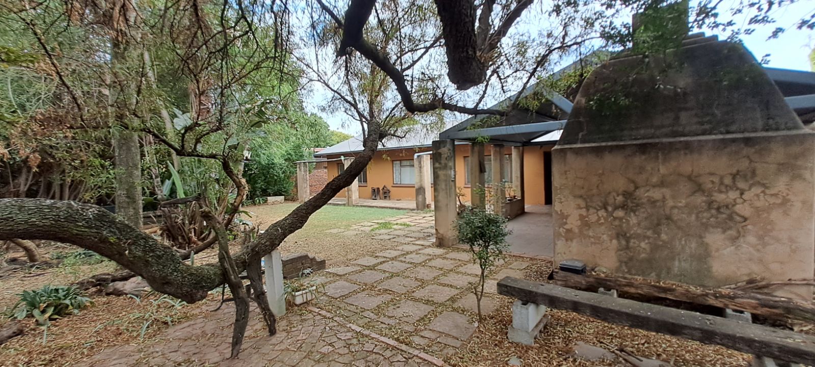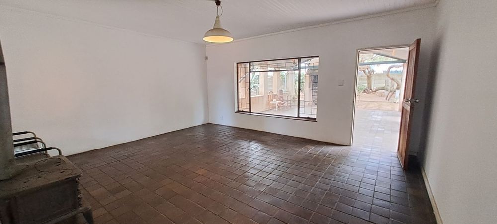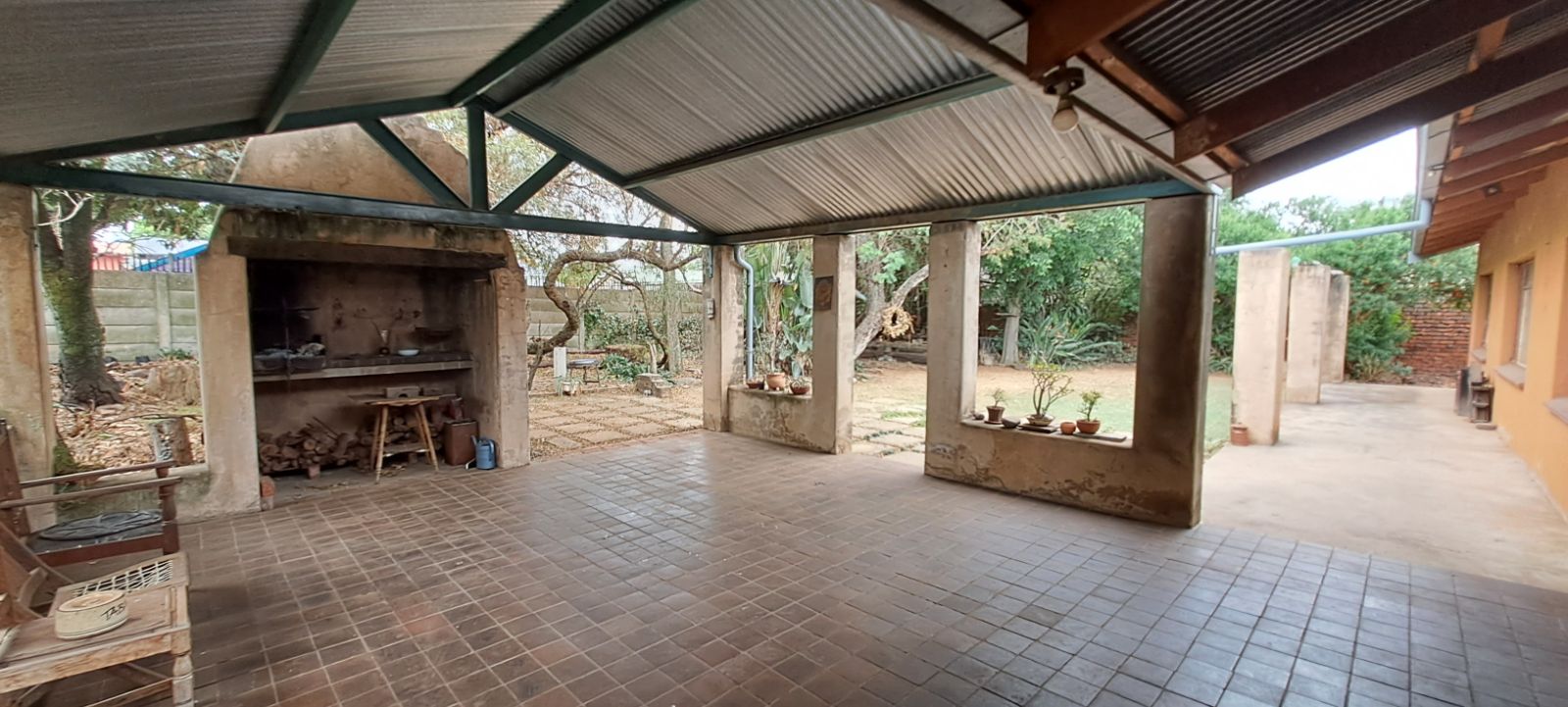 The fully tiled main house offers 3 north-facing bedrooms, a study, 2 modern bathrooms and vast open-plan living areas. One living area/studio with a loft and the other a lounge with an authentic coal stove. The lounge opens to a rustic looking braai/entertainment area and a fully walled, tree filled garden. The kitchen is well positioned and needs built in cupboards.