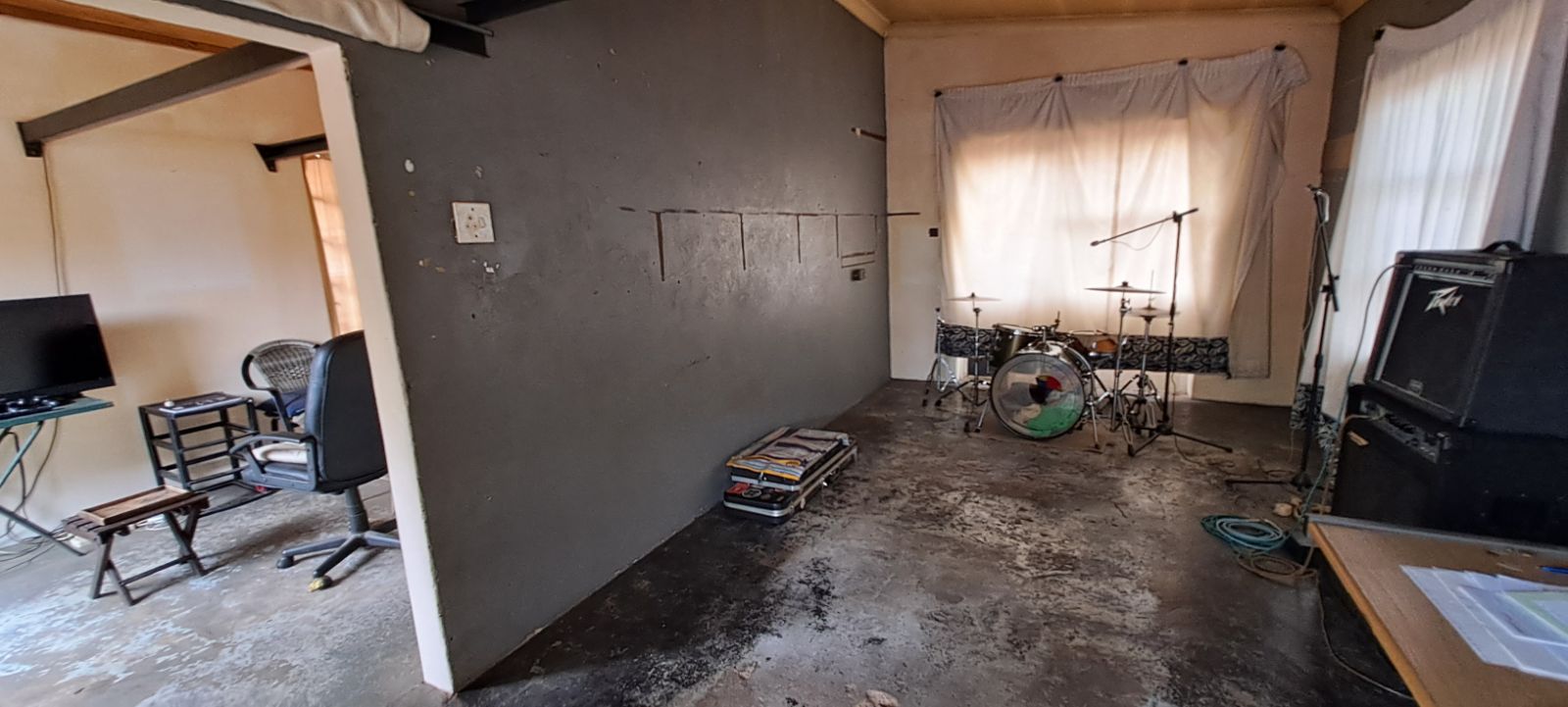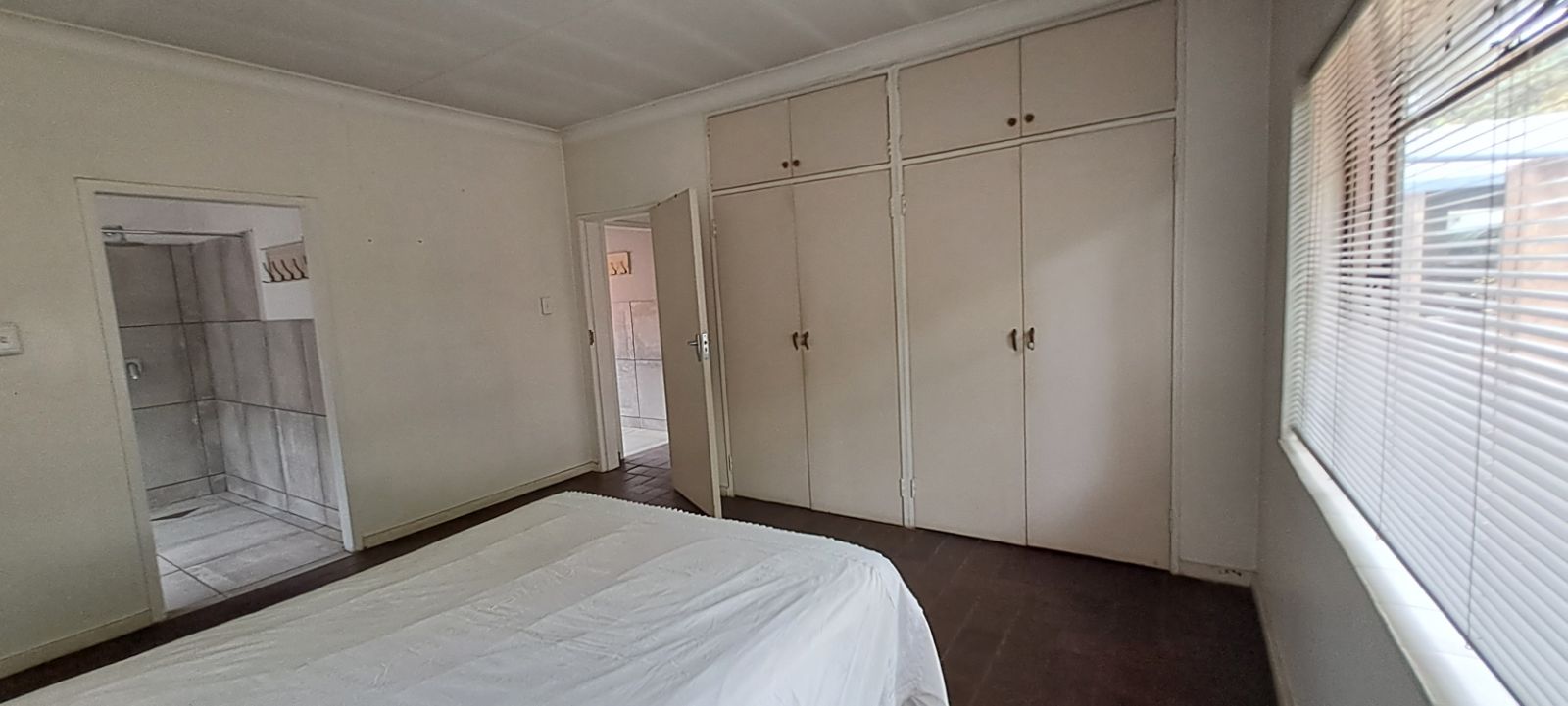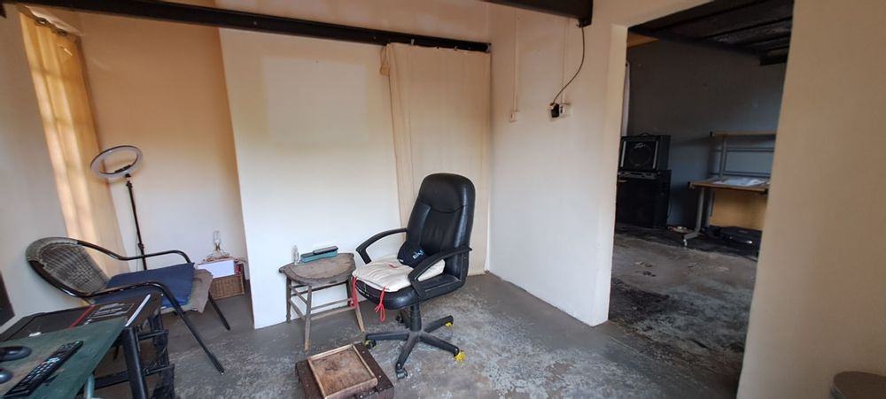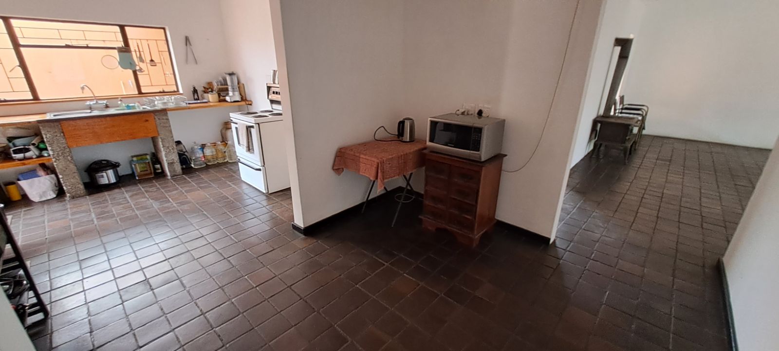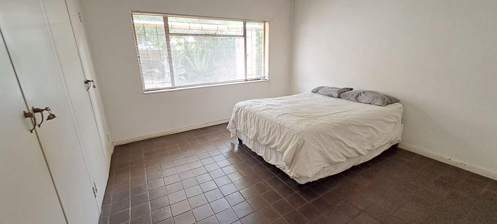 The fully tiled main house offers 3 north-facing bedrooms, a study, 2 modern bathrooms and vast open-plan living areas. One living area/studio with a loft and the other a lounge with an authentic coal stove. The lounge opens to a rustic looking braai/entertainment area and a fully walled, tree filled garden. The kitchen is well positioned and needs built in cupboards.