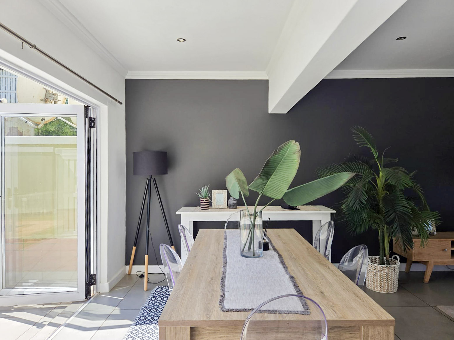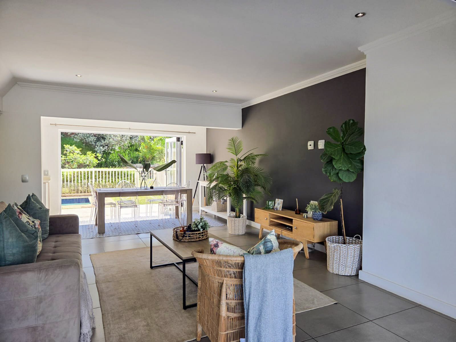 Step into a welcoming entrance hall that leads up into a spacious, light‐filled open‐plan living area. Large stack-back doors open on both sides — one set flowing out to the garden and swimming pool, the other to an expansive patio — creating exceptional airflow and seamless indoor‐outdoor living.