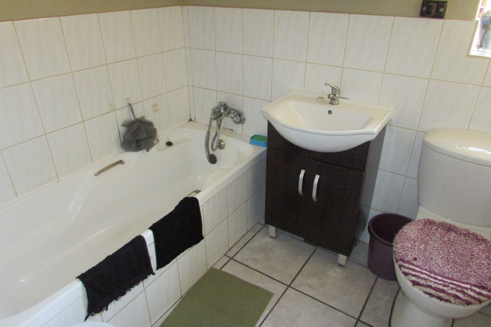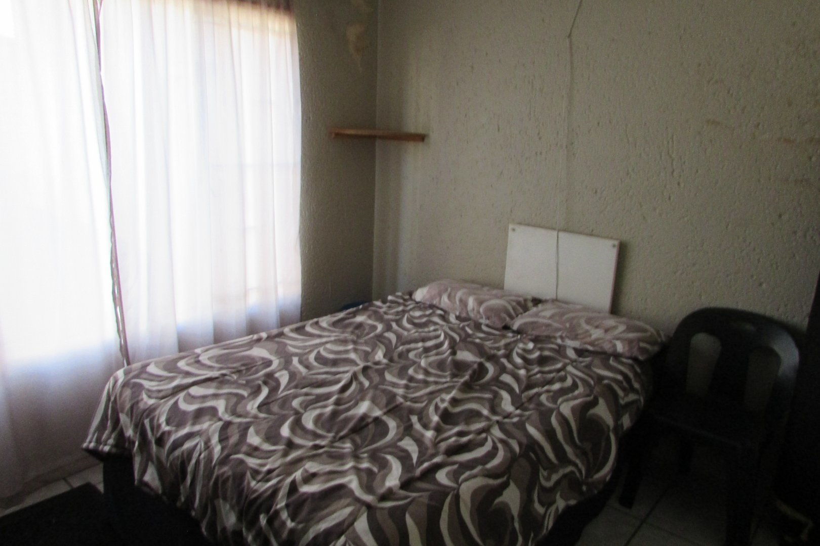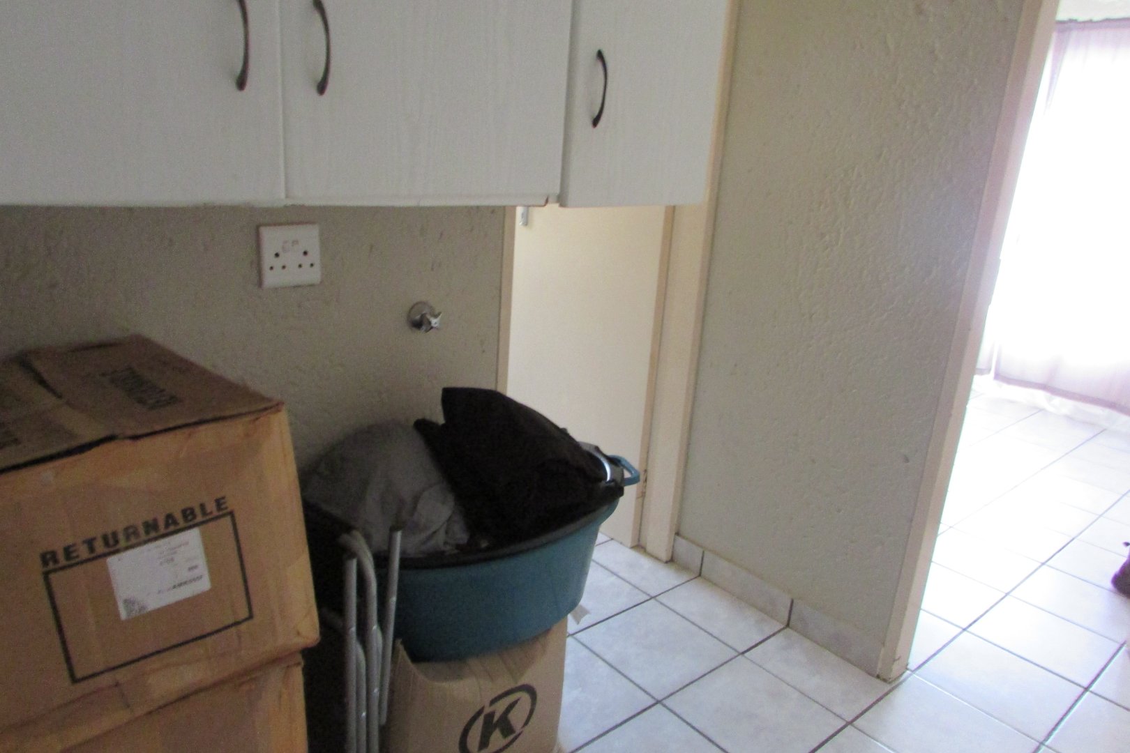 Both bedrooms have built-in cupboards and burglar bars. The bathroom offers a shower, toilet, and basin, while the passage features linen cupboards and fittings for a washing machine.