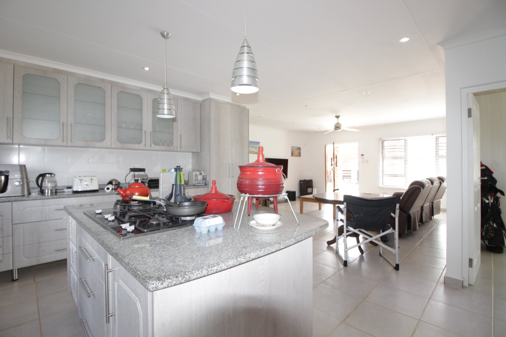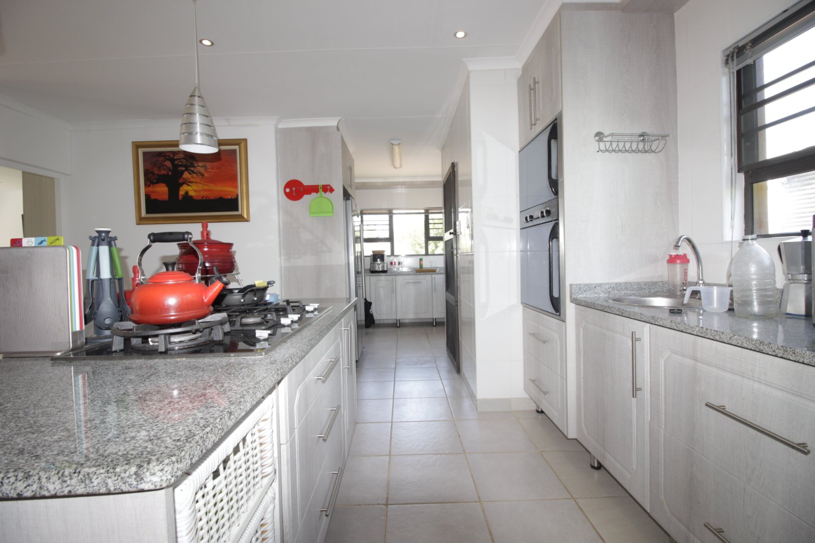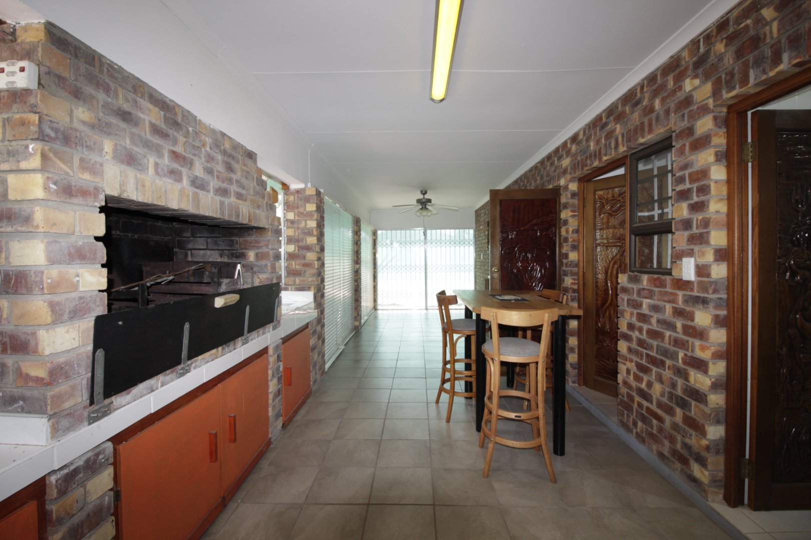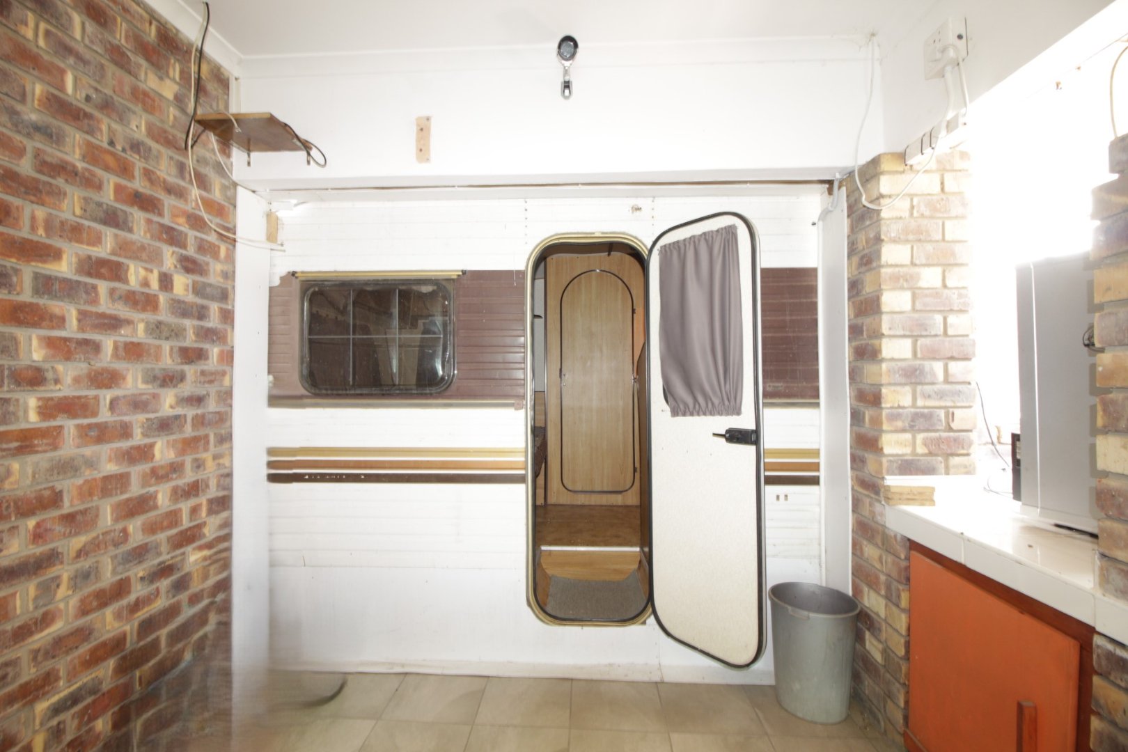 From here, access the garage, which seamlessly flows into a delectable entertainment area complete with a bathroom, storeroom, built-in braai, and sliding doors leading to the outdoors. A stationary caravan with two double beds provides even more space for extended family gatherings.
