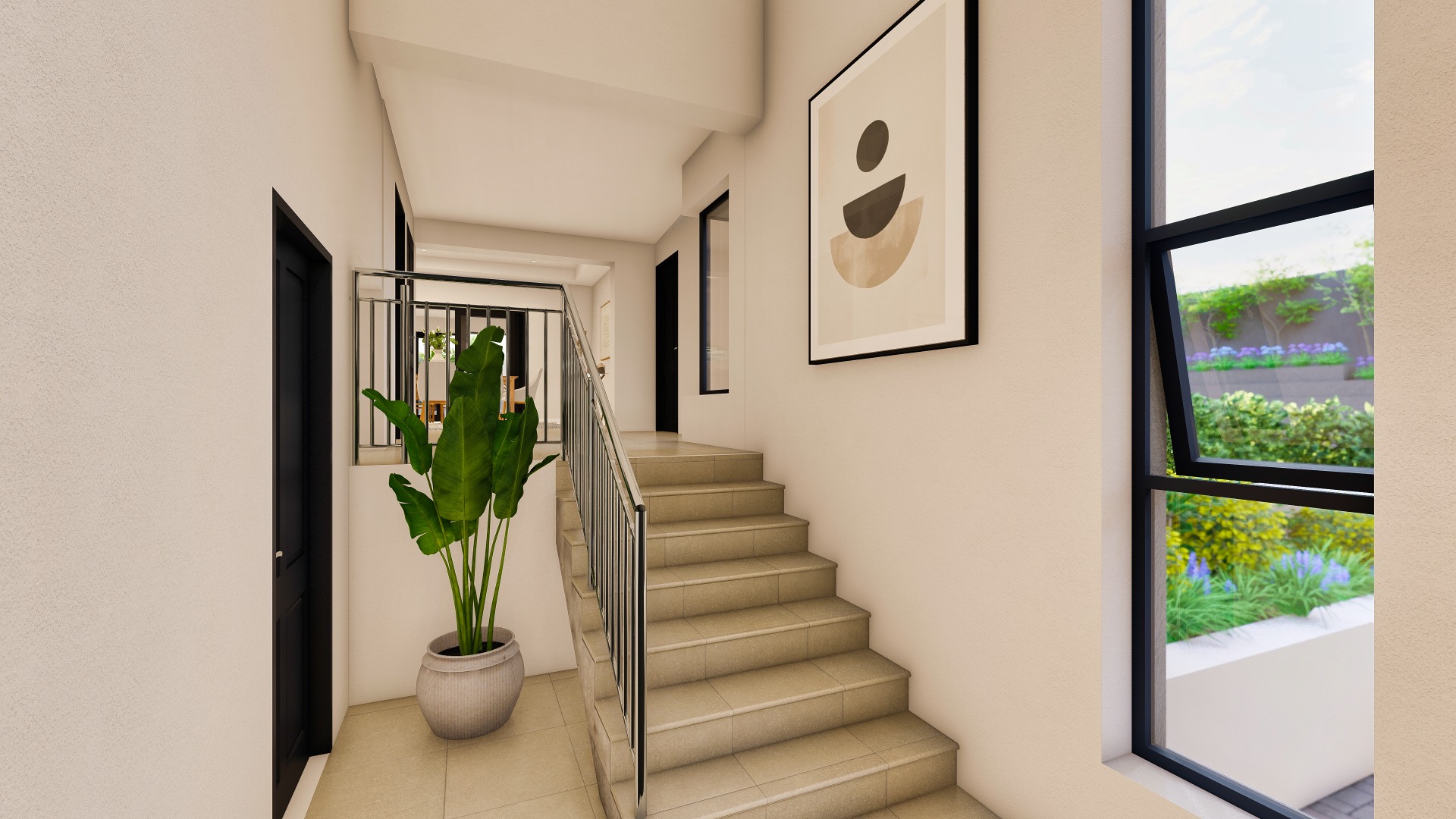 Discover the epitome of comfort in the Master bedroom, conveniently located to the right of the dining room. This luxurious space includes a dressing area and an en-suite bathroom. A stairway in front of the main bedroom leads upstairs to two additional bedrooms that share a well-appointed bathroom. Adjacent to the main bedroom is a storage area, providing practical convenience.