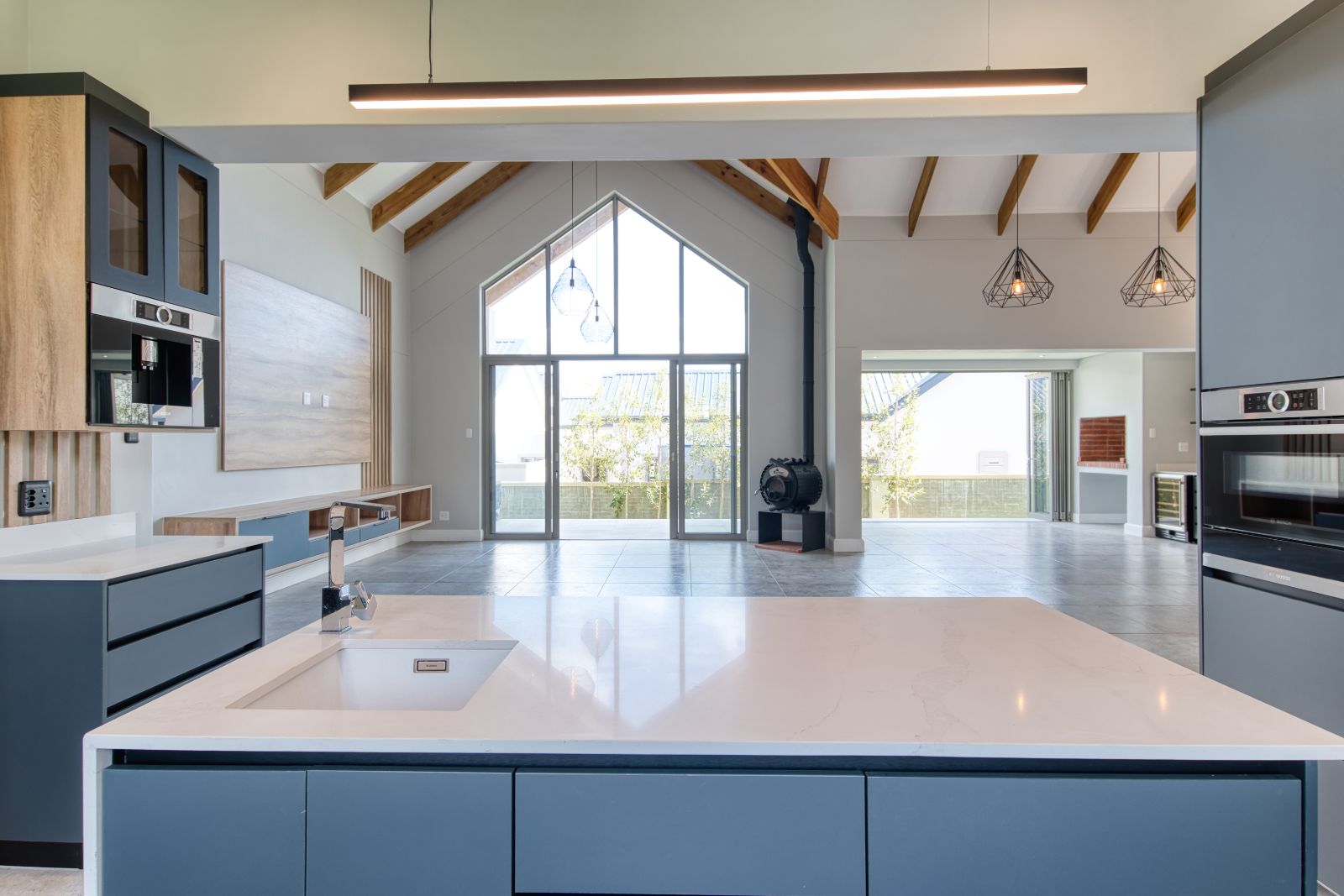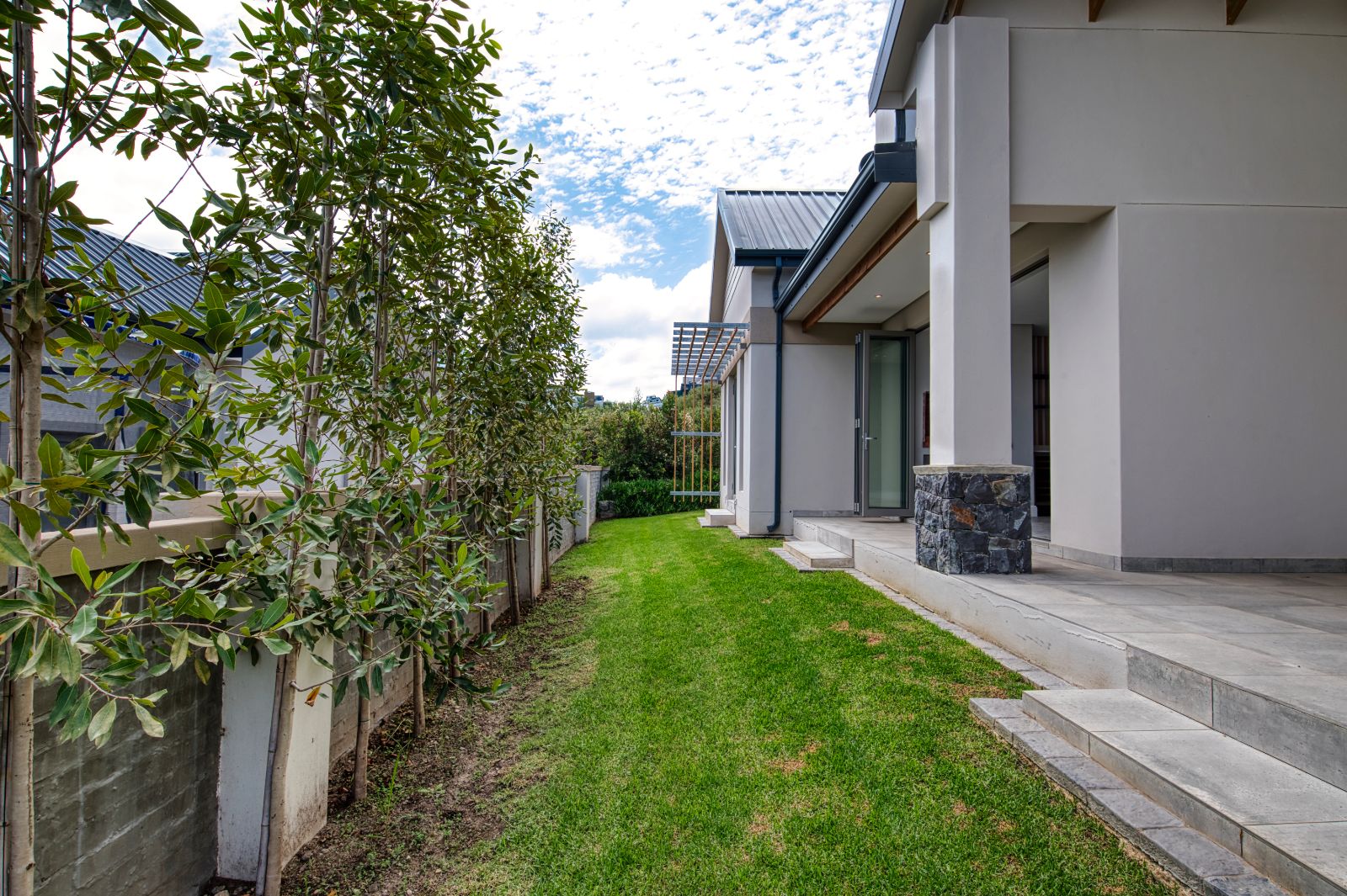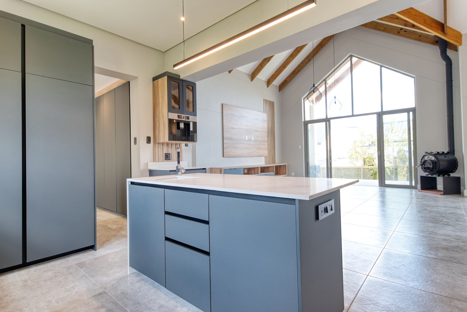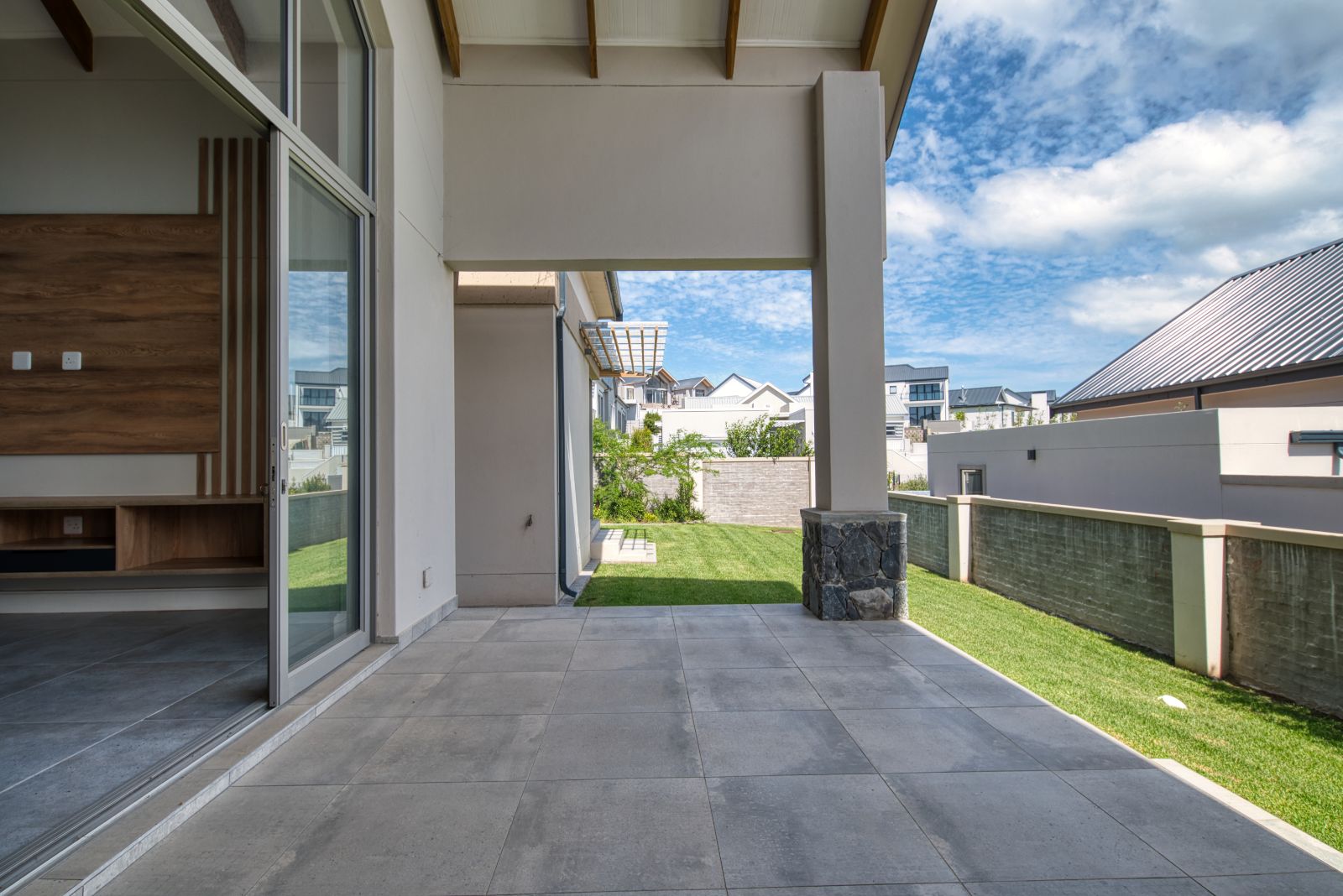 Both the TV lounge and the braai area feature large stacking doors that open out to the garden, creating a wonderful indoor-outdoor connection. To the right of the TV lounge is a state-of-the-art kitchen with premium finishes, complemented by a separate scullery and direct access from the double garage for added convenience.