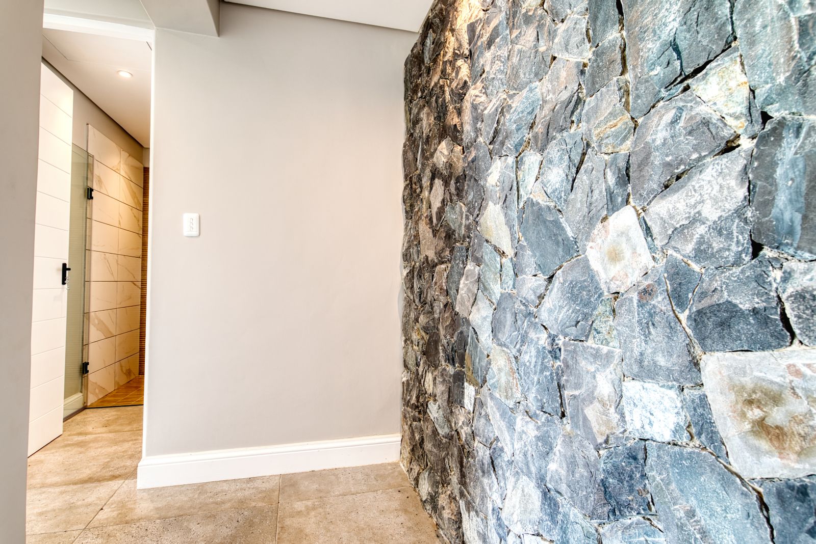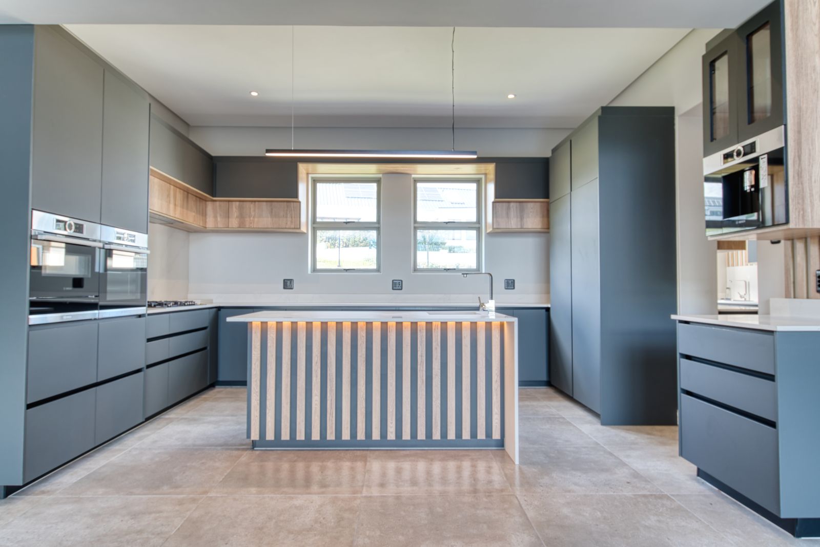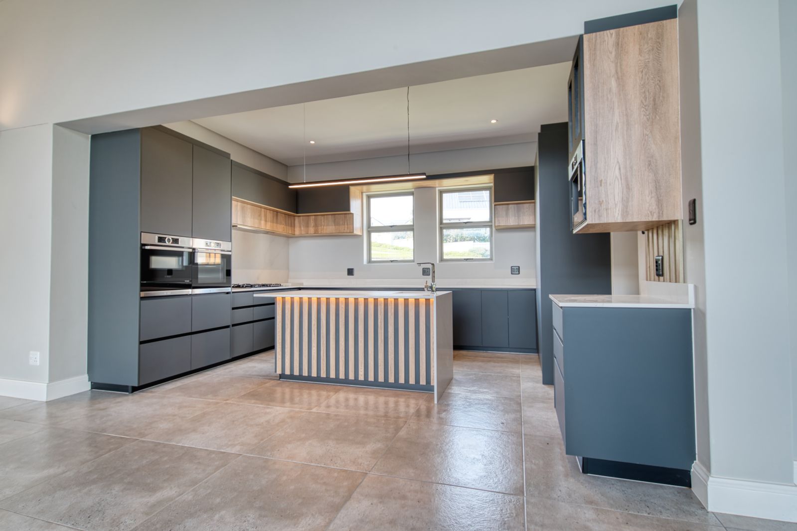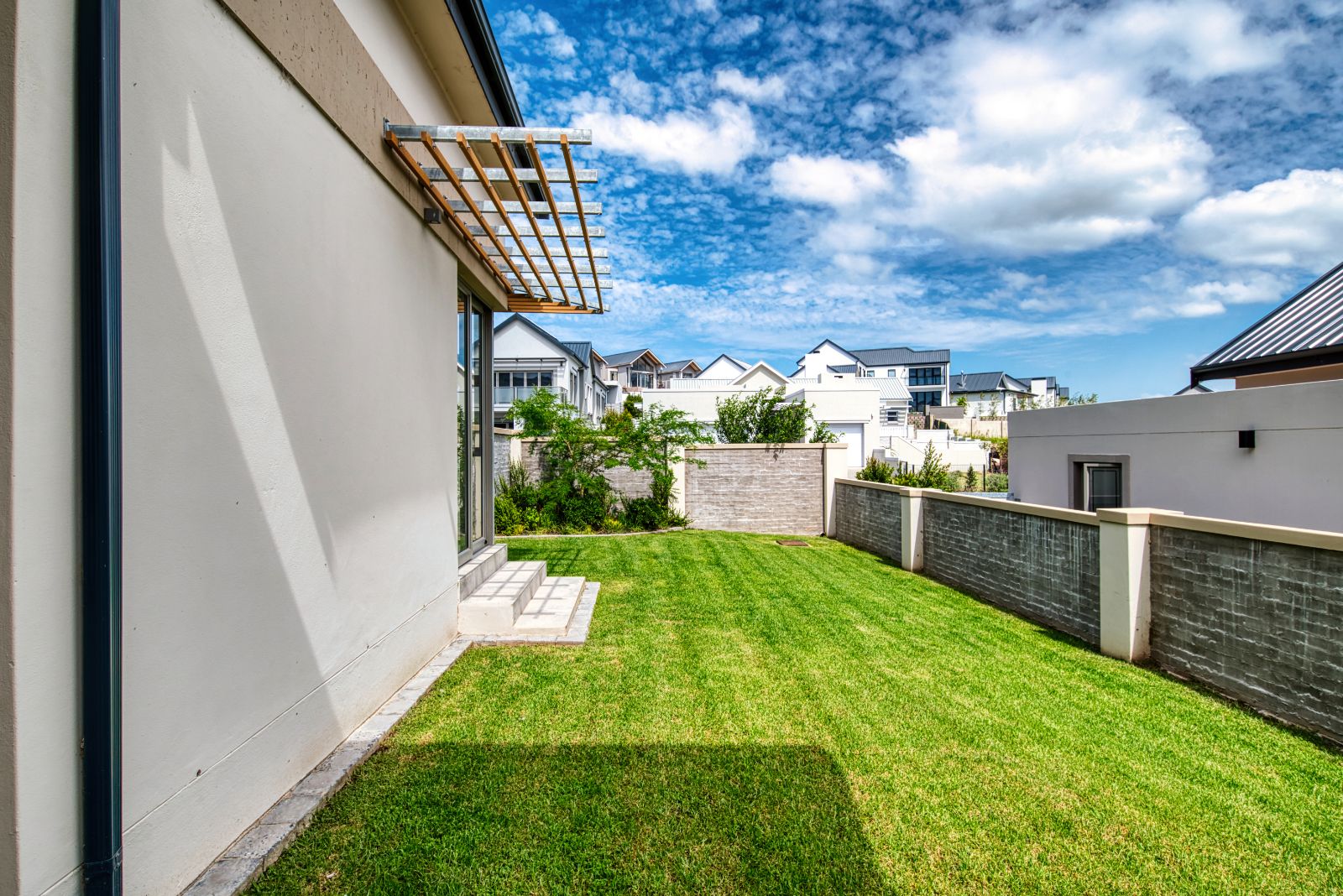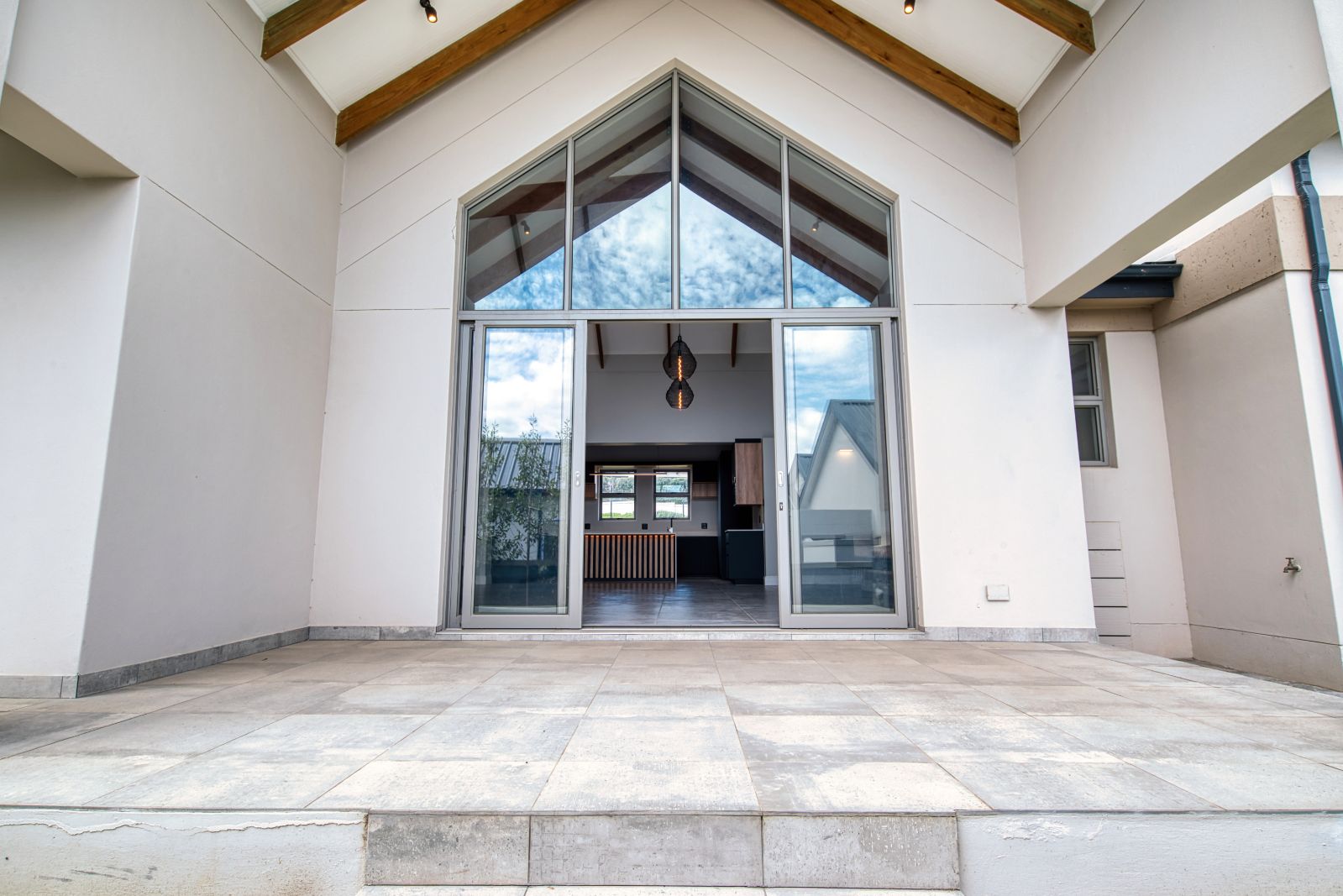 Both the TV lounge and the braai area feature large stacking doors that open out to the garden, creating a wonderful indoor-outdoor connection. To the right of the TV lounge is a state-of-the-art kitchen with premium finishes, complemented by a separate scullery and direct access from the double garage for added convenience.