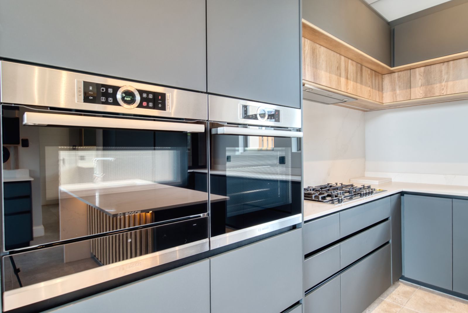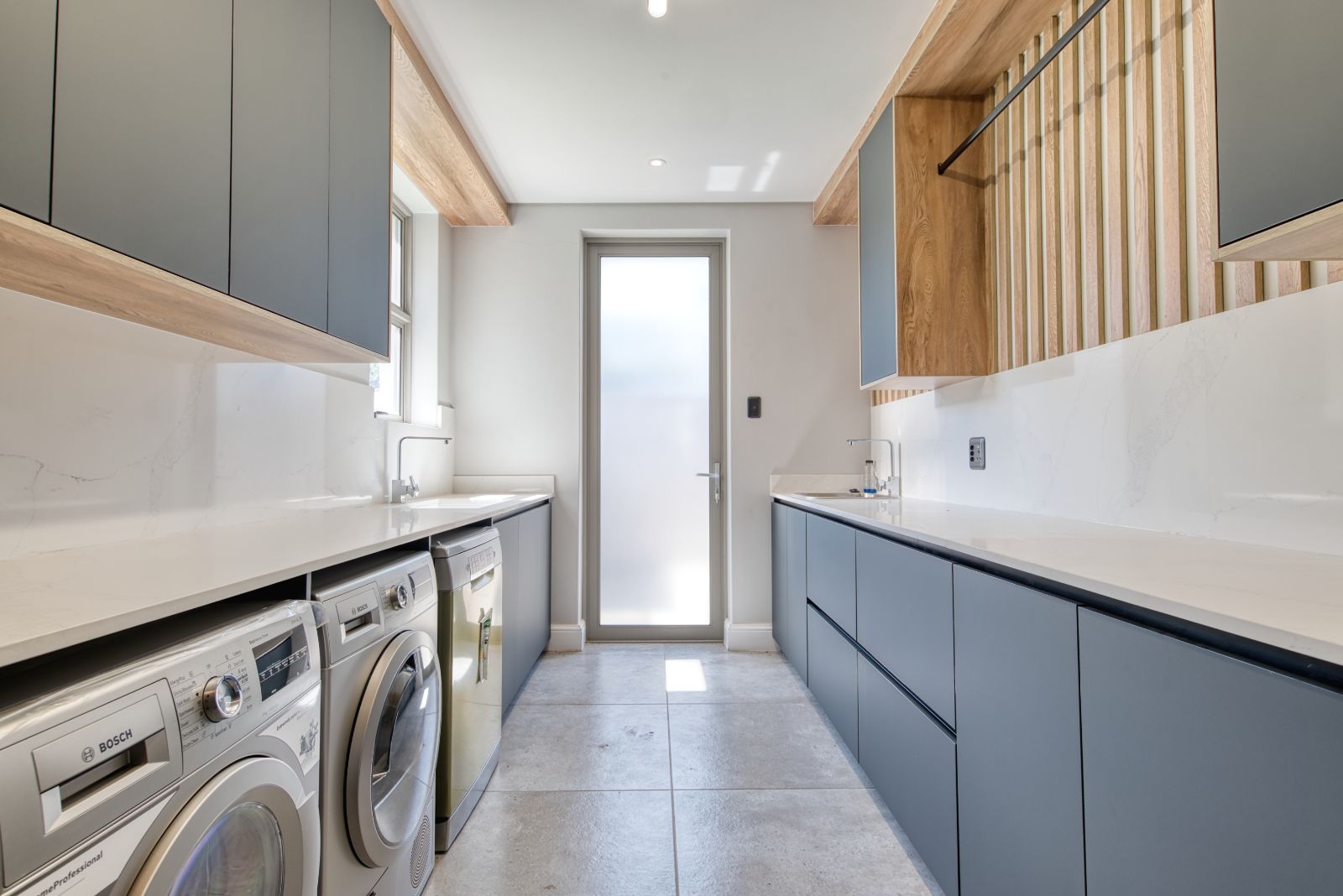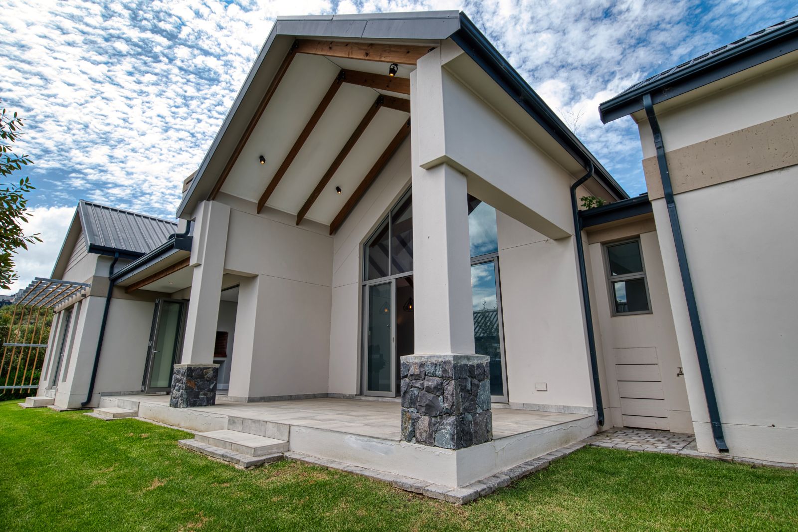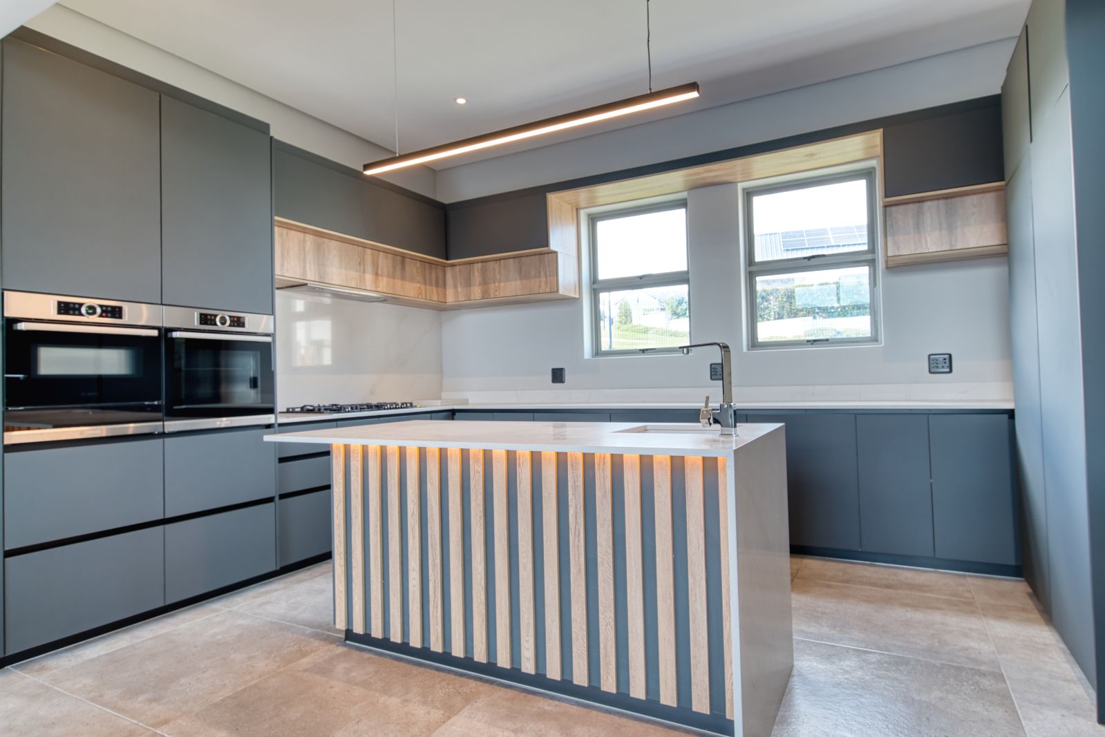 Both the TV lounge and the braai area feature large stacking doors that open out to the garden, creating a wonderful indoor-outdoor connection. To the right of the TV lounge is a state-of-the-art kitchen with premium finishes, complemented by a separate scullery and direct access from the double garage for added convenience.