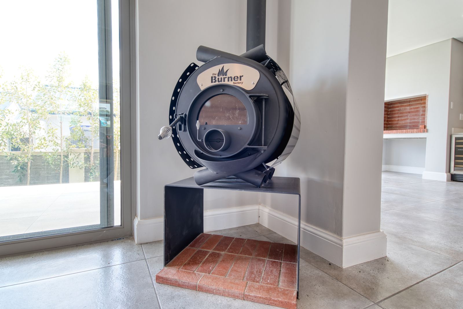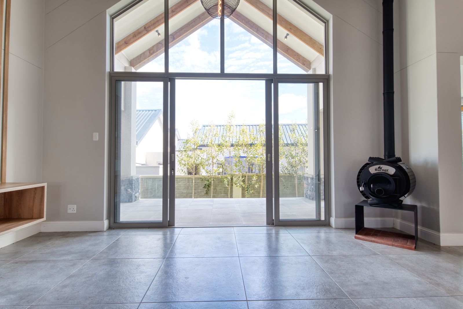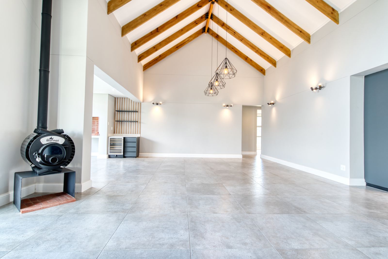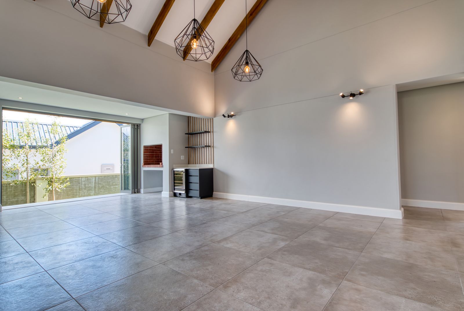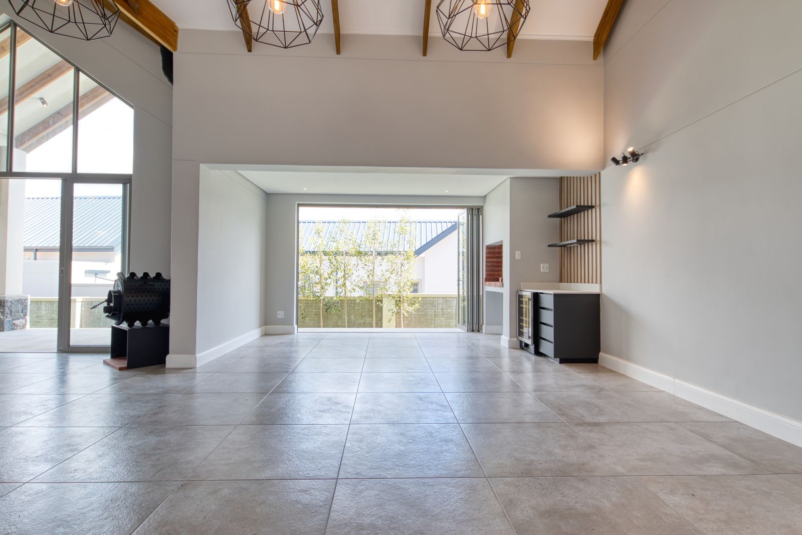 A striking large glass front door welcomes you into a spacious foyer, setting the tone for the elegant interior. From the foyer, the home opens into a generous open-plan living area. To the left is the TV lounge, complete with a fireplace, flowing seamlessly forward into the dining area with a built-in braai—ideal for relaxed family living and entertaining.