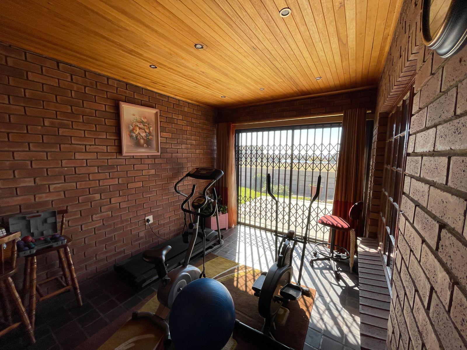 Indoor braai area with a built in braai with a sliding door leading out into a lush green garden, ideal for entertaining friends and family.