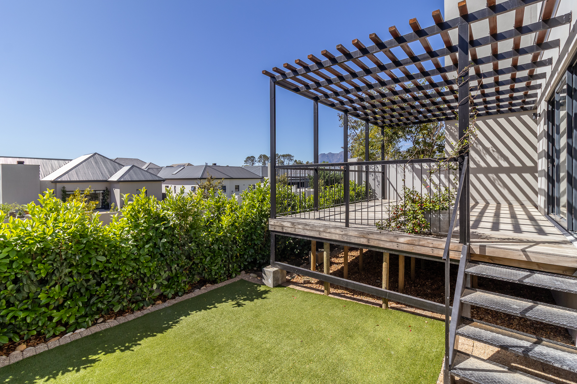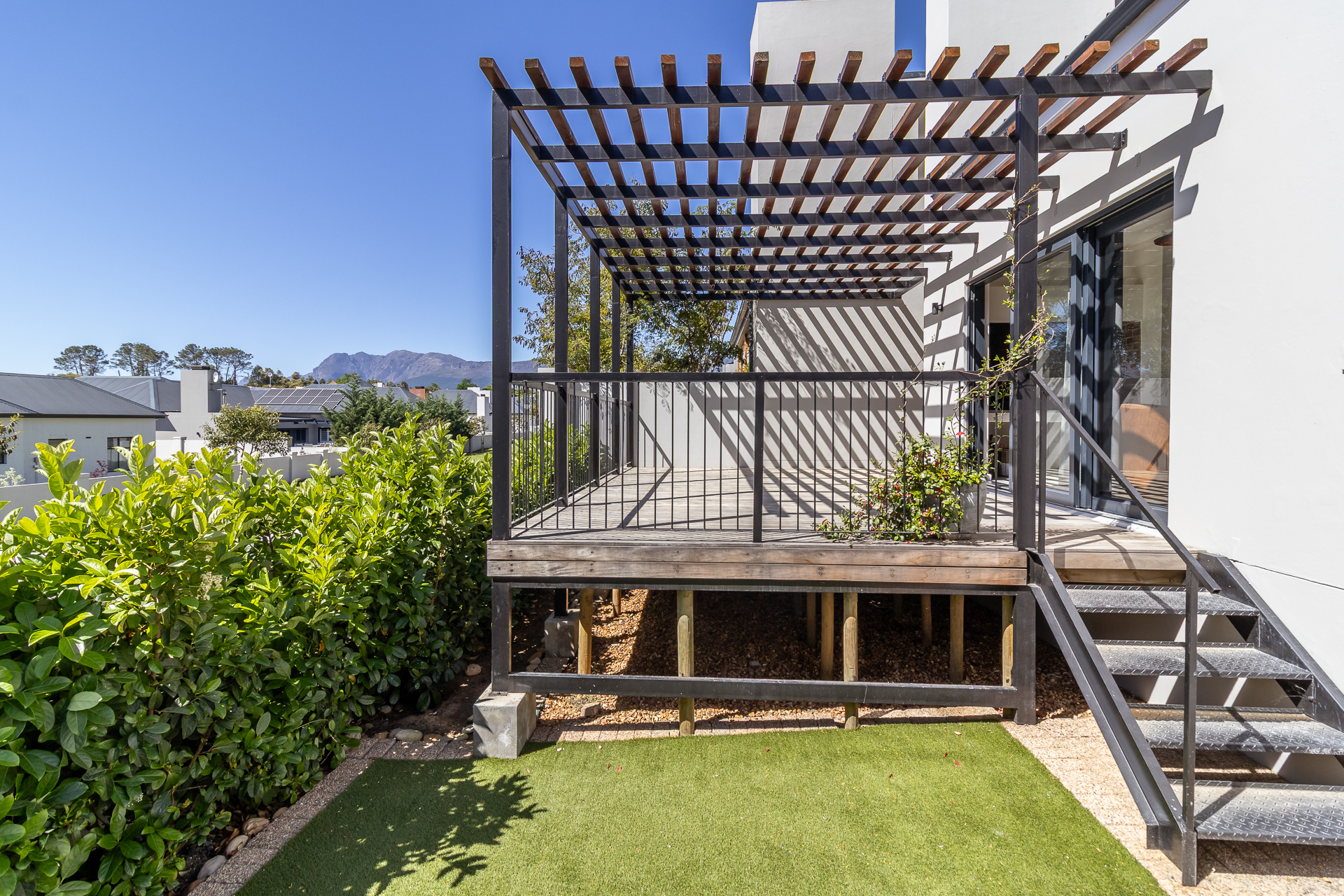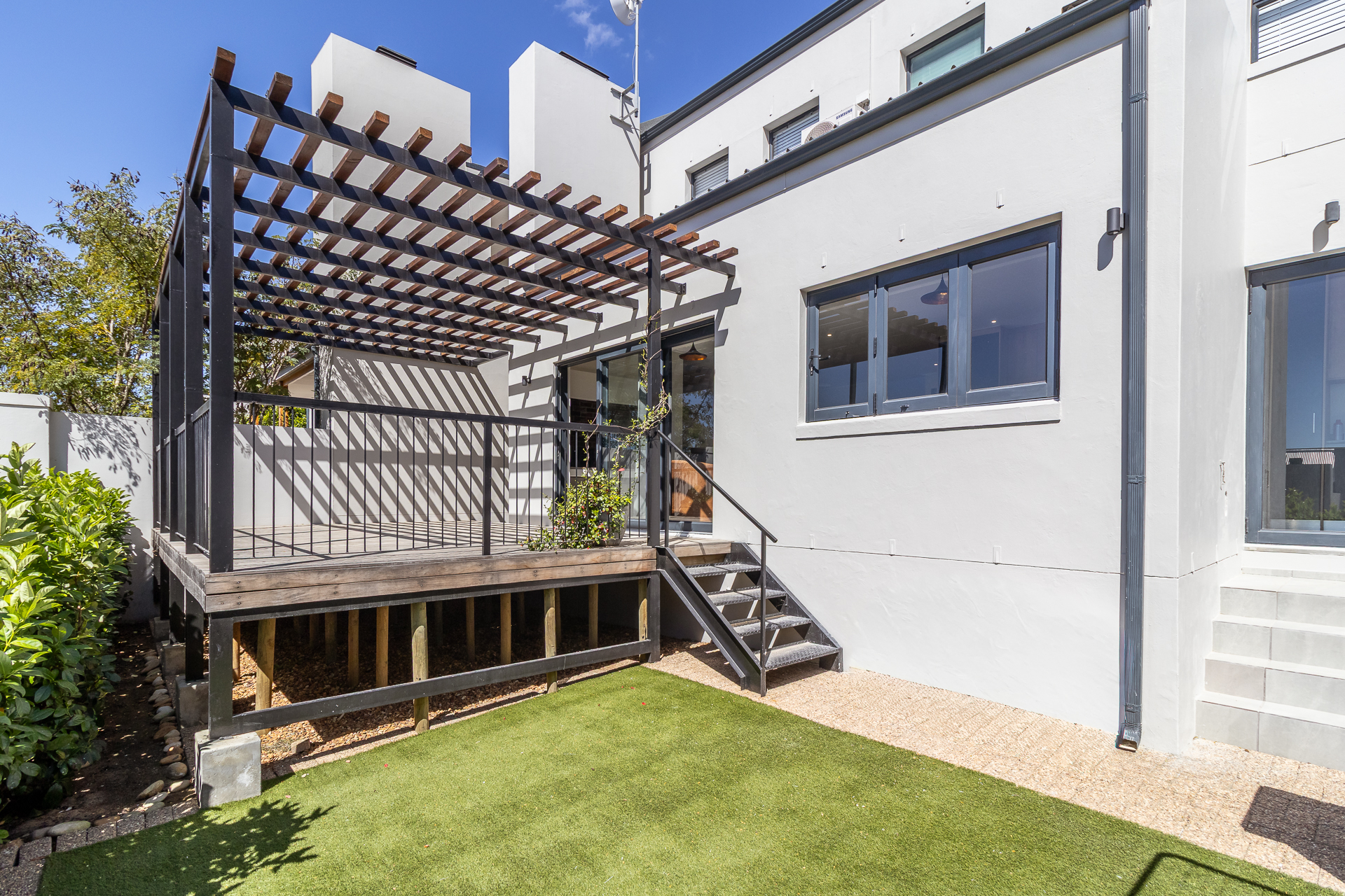 To the left of the property, a paved walkway provides added separation from the neighboring home, further enhancing your privacy. An established hedge is beginning to offer even more seclusion, making the deck a wonderful space for outdoor living.