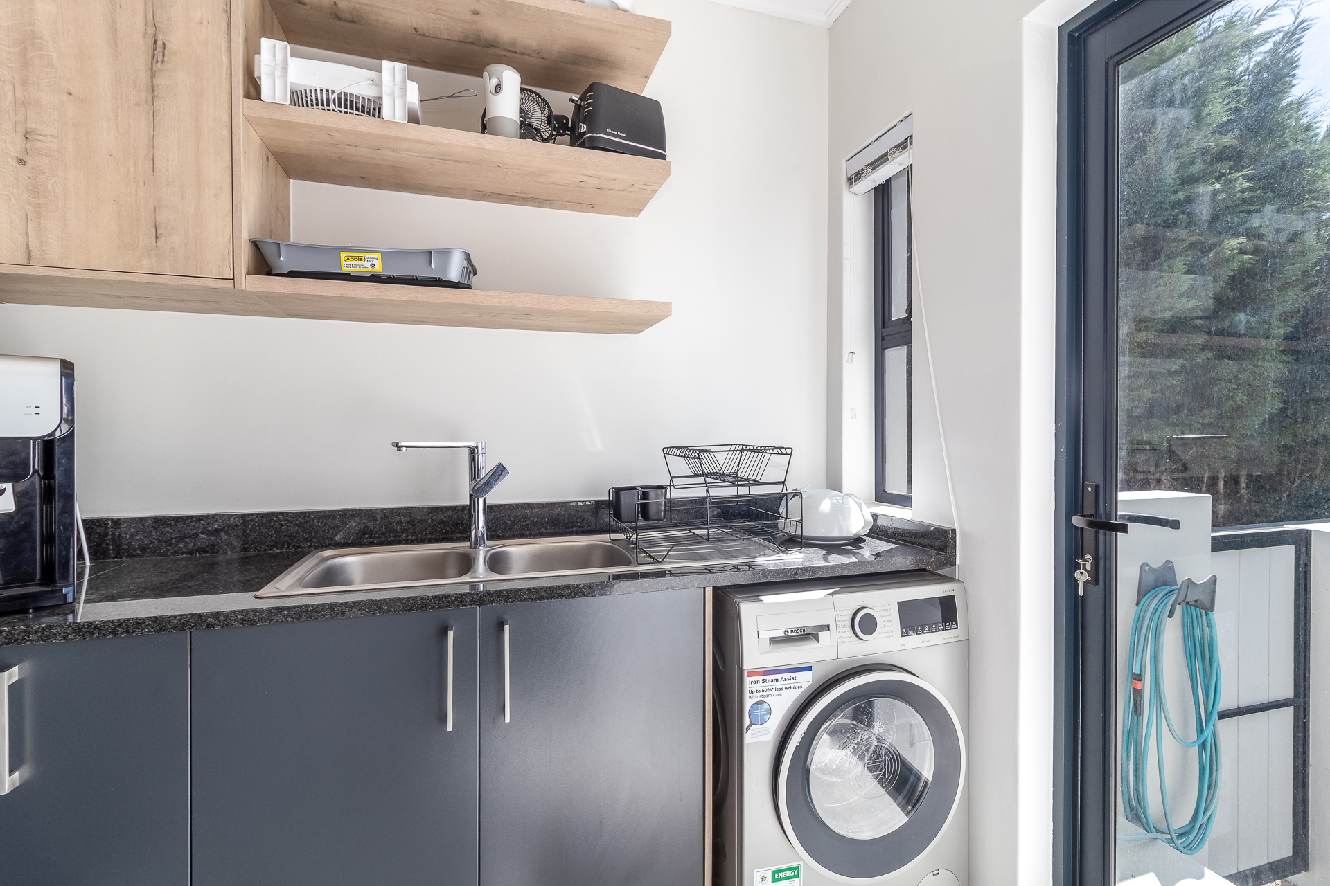The modern kitchen boasts a generous central island and a separate scullery equipped with sliding pocket doors. One of its standout features is the stackable aluminum windows that open up to the garden, enhancing the indoor-outdoor flow. Additionally, stackable doors lead out to a sizable wooden deck complete with a pergola and space for a small splash pool on the left. A small stream bordering the property contributes to a remarkable sense of openness and tranquility.