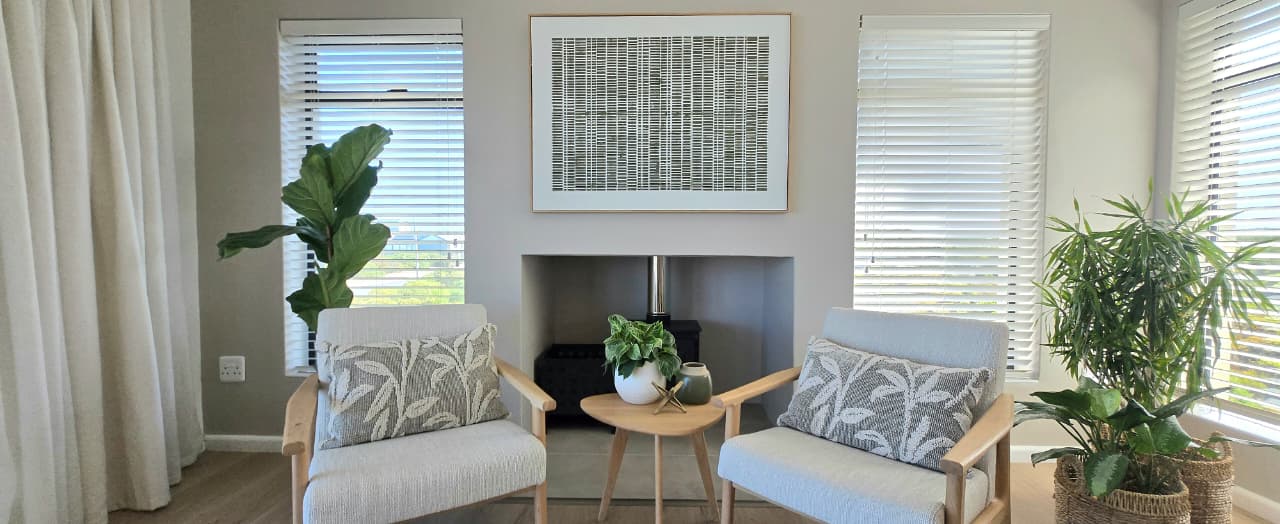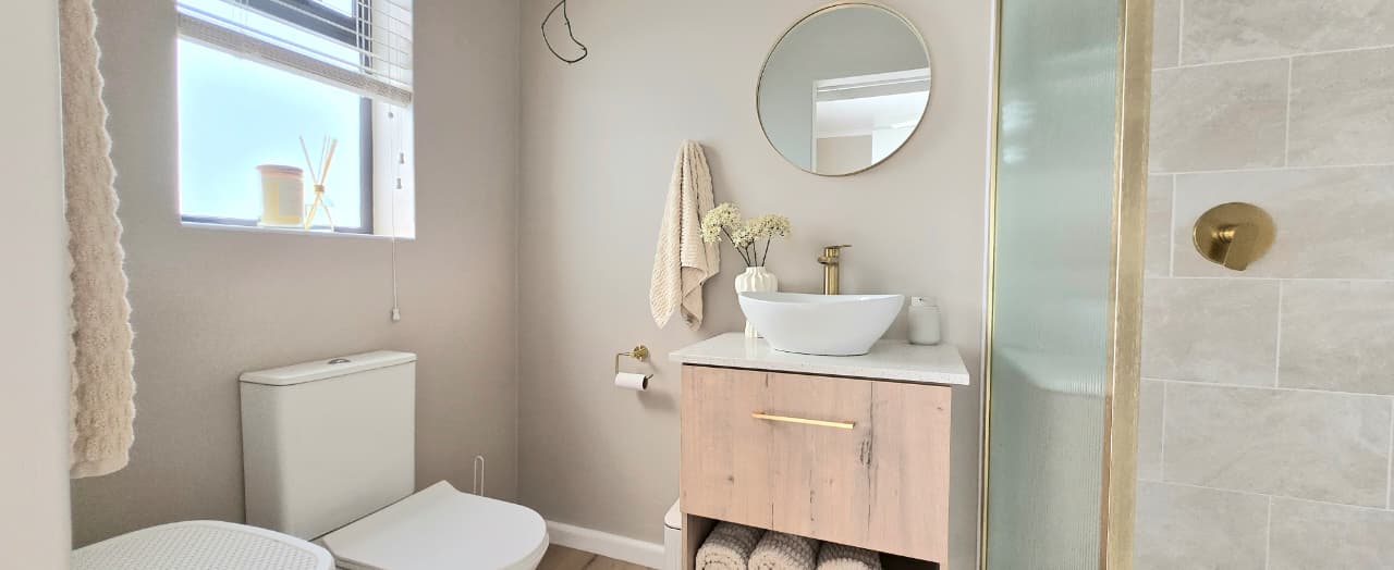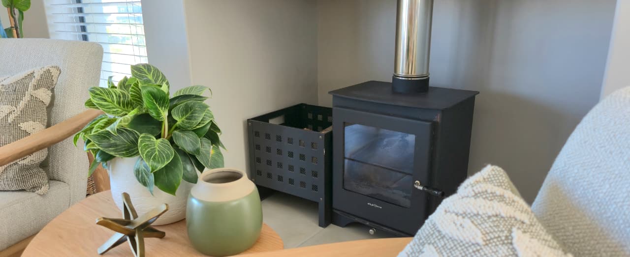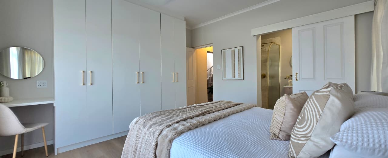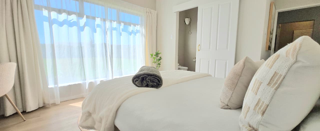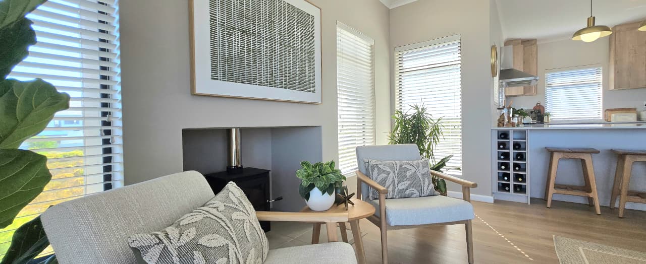 The upper level is designed for relaxed, open-plan living. Here you’ll find a seamless kitchen, dining, and living area, complete with a wood-burning fireplace for cosy winter evenings. Sliding doors open onto a balcony with beautiful sea views, complemented by mountain vistas and fresh ocean air. The main bedroom upstairs is a true sanctuary, featuring a walk-in dressing area and a modern full en-suite bathroom with both bath and shower.