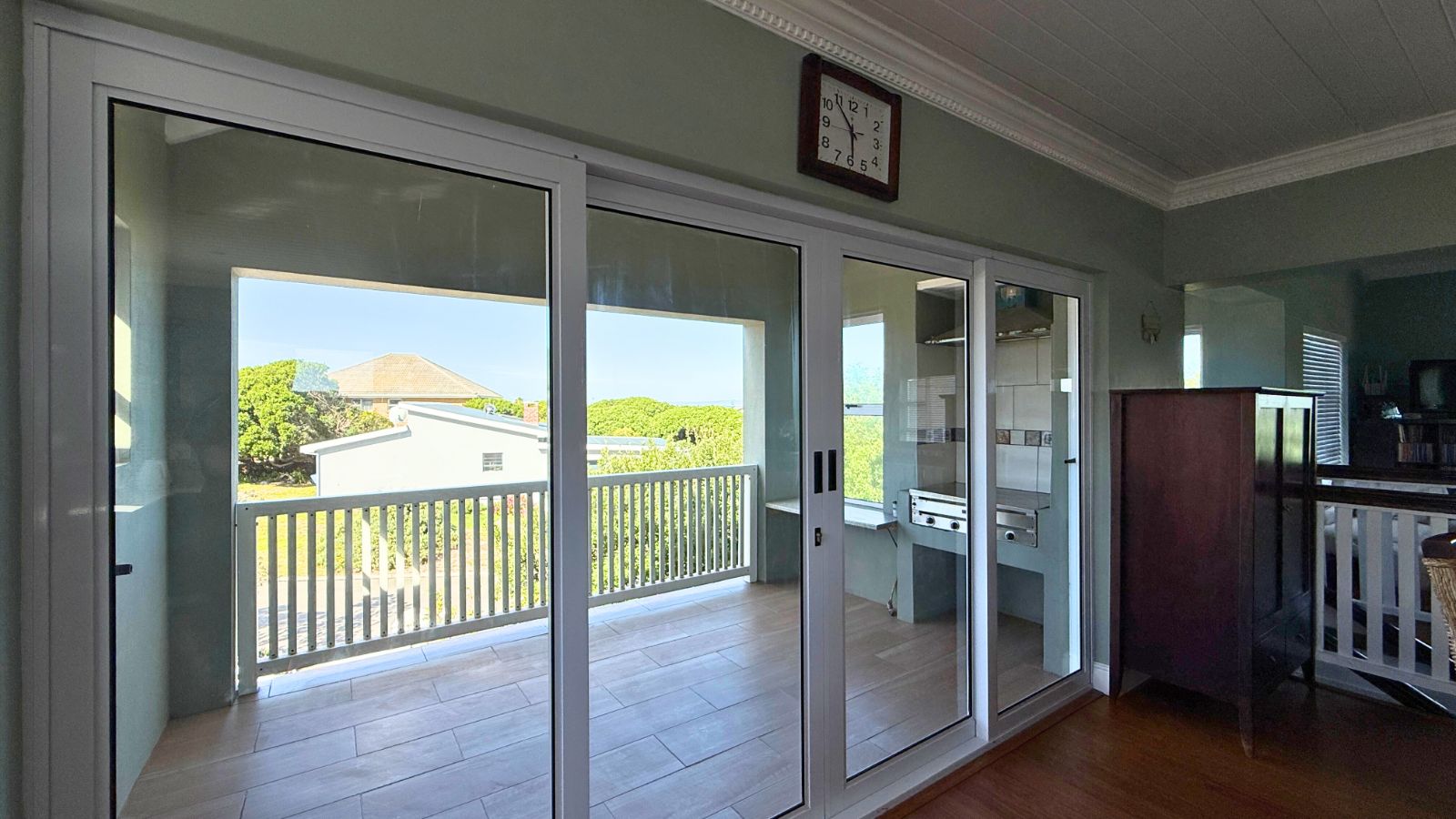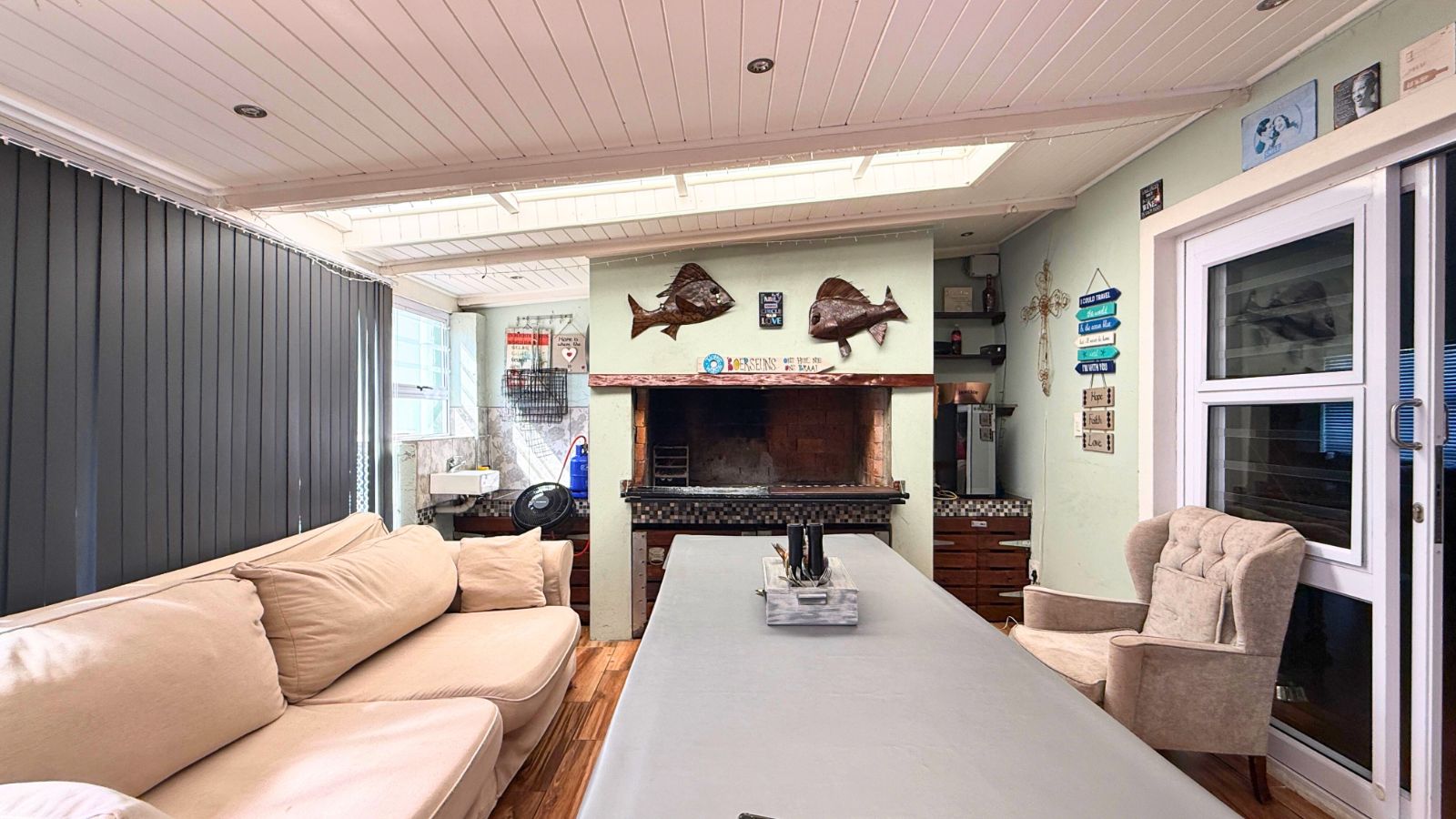 Upstairs, a second full living space features a second fitted kitchen with granite tops, a dining area, a lounge, and a large en suite bedroom, which also includes a heated towel rail. The upstairs lounge boasts a striking Raku Fired Ceramic Fireplace, adding a unique artistic element. The undercover balcony with a built-in gas braai and captivating sea views leads off the upstairs kitchen, offering a perfect second entertainment zone.