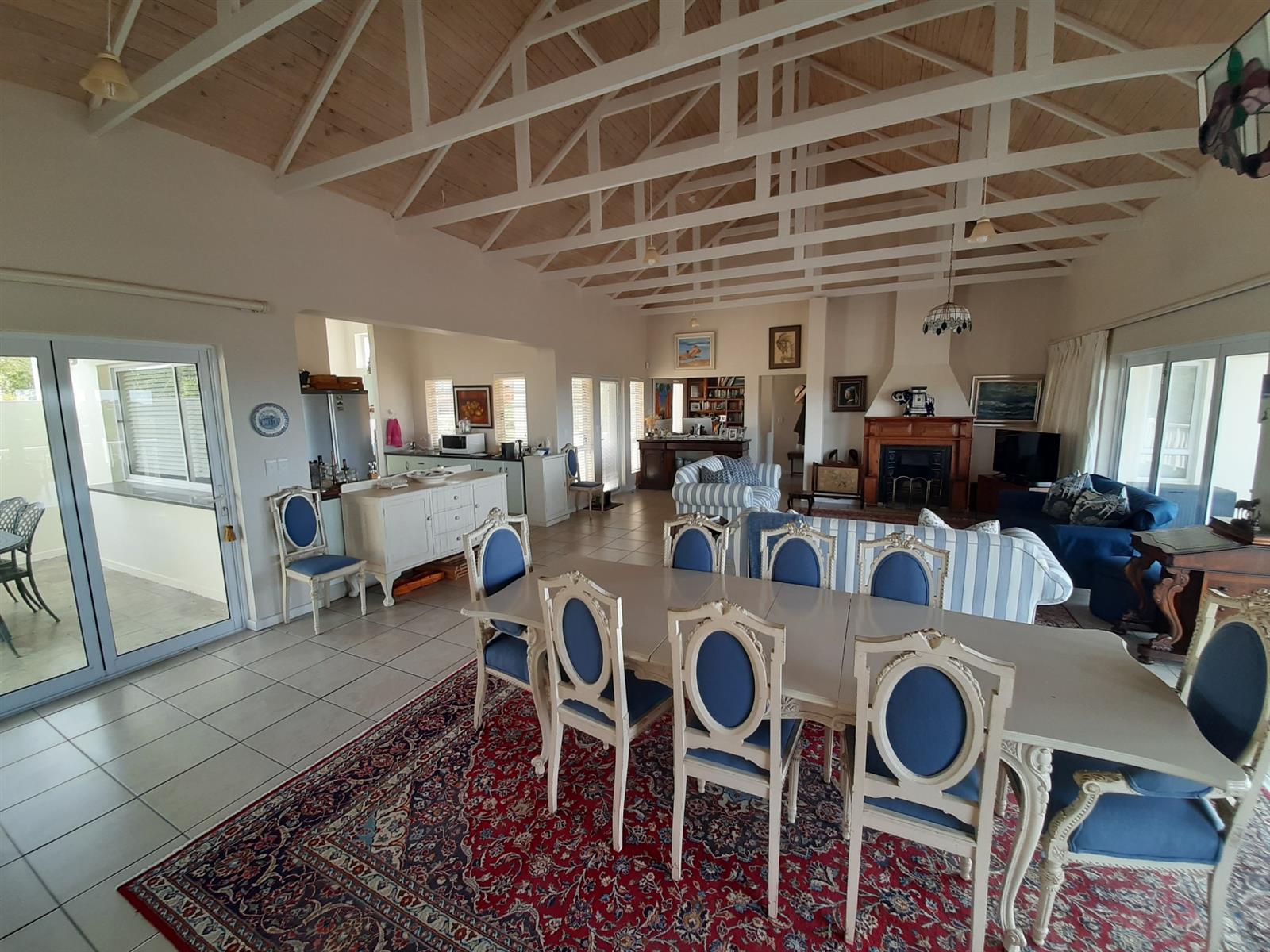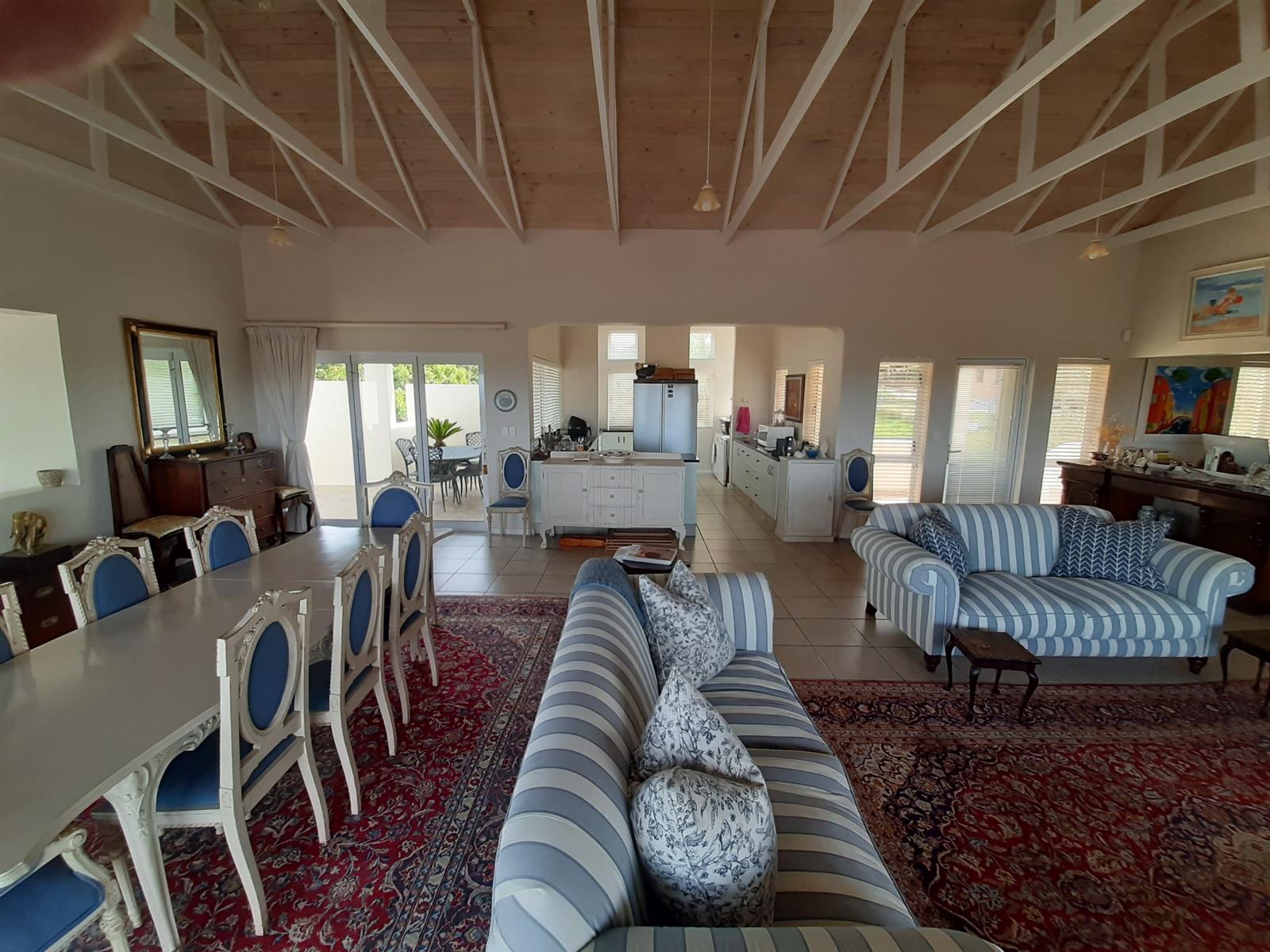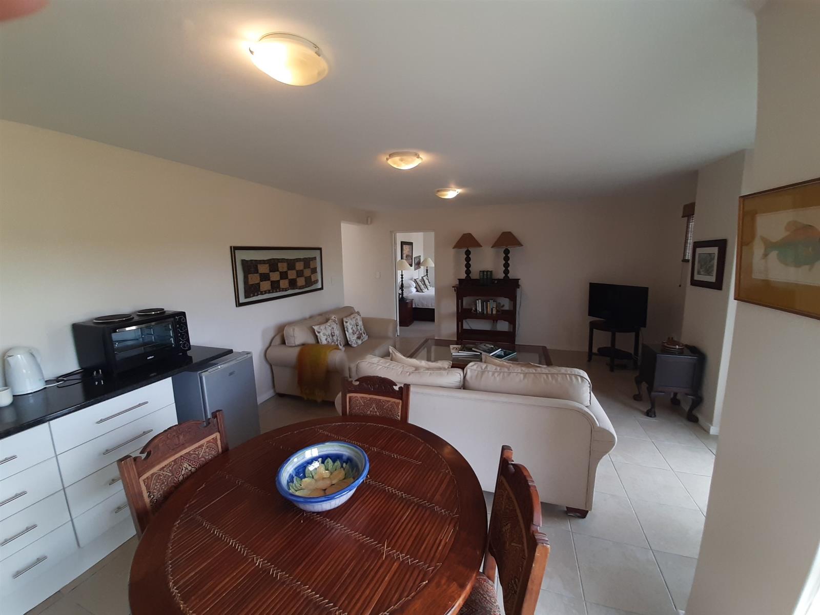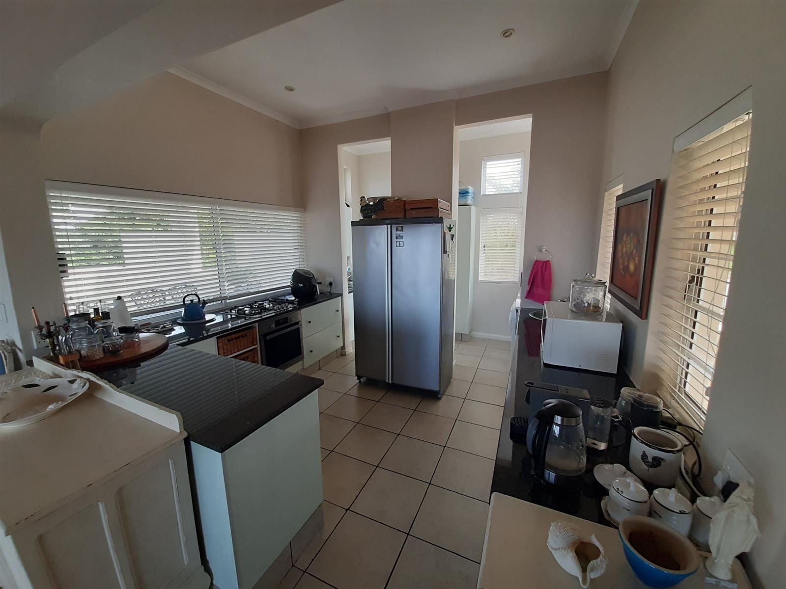 Adjacent to the dining area is a special nook, perfect for enjoying a braai while still being part of the action. The kitchen, though compact, is well-equipped and leads into an entertainment area, with a separate small scullery and laundry space for added convenience.