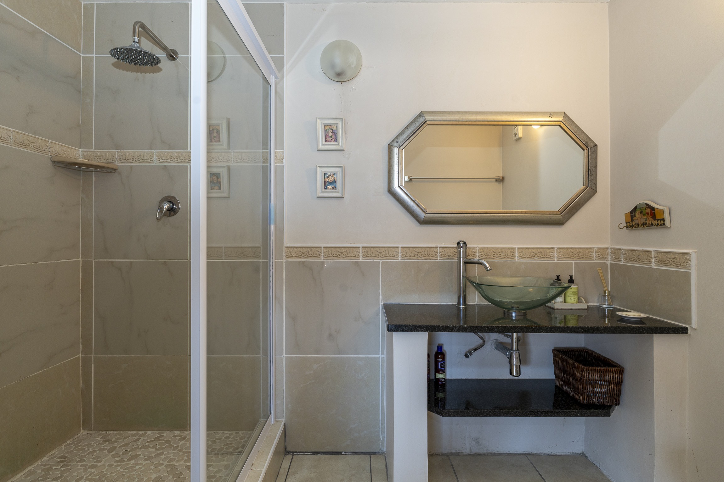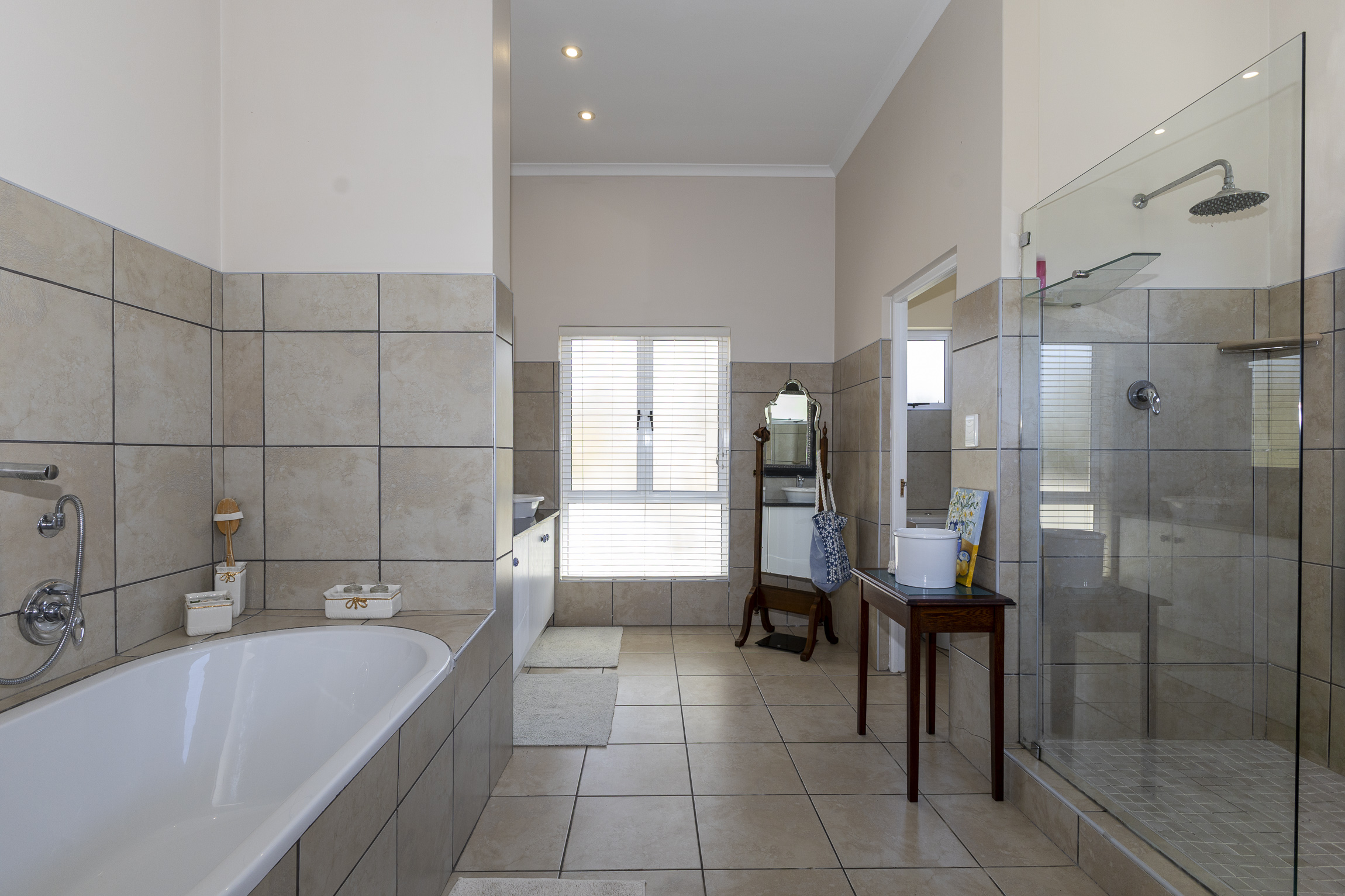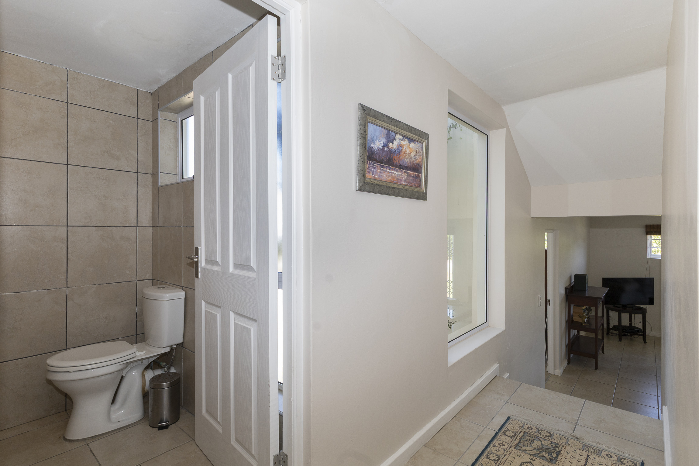 Also on this level is a private study, two well appointed bedrooms sharing a full bathroom, and the principal suite, a serene retreat with deck access and a luxurious full en-suite bathroom. The lower level offers versatility and comfort, including a guest toilet, internal access to a double garage with a storeroom, and an inverter backup system with 8 solar panels. A spacious en-suite bedroom opens to the outdoors, while an additional area provides the potential to be transformed into a self-contained flatlet with a living area, kitchenette, and bedroom, ideal for guests or rental income.