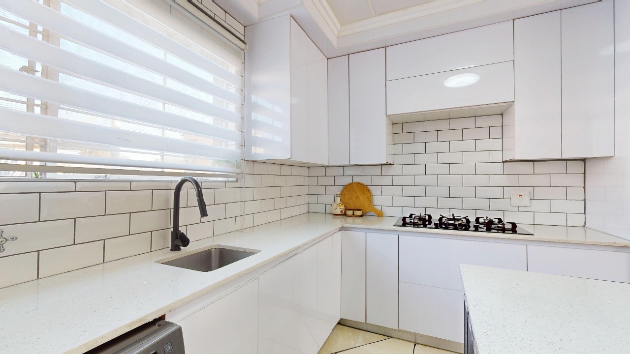 -Kitchen featuring sleek blinds, beautifully tiled walls, a centre island, 5-plate gas hob, eye level oven and space for fridge and two water appliances