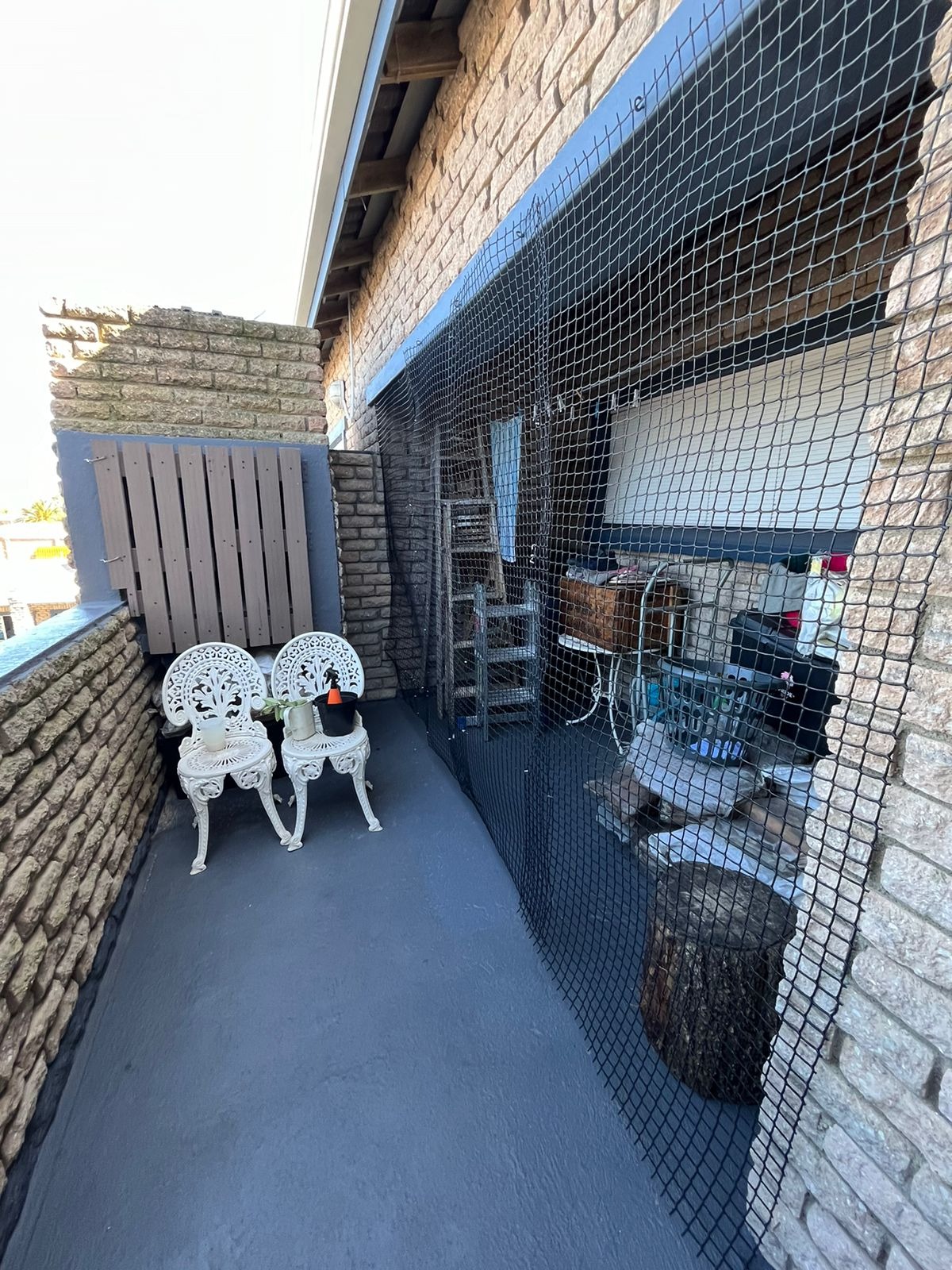 There is a balcony with a braai and undercover seating area (now being used as storage) and distant sea views.