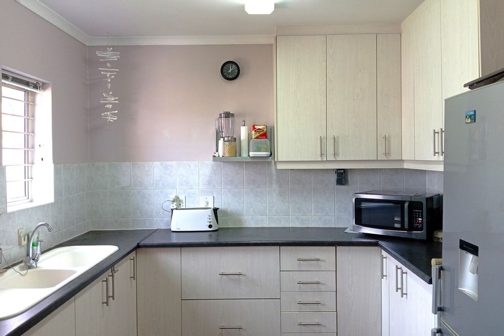 An open-plan layout with dining room leads to two bedrooms with two bathrooms(1 en-suite), both with windows to the north facing the mountain. The third bedroom is located at the back of the property with an en-suite bathroom and direct access to the covered veranda and garage.