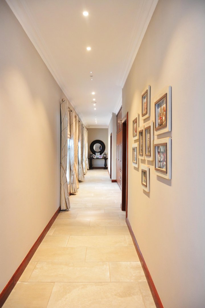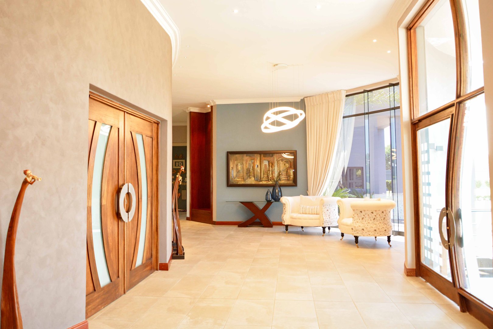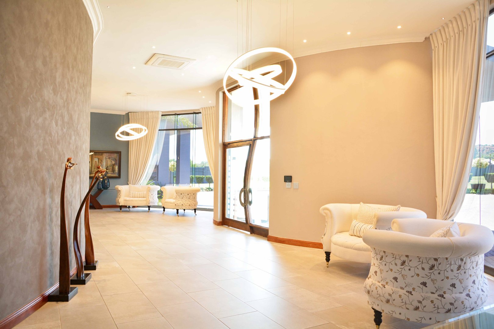 This luxurious four-bedroom family home combines striking architectural design with an immaculate, light-filled layout. From the moment you enter the grand double-volume entrance hall-framed by glass doors and large windows-you're welcomed into a space filled with natural light and centred around a beautiful chandelier that sets the tone for the rest of the home. The home's design makes use of light and neutral tones, enhancing the sense of space and calm throughout.