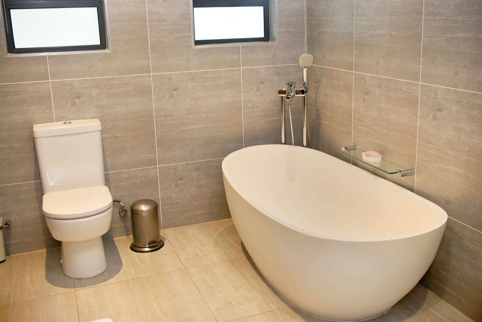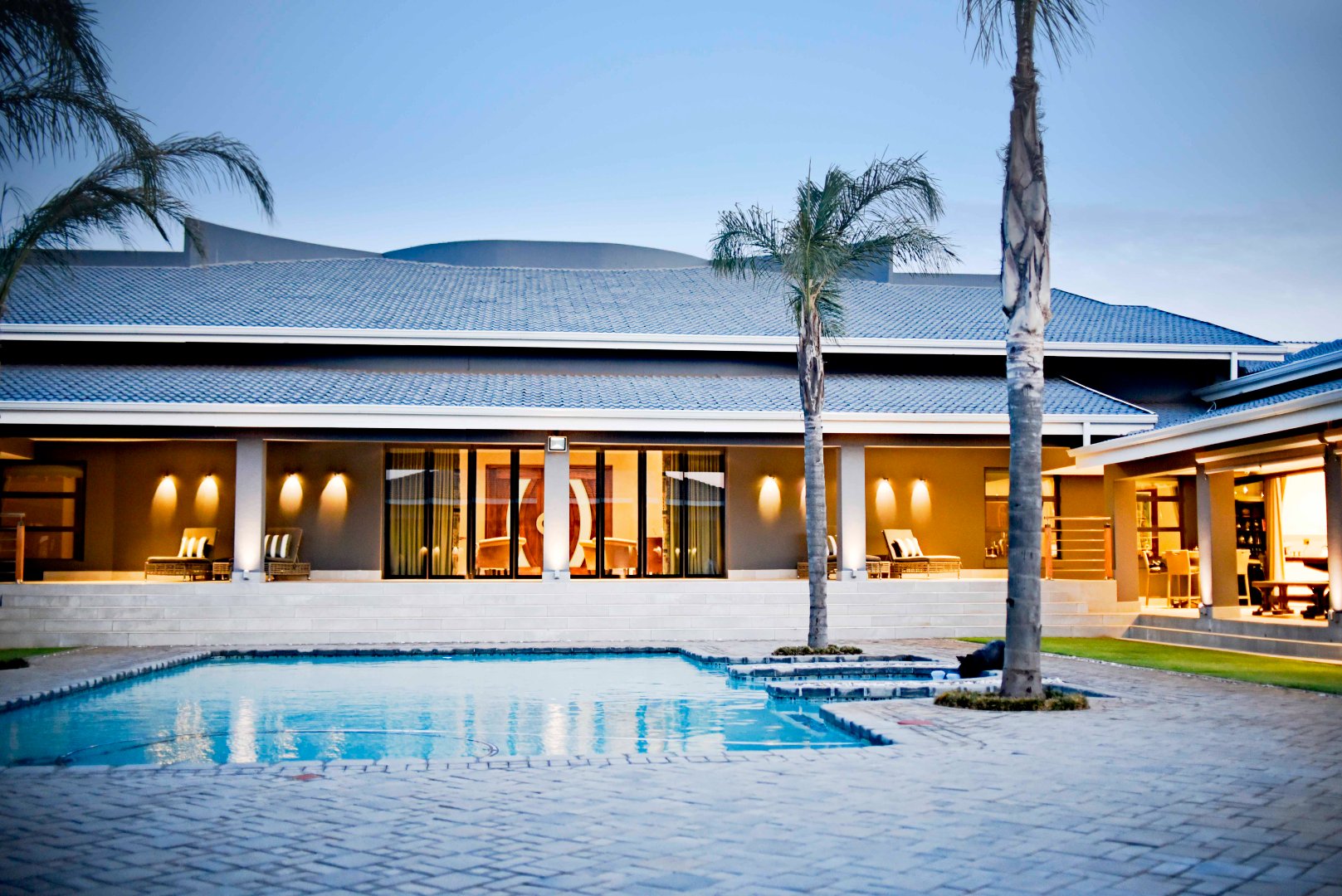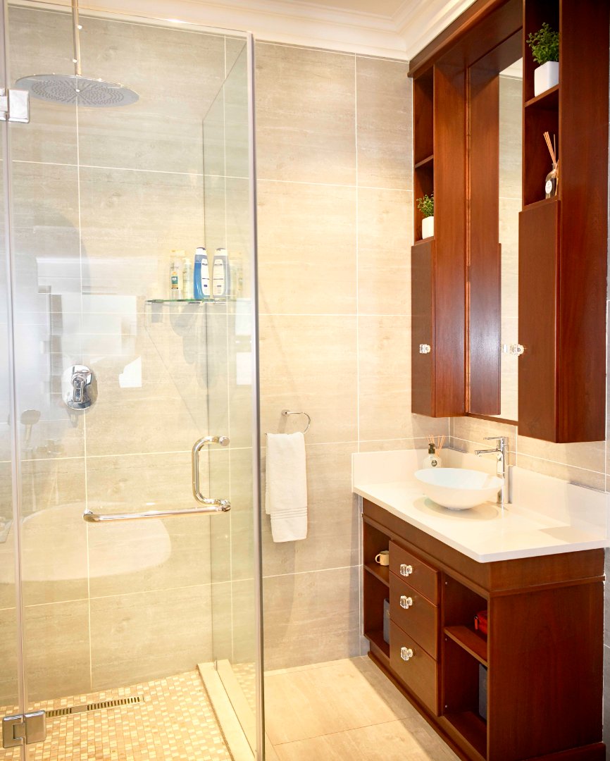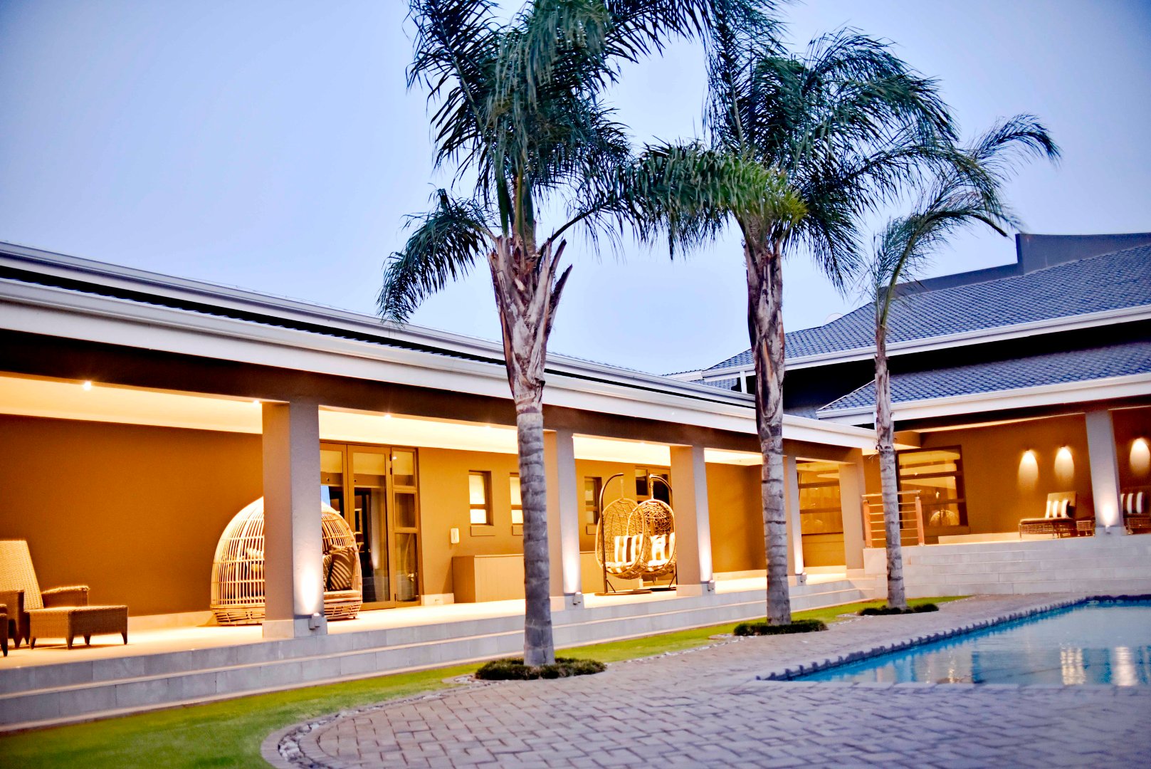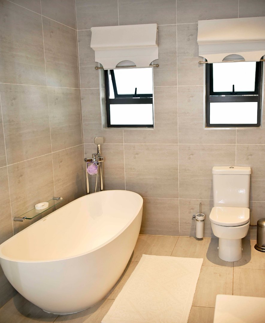 The main bedroom is spacious and complete with a walk-in dressing room featuring the finest finishes and a luxurious en-suite bathroom with a shower, freestanding bath, and double vanity with storage. The fourth bedroom also includes built-in cupboards and has its own en-suite bathroom with a bath, frameless shower, and a dubble vanity. All four bedrooms openens up to the swimming pool area that runs along the garden-facing side of the home, creating a strong indoor-outdoor connection and linking the rooms together.