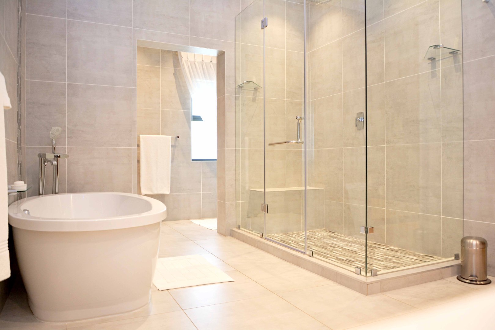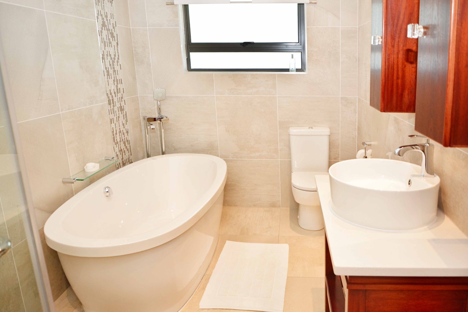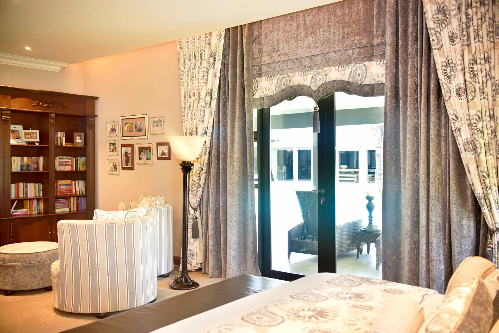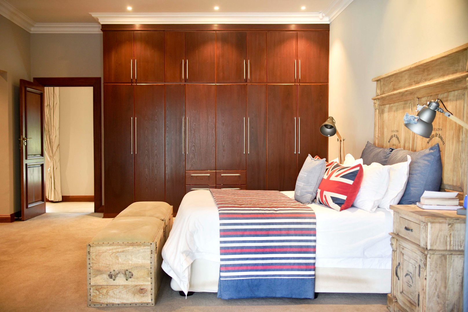 The main bedroom is spacious and complete with a walk-in dressing room featuring the finest finishes and a luxurious en-suite bathroom with a shower, freestanding bath, and double vanity with storage. The fourth bedroom also includes built-in cupboards and has its own en-suite bathroom with a bath, frameless shower, and a dubble vanity. All four bedrooms openens up to the swimming pool area that runs along the garden-facing side of the home, creating a strong indoor-outdoor connection and linking the rooms together.
