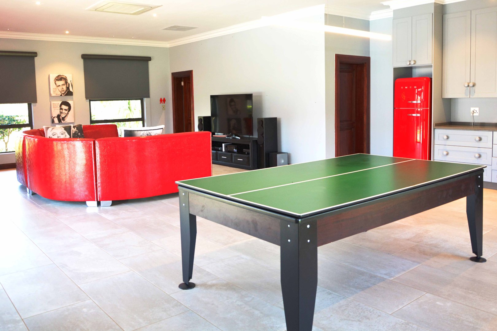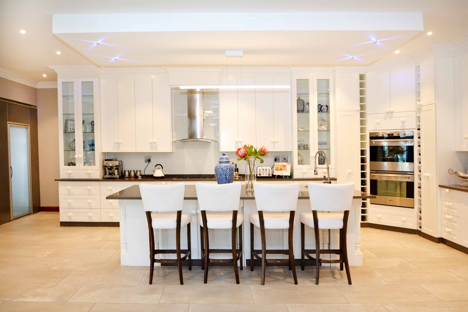 The kitchen is both beautiful and practical, featuring a central island with an SMEG oven prep bowl and a seating area. Extensive cabinetry includes space for a double fridge, a coffee station. A large walk-in pantry and a separate, well-sized scullery/laundry add to the convenience of the space. To top it off, it has his very own walk-in fridge to make catering a breeze.