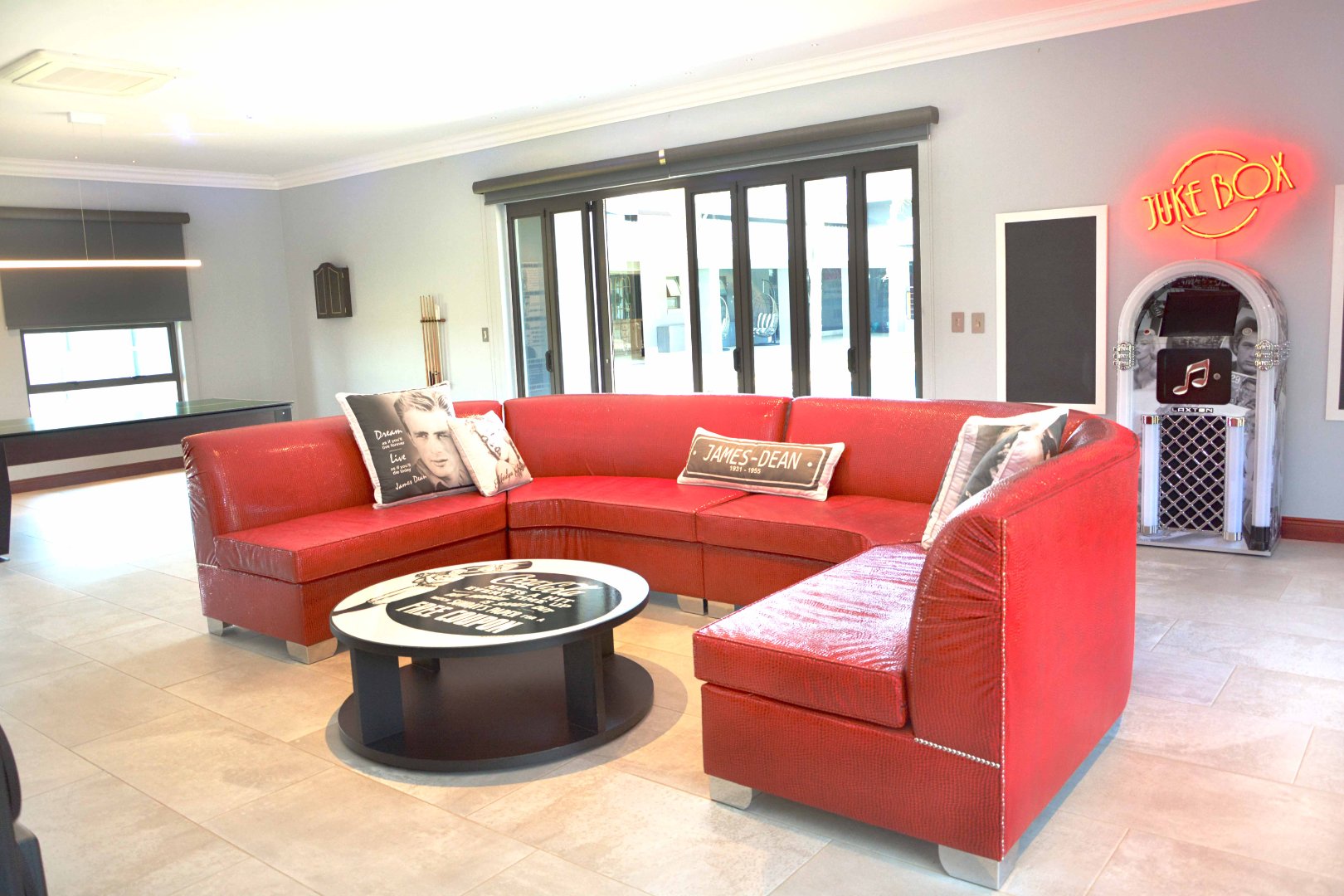The entrance flows into a generous open-plan living space that brings together the designer kitchen, dining area, expansive lounge with a gas fireplace, and a stylish bar with a dedicated seating area.