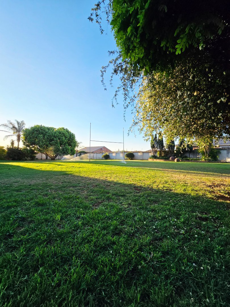 Expansive garden with rugby pole, cricket net, and sparkling solar-heated swimming pool.
