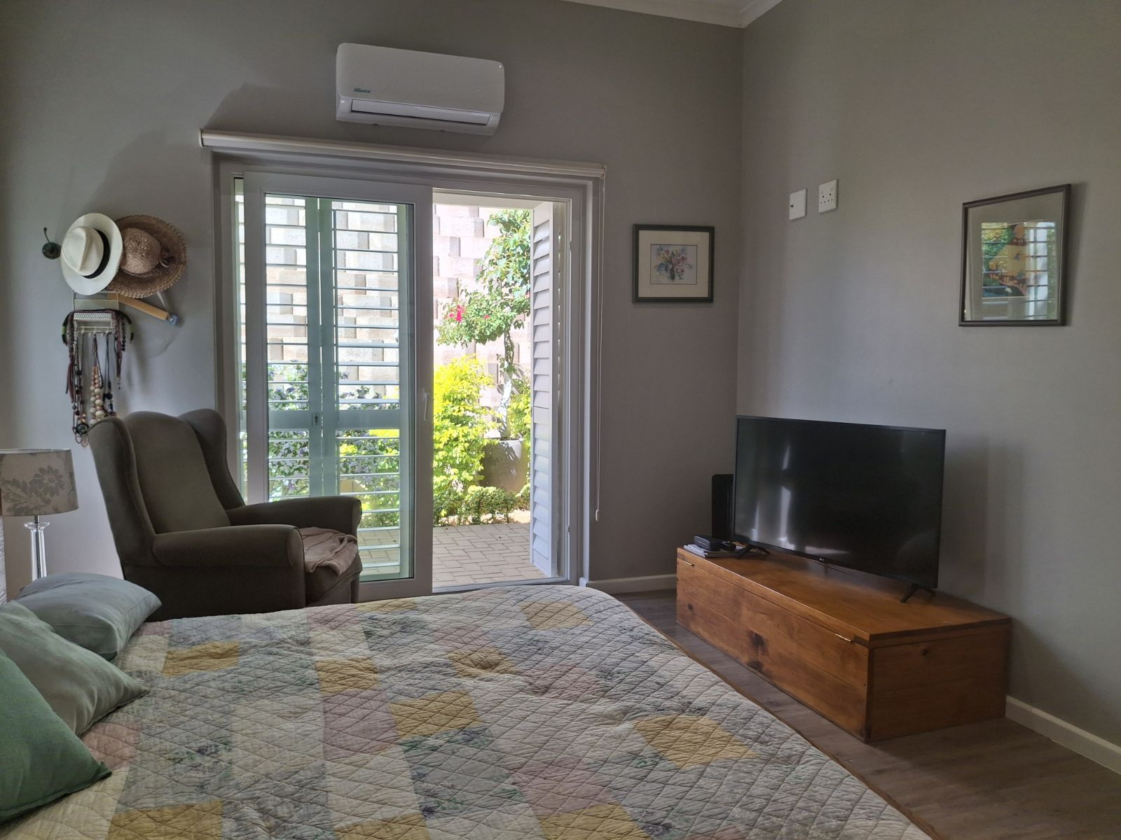 All three bedrooms include built-in cupboards, and the hallway offers a linen cupboard for extra storage. The main bedroom opens onto the garden through a sliding door, creating a peaceful retreat with an air-conditioner for year-round comfort.