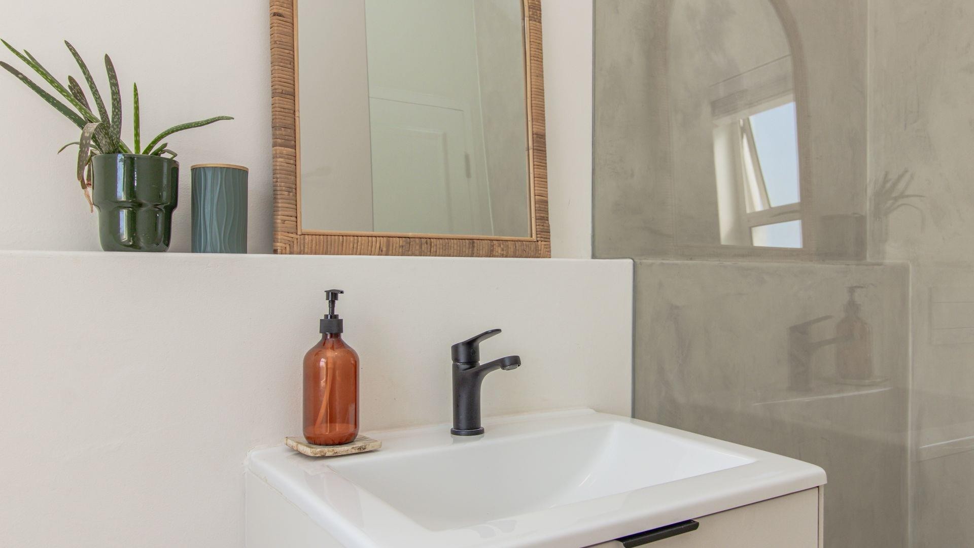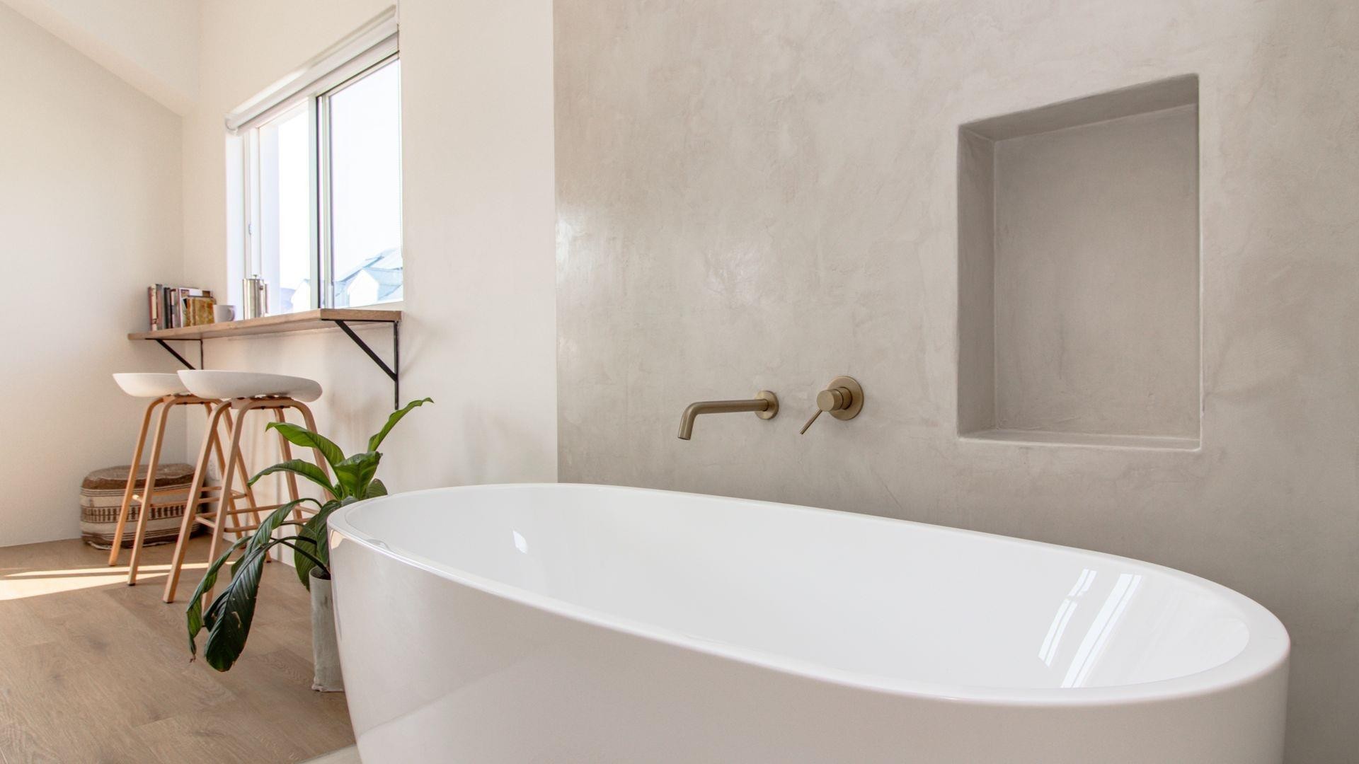 Two en-suite bathrooms, including a main suite with double vanities, candle nook, and bookshelf space