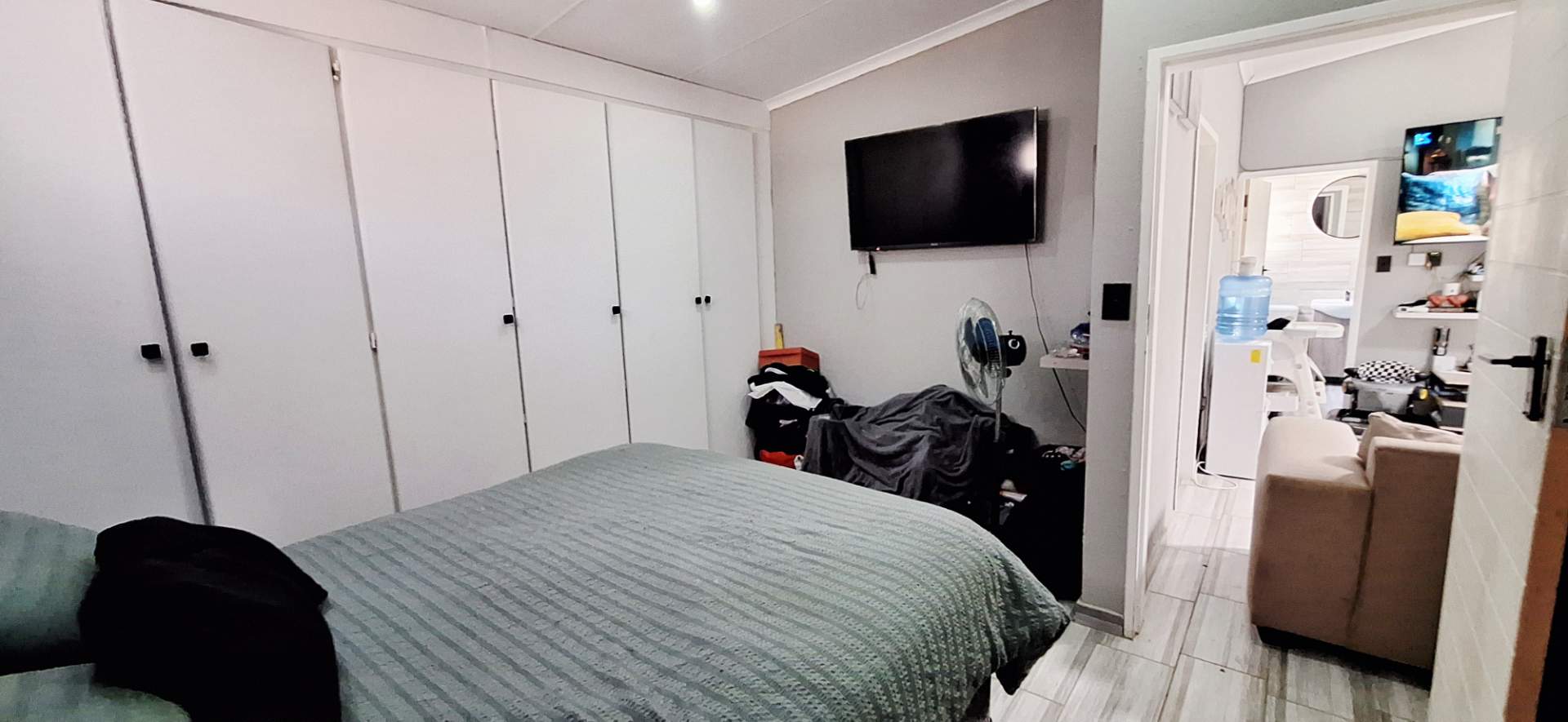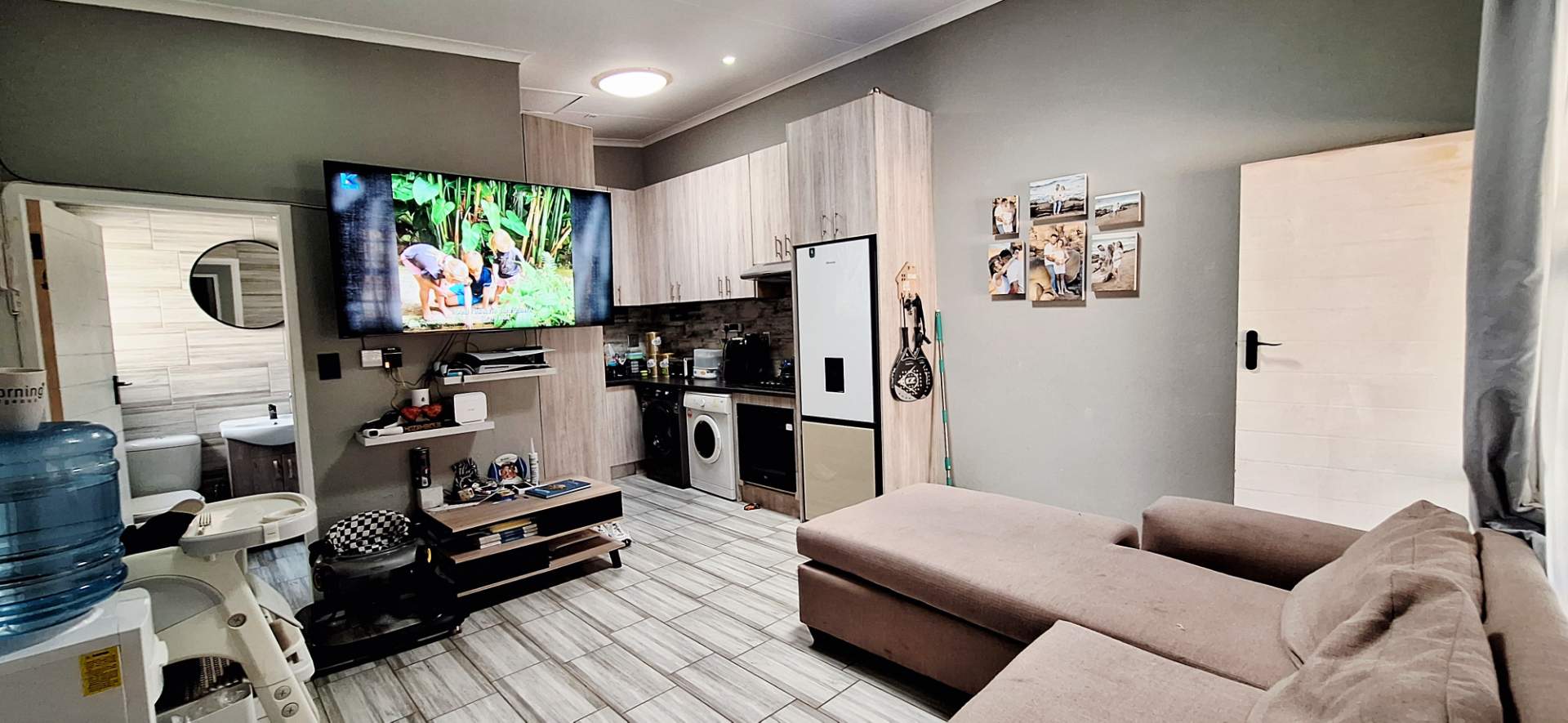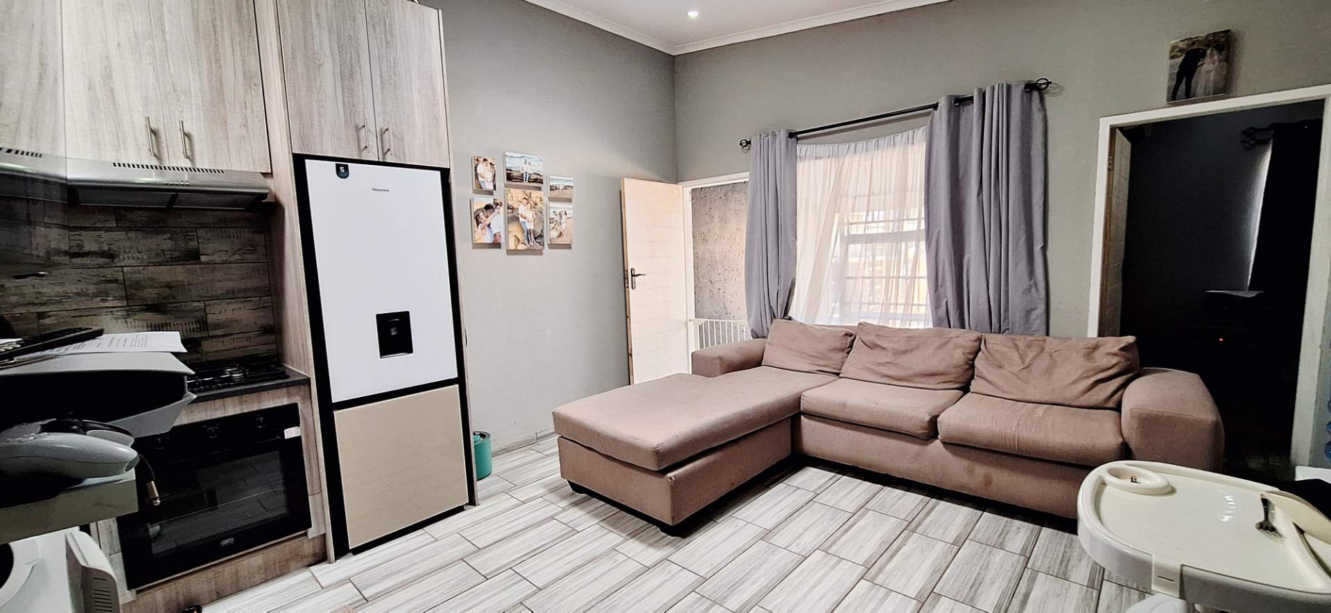 Step inside to find a home tiled throughout with contemporary tiles, creating a seamless and stylish flow. The open-plan lounge and kitchen area is designed with modern finishes and provides ample cupboard space, featuring a gas stove for the culinary enthusiast. The bathroom is tastefully appointed with modern fixtures including a loo, basin, and shower, complemented by an energy-efficient solar geyser.