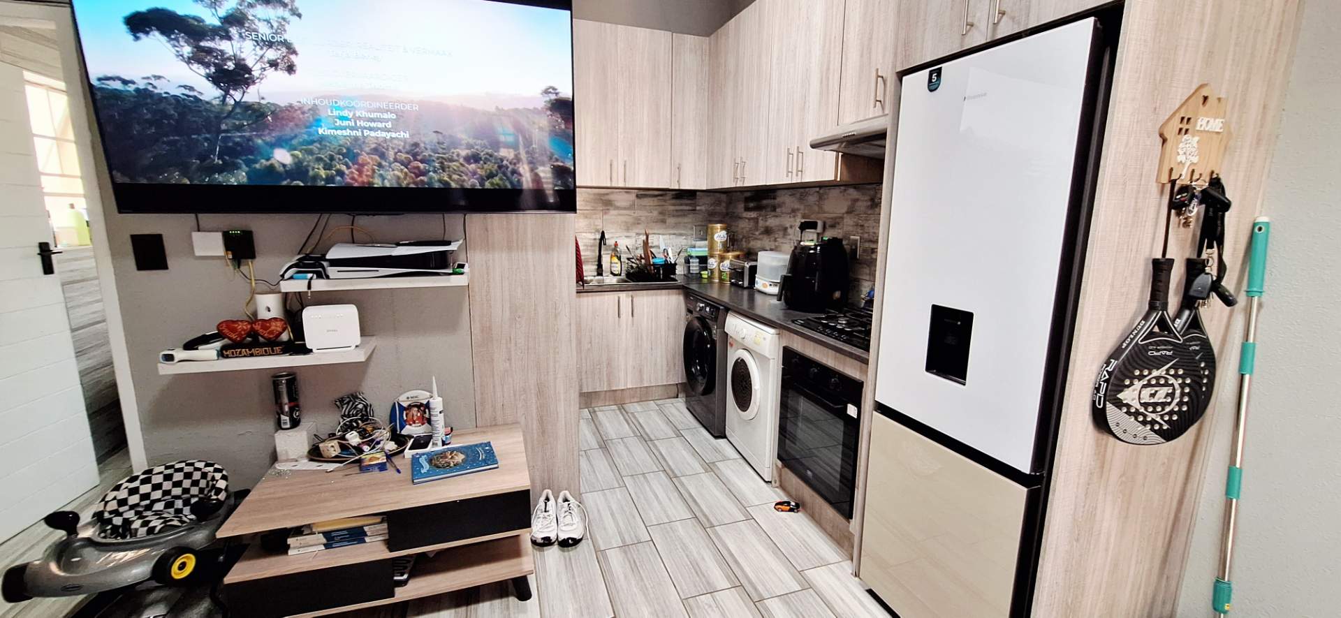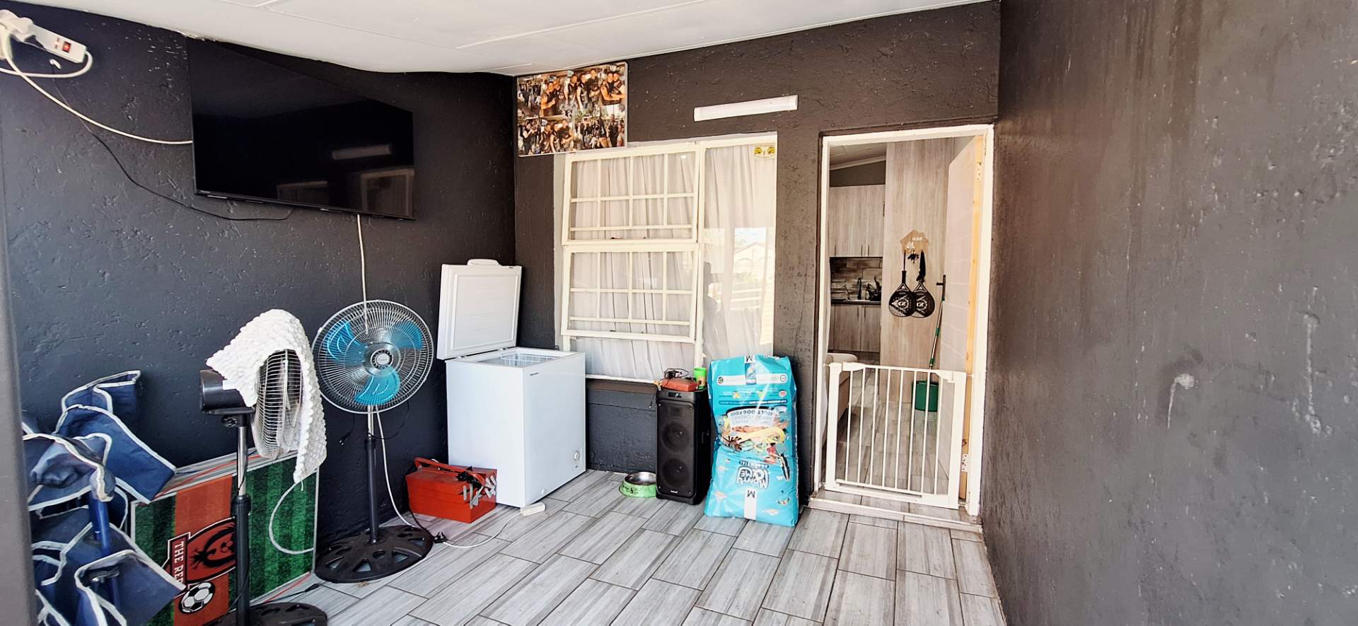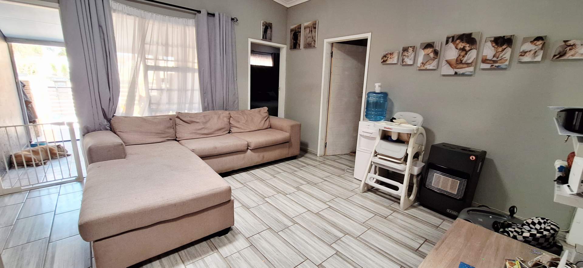 Step inside to find a home tiled throughout with contemporary tiles, creating a seamless and stylish flow. The open-plan lounge and kitchen area is designed with modern finishes and provides ample cupboard space, featuring a gas stove for the culinary enthusiast. The bathroom is tastefully appointed with modern fixtures including a loo, basin, and shower, complemented by an energy-efficient solar geyser.