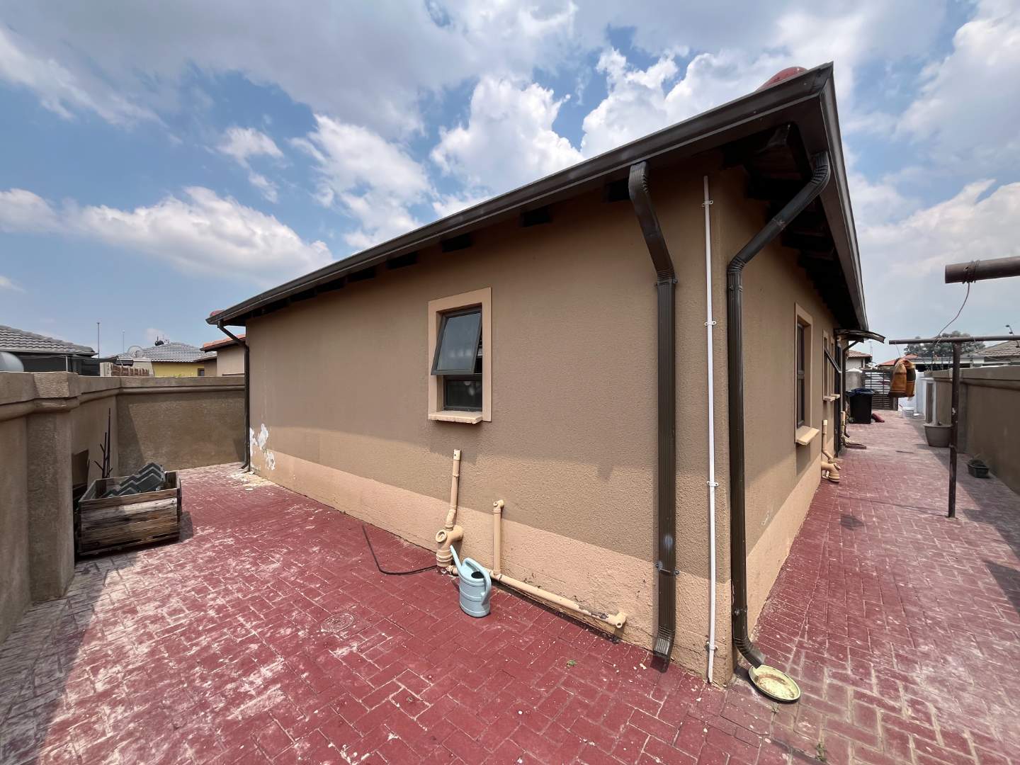 The house features three spacious bedrooms, all fitted with built-in cupboards. The main bedroom includes a private ensuite bathroom, while the main bathroom is fully equipped with a bathtub, basin, and toilet.