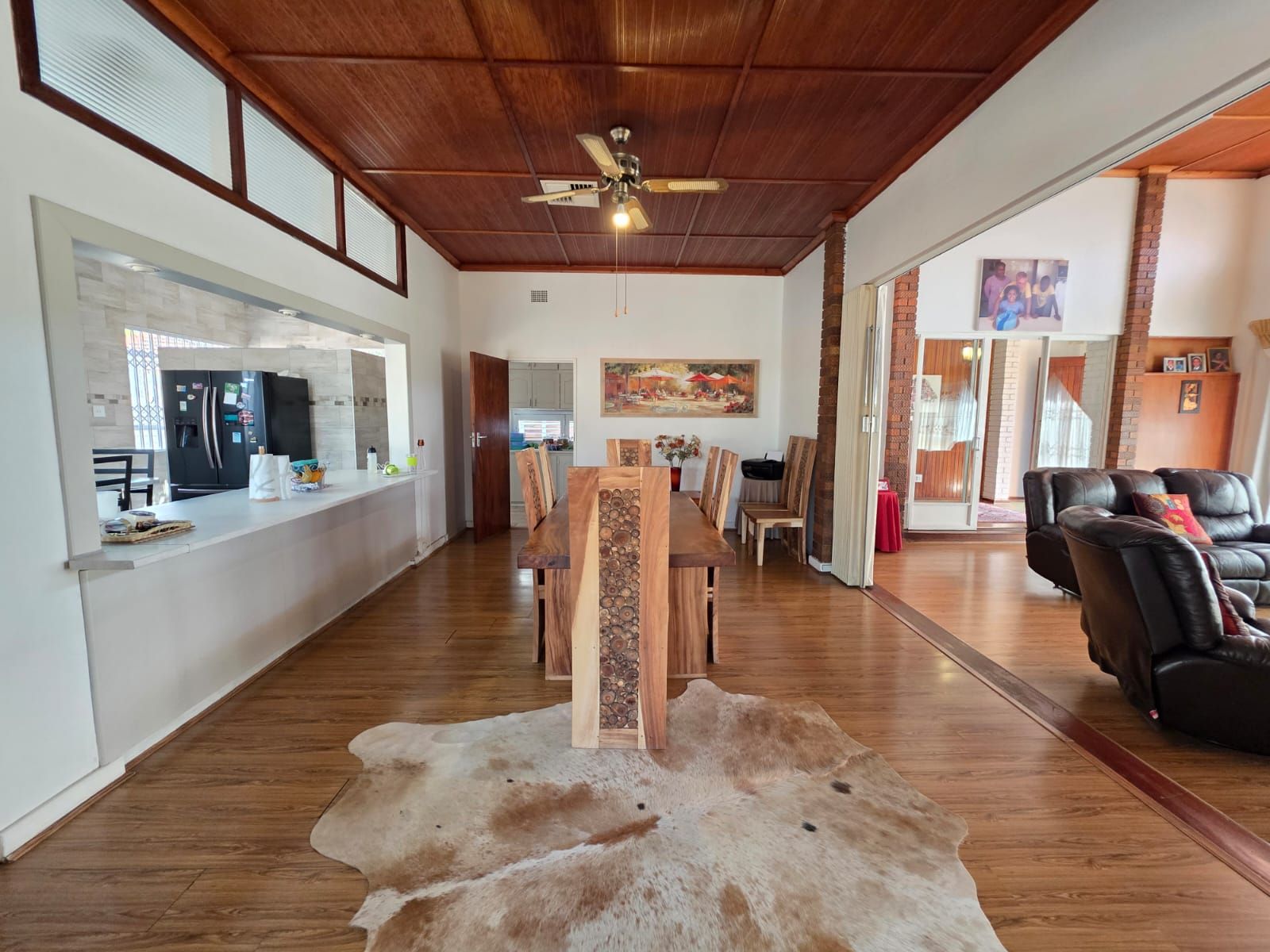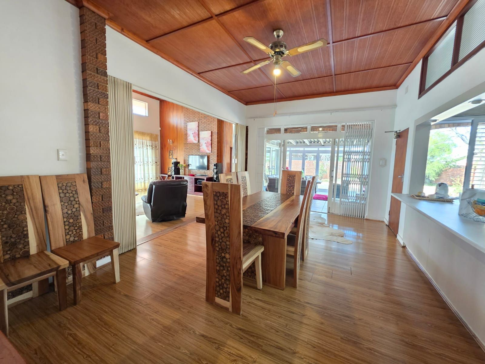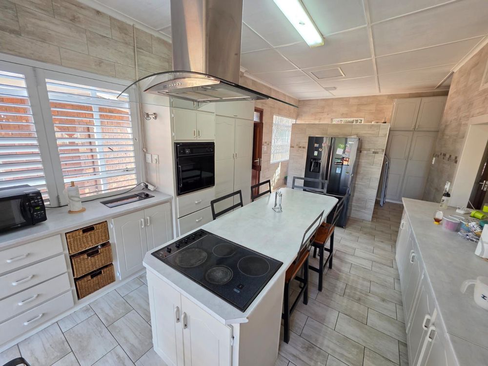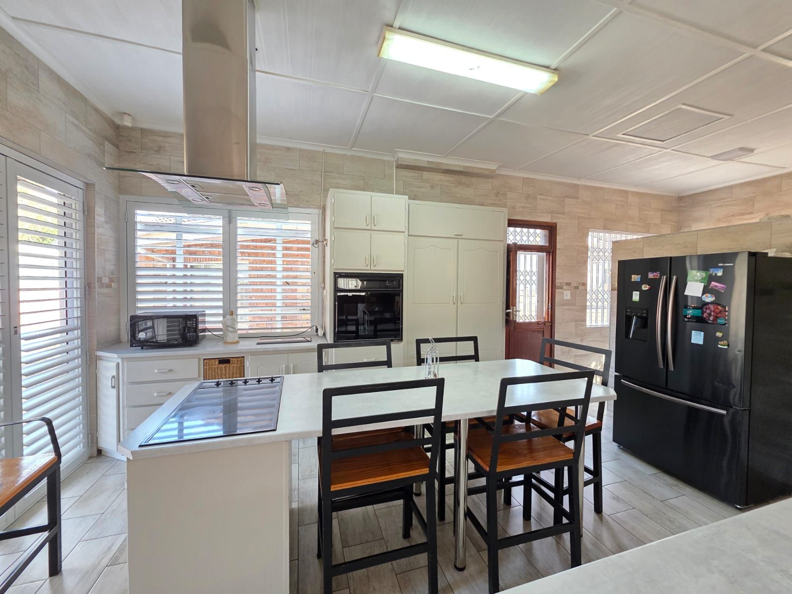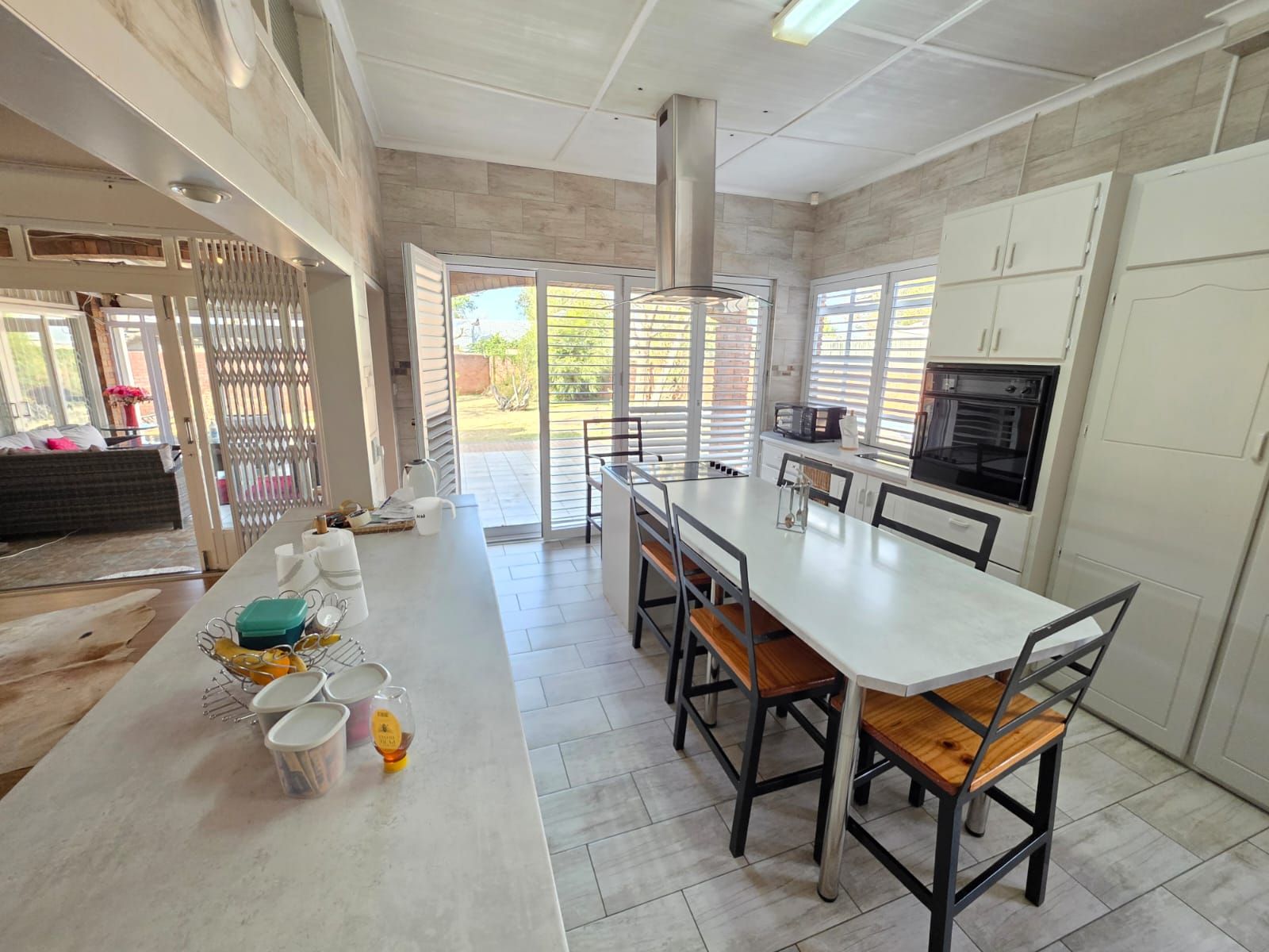 The main house features two family rooms, a formal living room, and a dining room—ideal for both relaxed family living and entertaining. The primary kitchen is beautifully fitted with built-in cupboards, a breakfast nook, centre island, eye-level oven and hob, extractor fan, tumble dryer, and a gas geyser. A second open-plan kitchen forms part of the flat, creating an ideal setup for dual living or rental income.