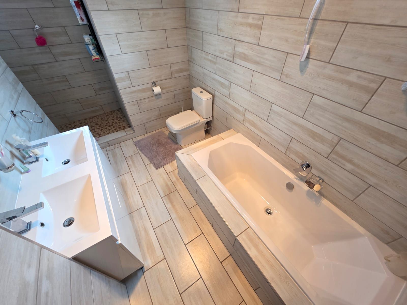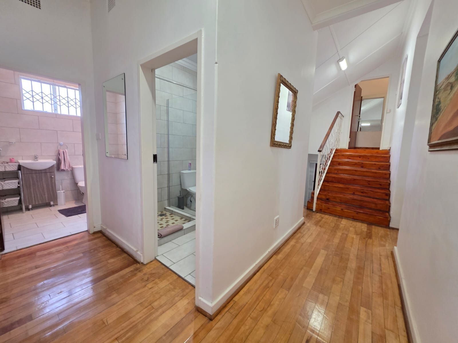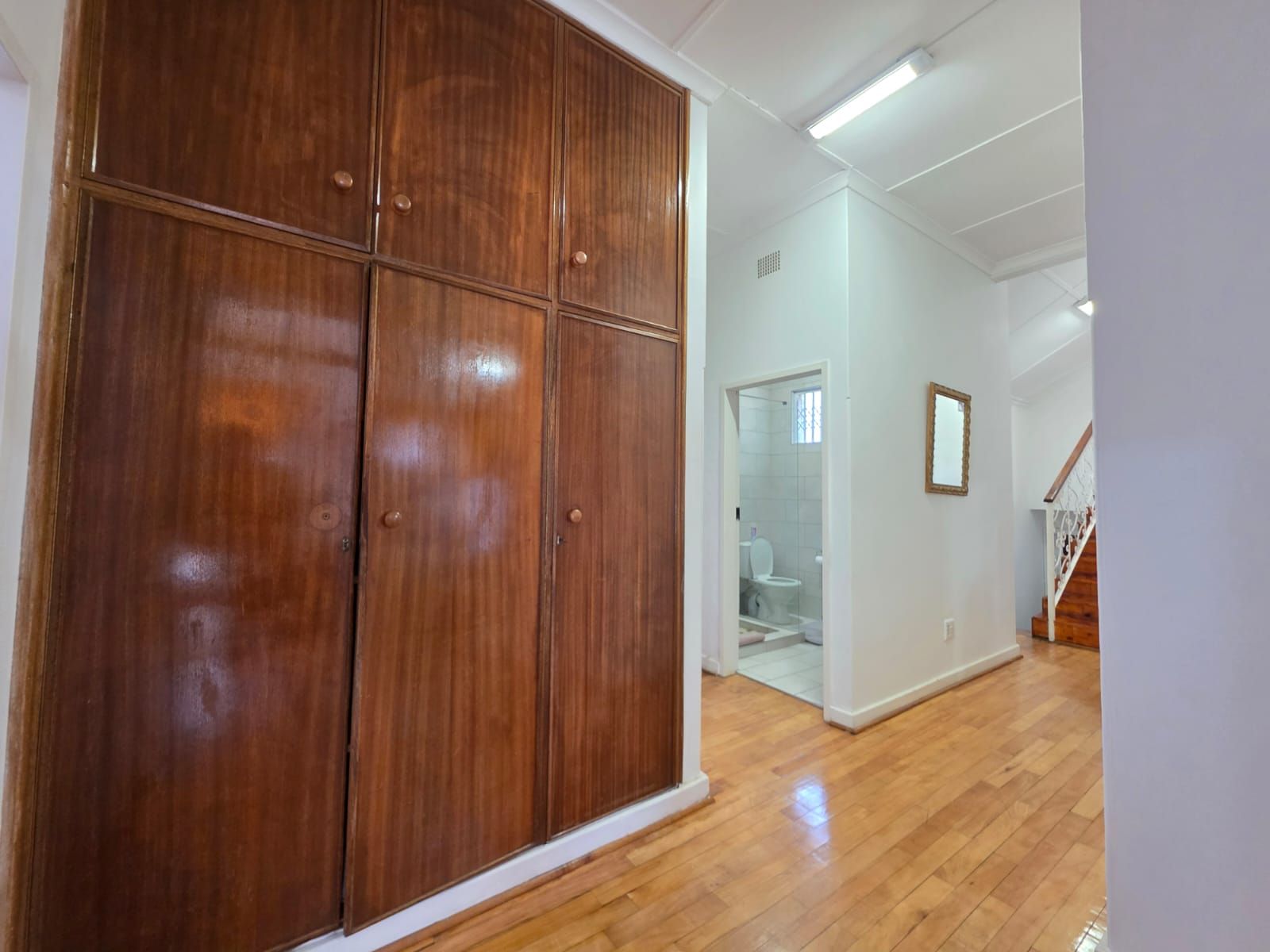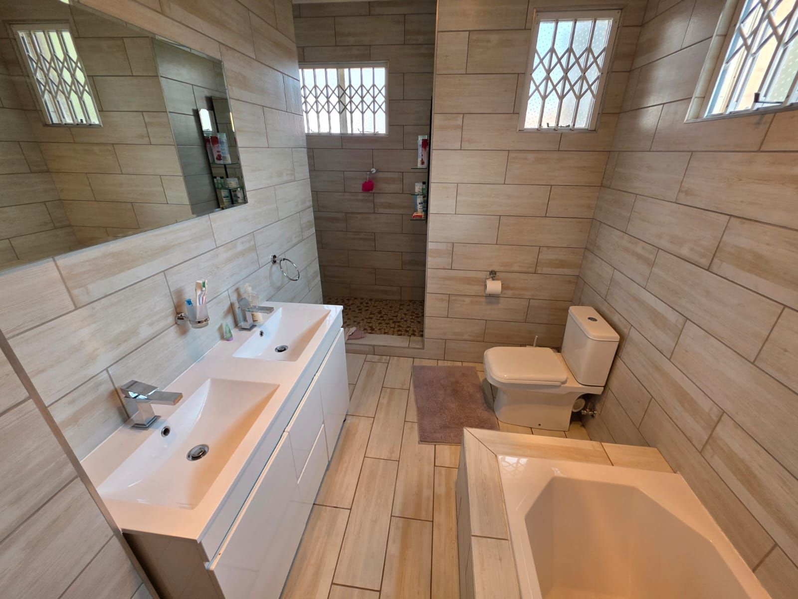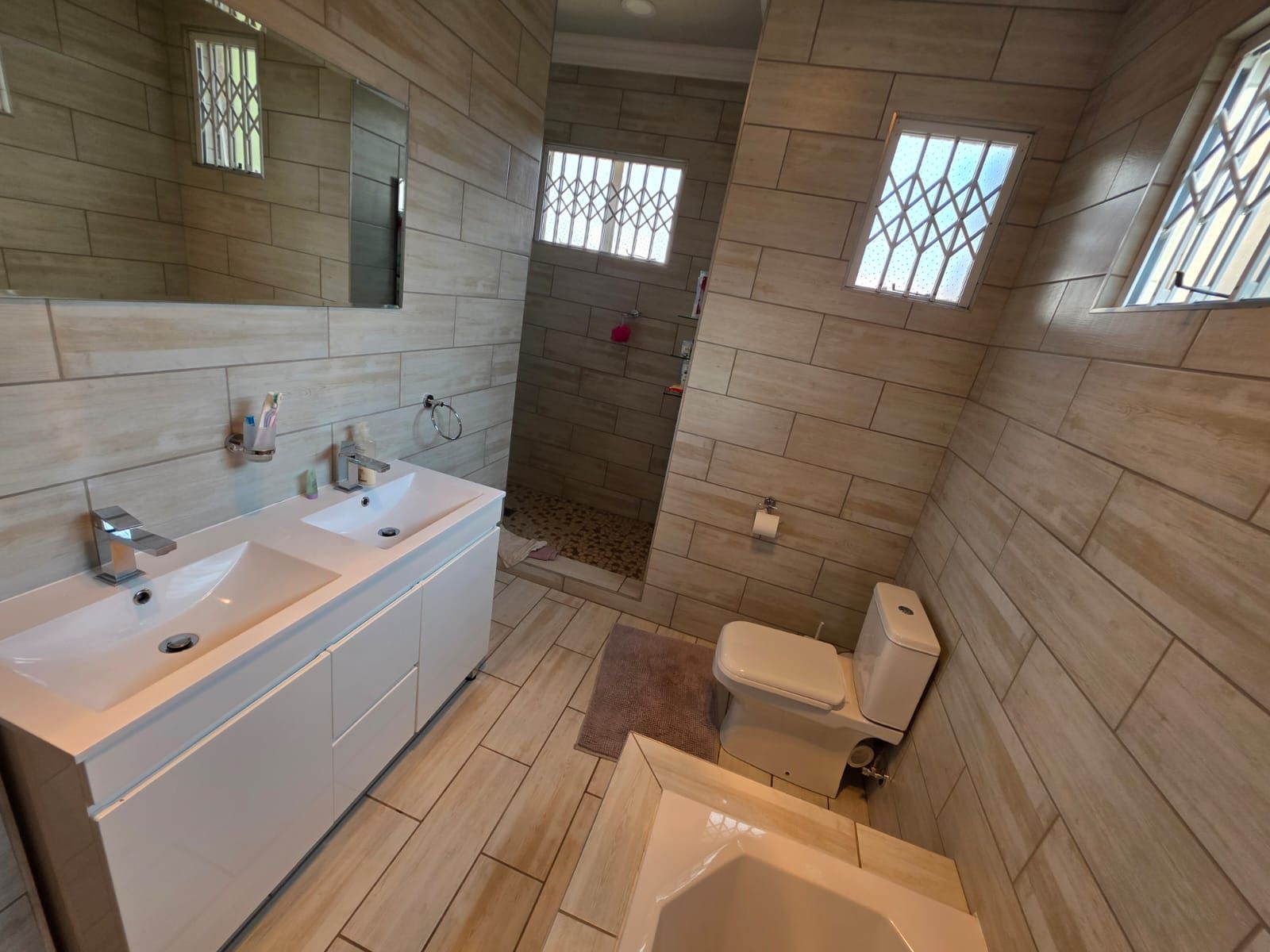 The main house features two family rooms, a formal living room, and a dining room—ideal for both relaxed family living and entertaining. The primary kitchen is beautifully fitted with built-in cupboards, a breakfast nook, centre island, eye-level oven and hob, extractor fan, tumble dryer, and a gas geyser. A second open-plan kitchen forms part of the flat, creating an ideal setup for dual living or rental income.
