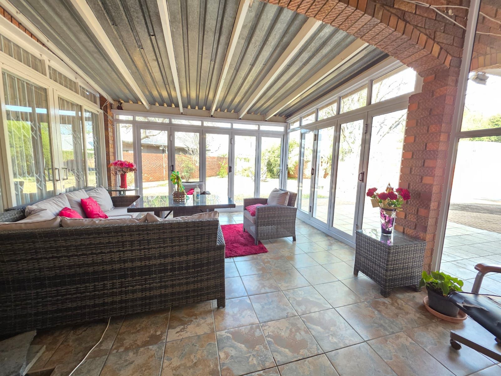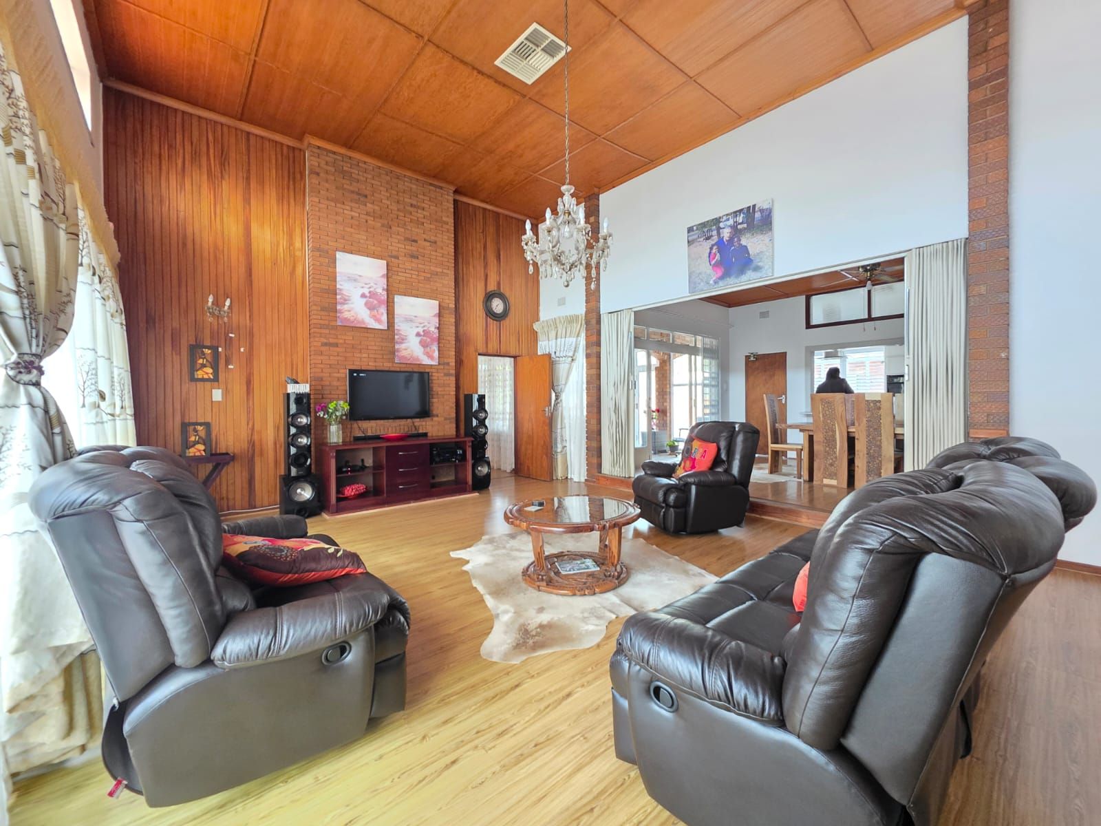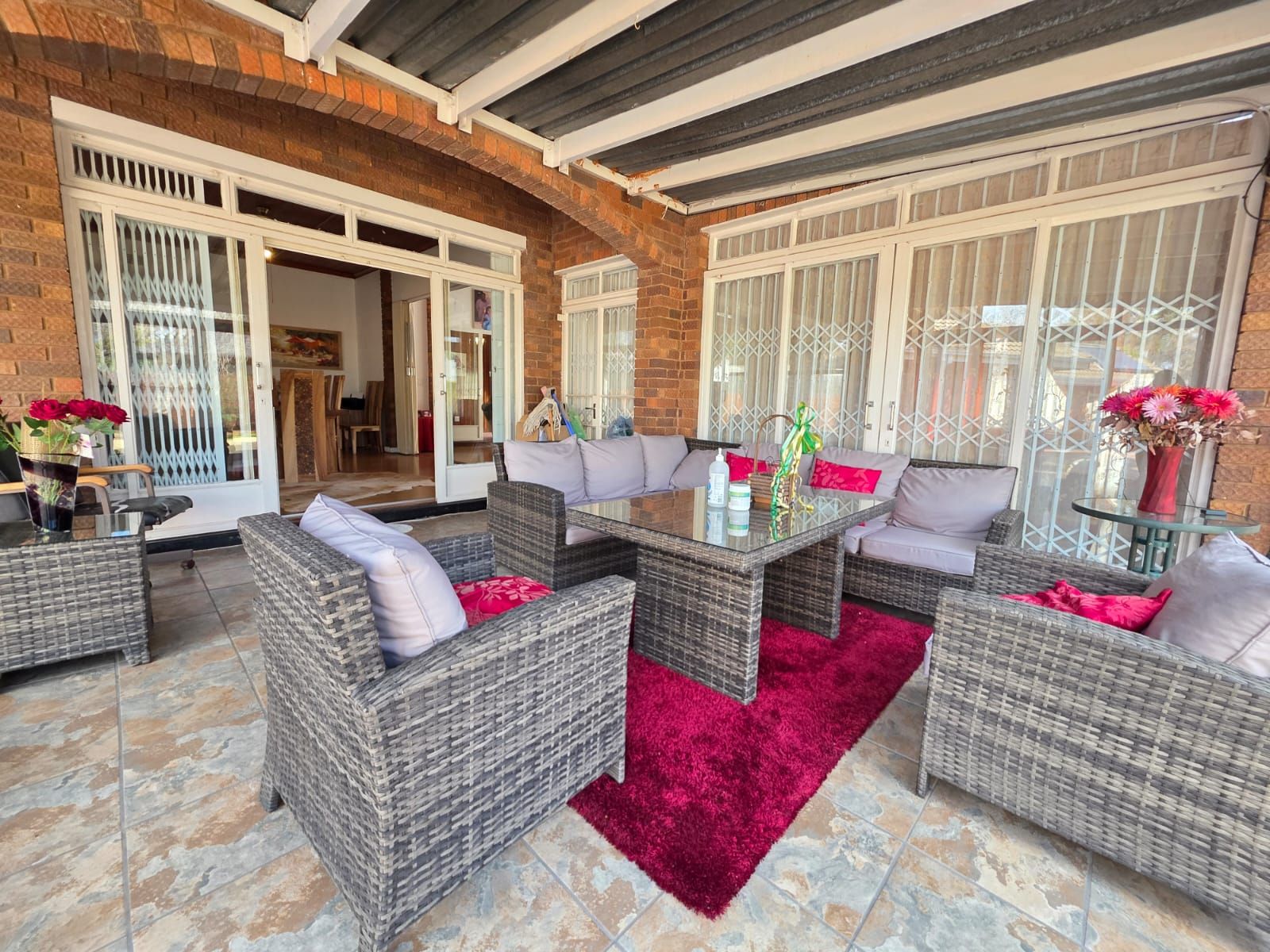 Outdoor living is just as inviting, with a sparkling swimming pool, well-maintained garden with irrigation, borehole, and Jo-Jo tank. Parking is plentiful with a double garage, single garage, and four secure parking spaces.