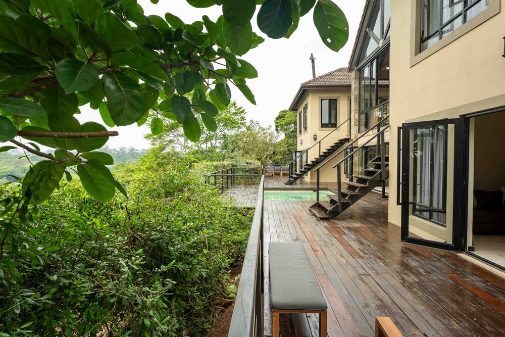 The entrance hall and welcoming reception lounge set a warm tone, enhanced by exposed beams and bamboo-lined ceilings. Split levels throughout the home add architectural interest and define the generous living spaces.