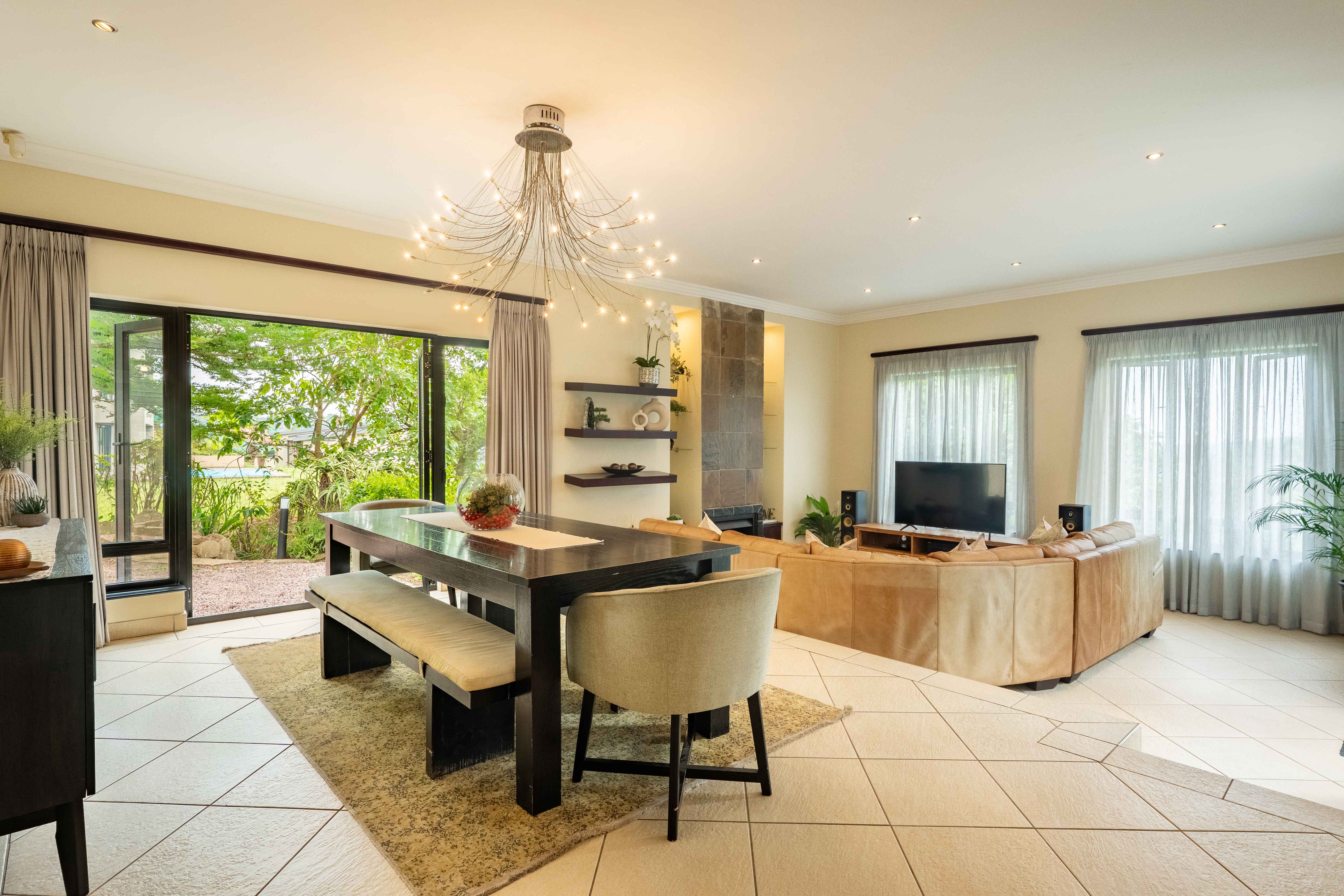 The kitchen is well-appointed and separate from the main living areas, featuring a an eye-level oven, glass hob, prep bowl, and ample storage. A scullery and laundry are positioned adjacent to the kitchen and provide direct access to the double automated garages. The garages include a storeroom and full staff accommodation adjoining, while an additional extra-length carport offers further covered parking.