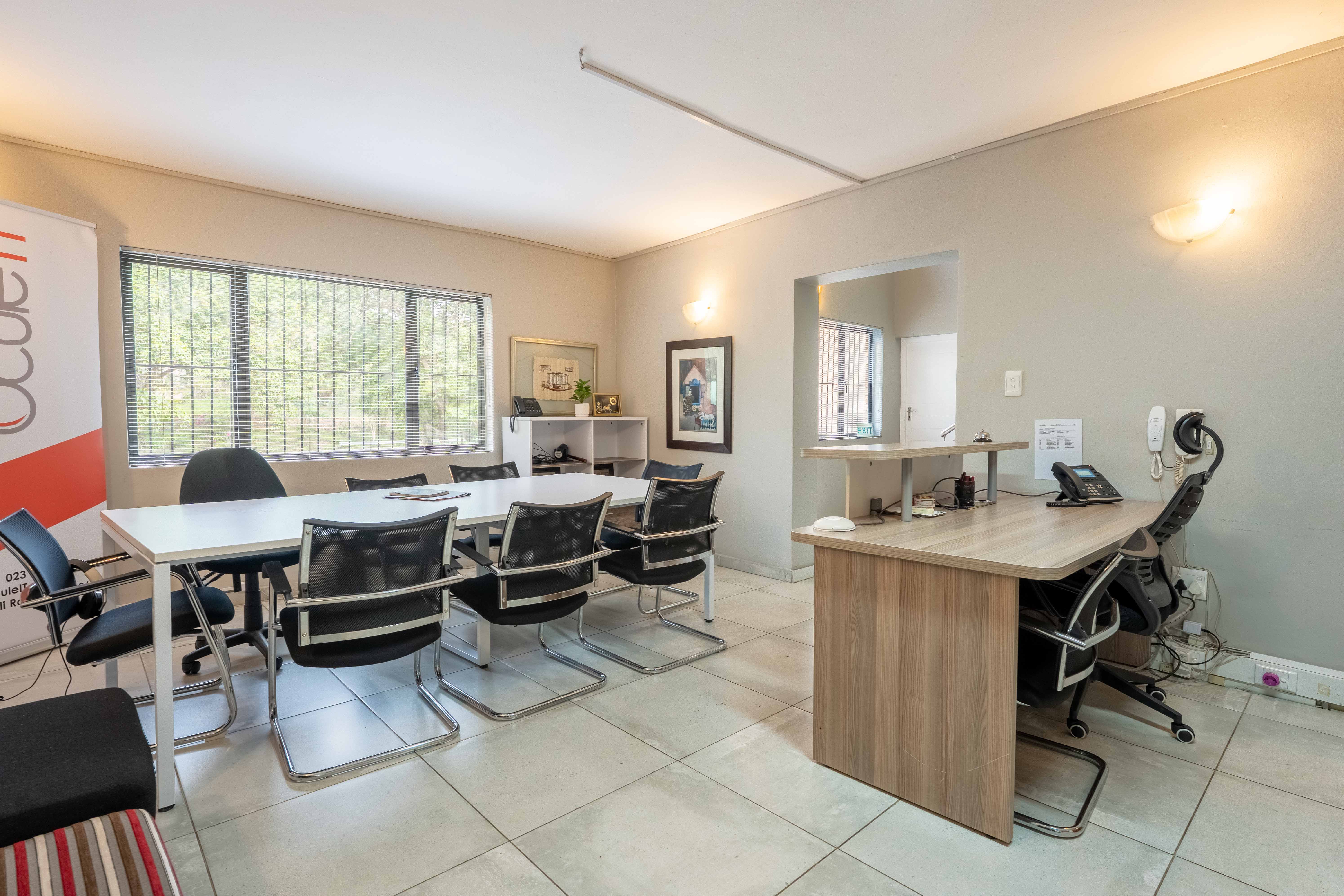 Downstairs: one smaller office and separate boardroom, plus downstairs toilet. Reception and waiting area adjoined by a kitchen area which opens out onto undercover carport: an ideal facility for staff/commercial gatherings (office braais etc.).
