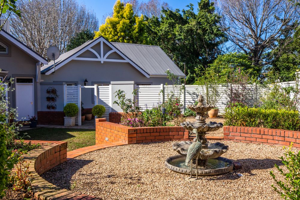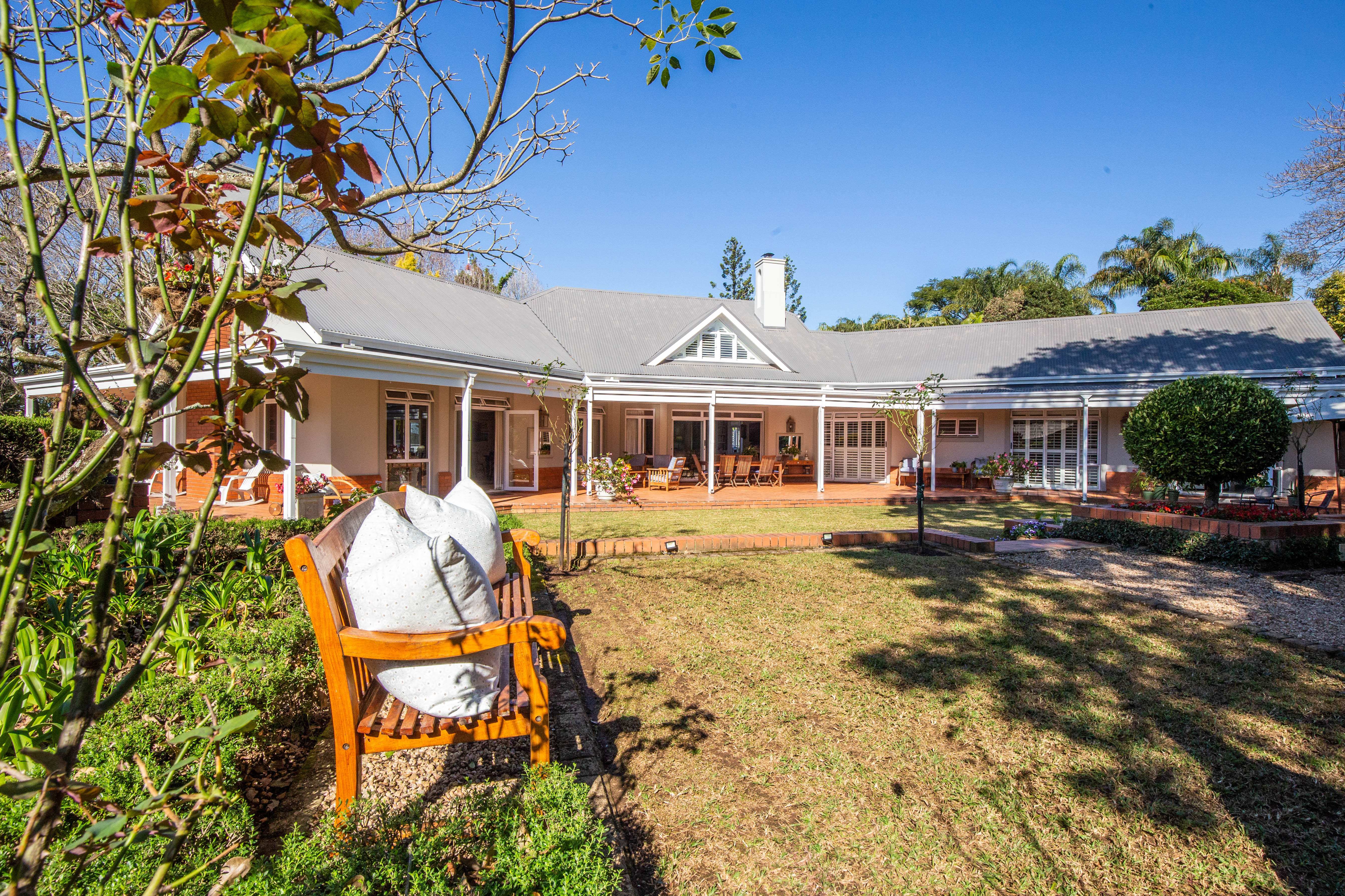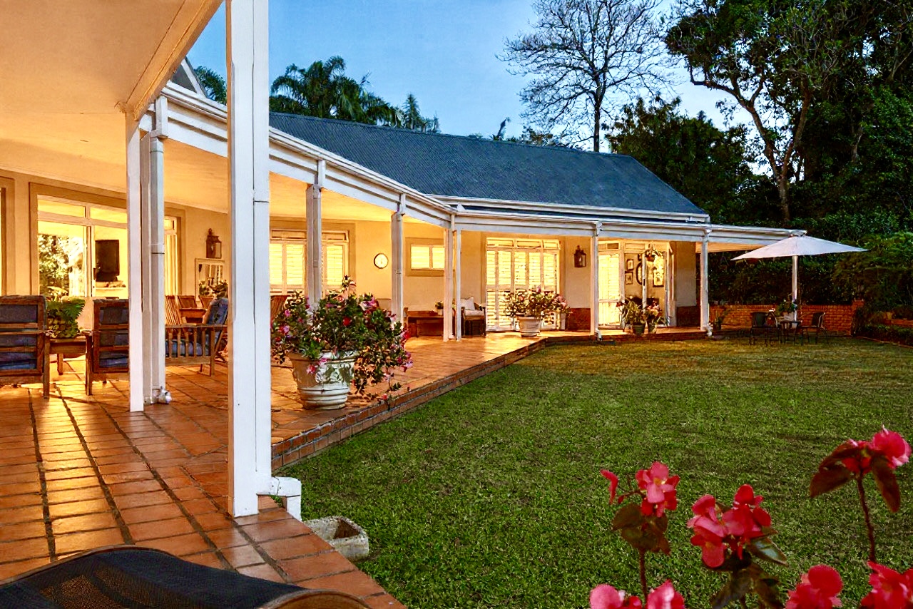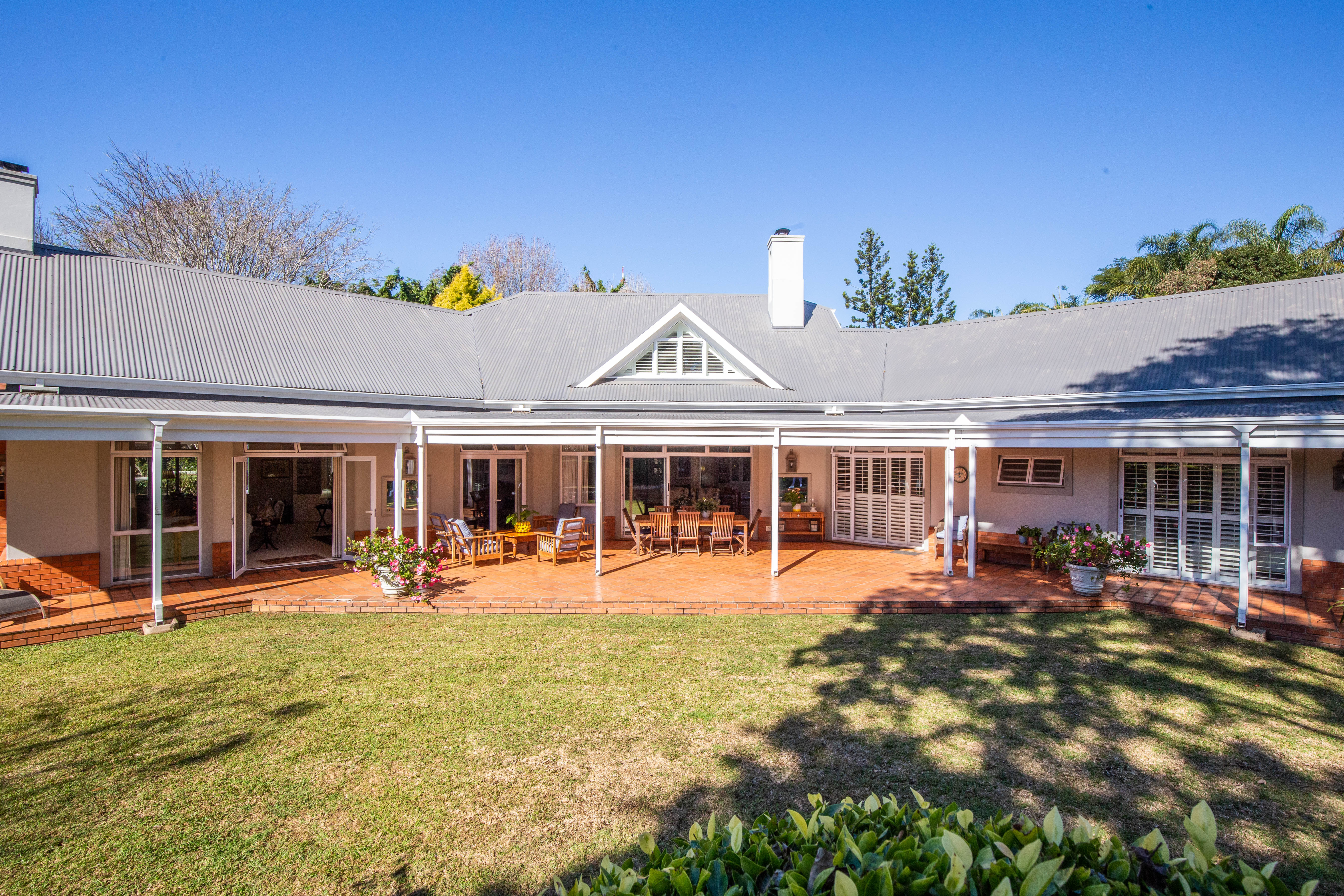 Welcome to gorgeous Hurlstone Estate, the crown jewel of the Kloof Golf Course Blue Zone. This elite private Estate is home to just 5 prestigious homes and offers a superior lifestyle for the discerning investor. A home here is a rare find indeed and we are proud to offer one of the finest! This home has a colonial farmhouse aesthetic with the quintessential expansive wrap verandah leading out to a bowling green level lawn in both the south and north gardens. The landscaping is breathtaking and you have complete privacy from the neighbouring homes. The home boasts solid Oregon feature floors and luxury carpeting throughout. You can enjoy a formal lounge with fireplace that leads out to the verandah as well as a separate formal dining room elegantly appointed. The heart of the home is family focused with an open plan bespoke kitchen that opens to the air-conditioned TV lounge and breakfast room, both of which offer doors to the gardens. The kitchen also has a large utilities room for laundry and scullery space.