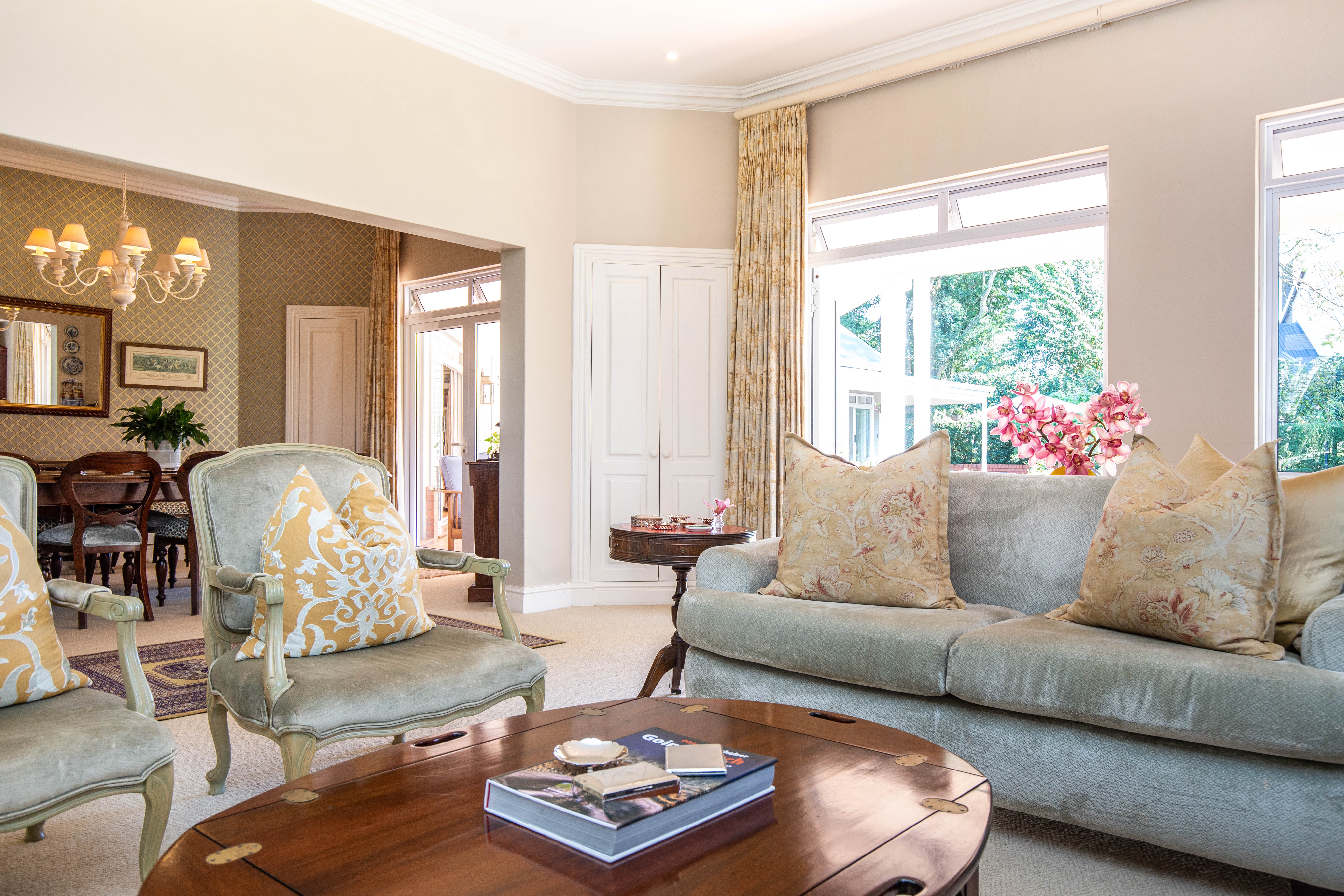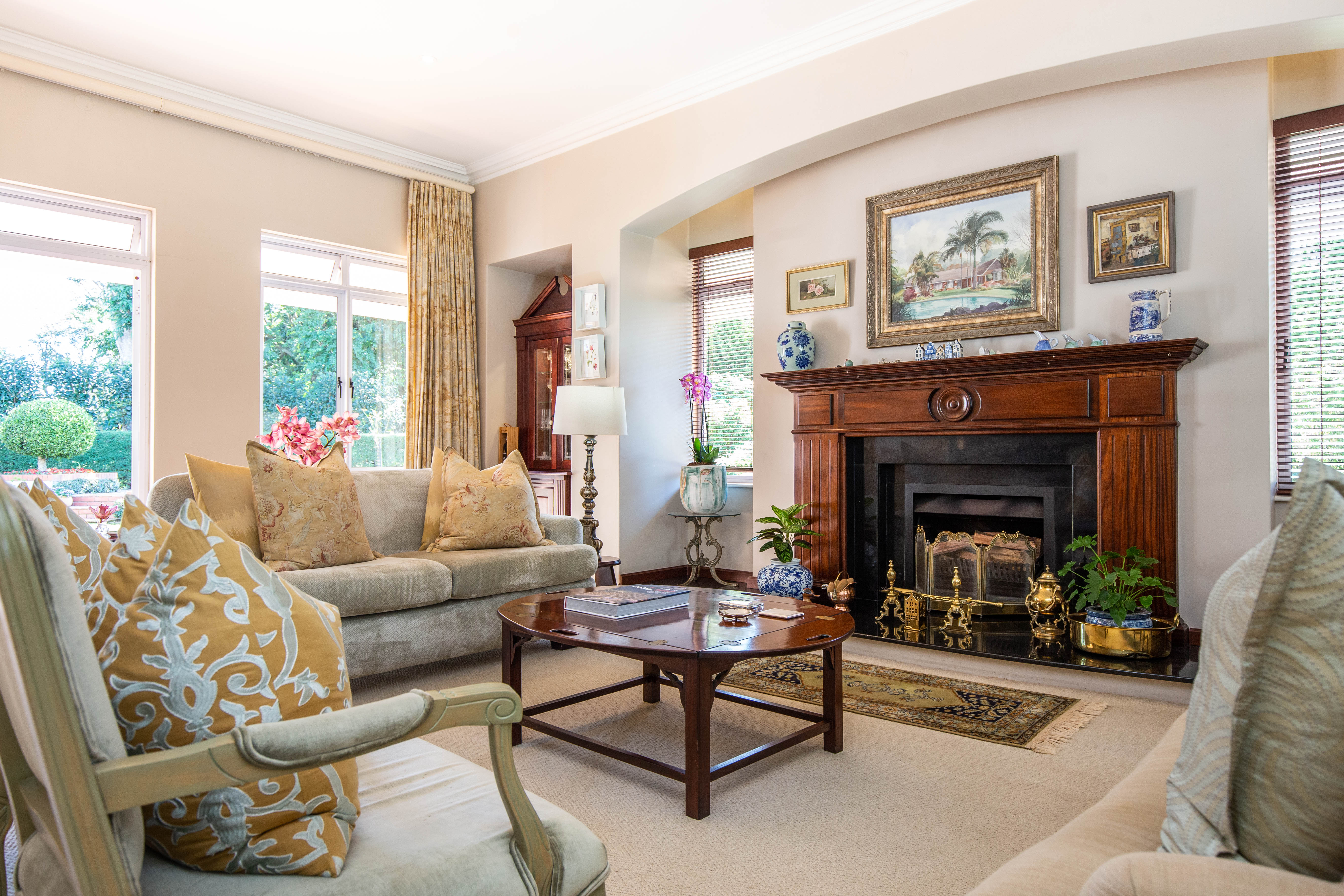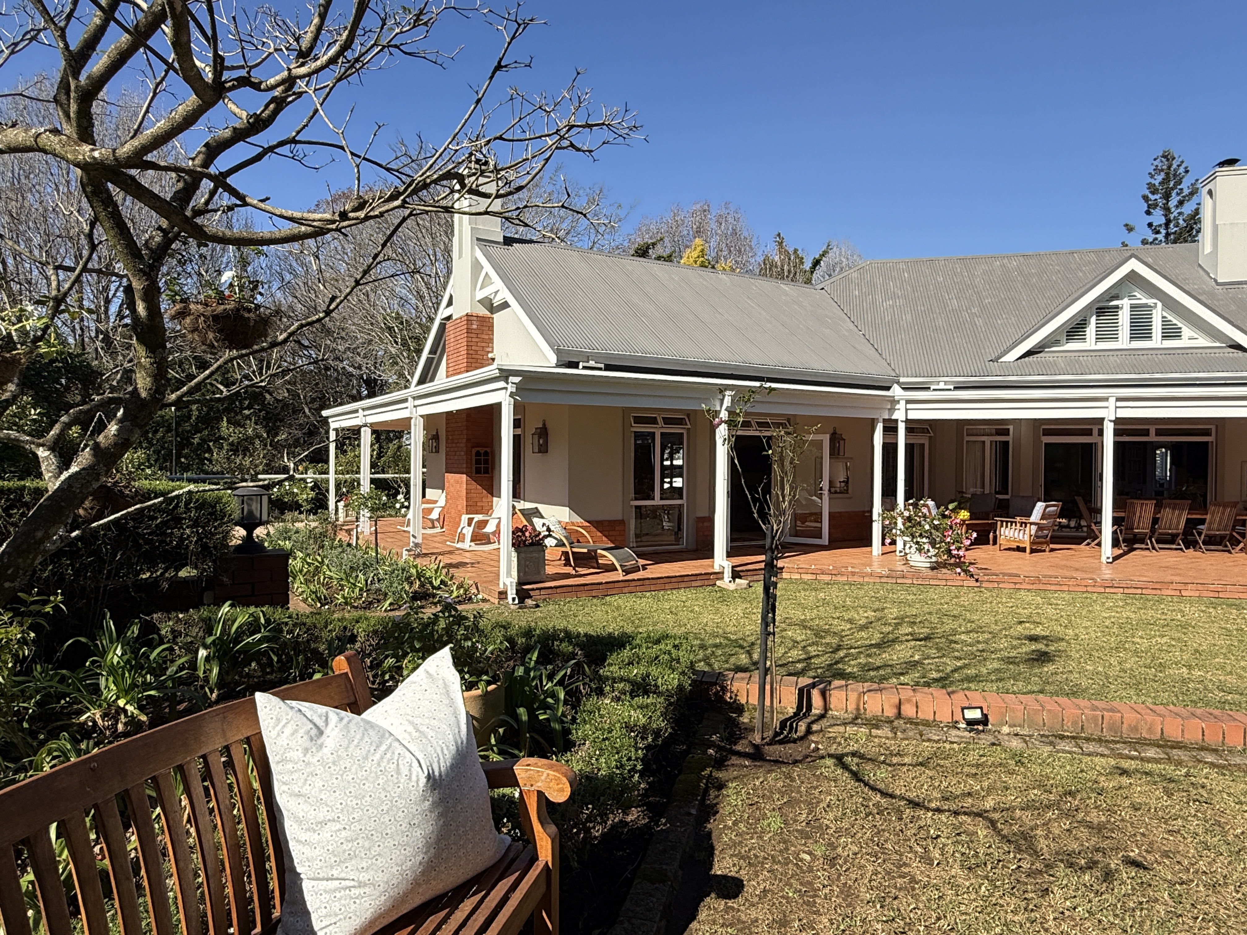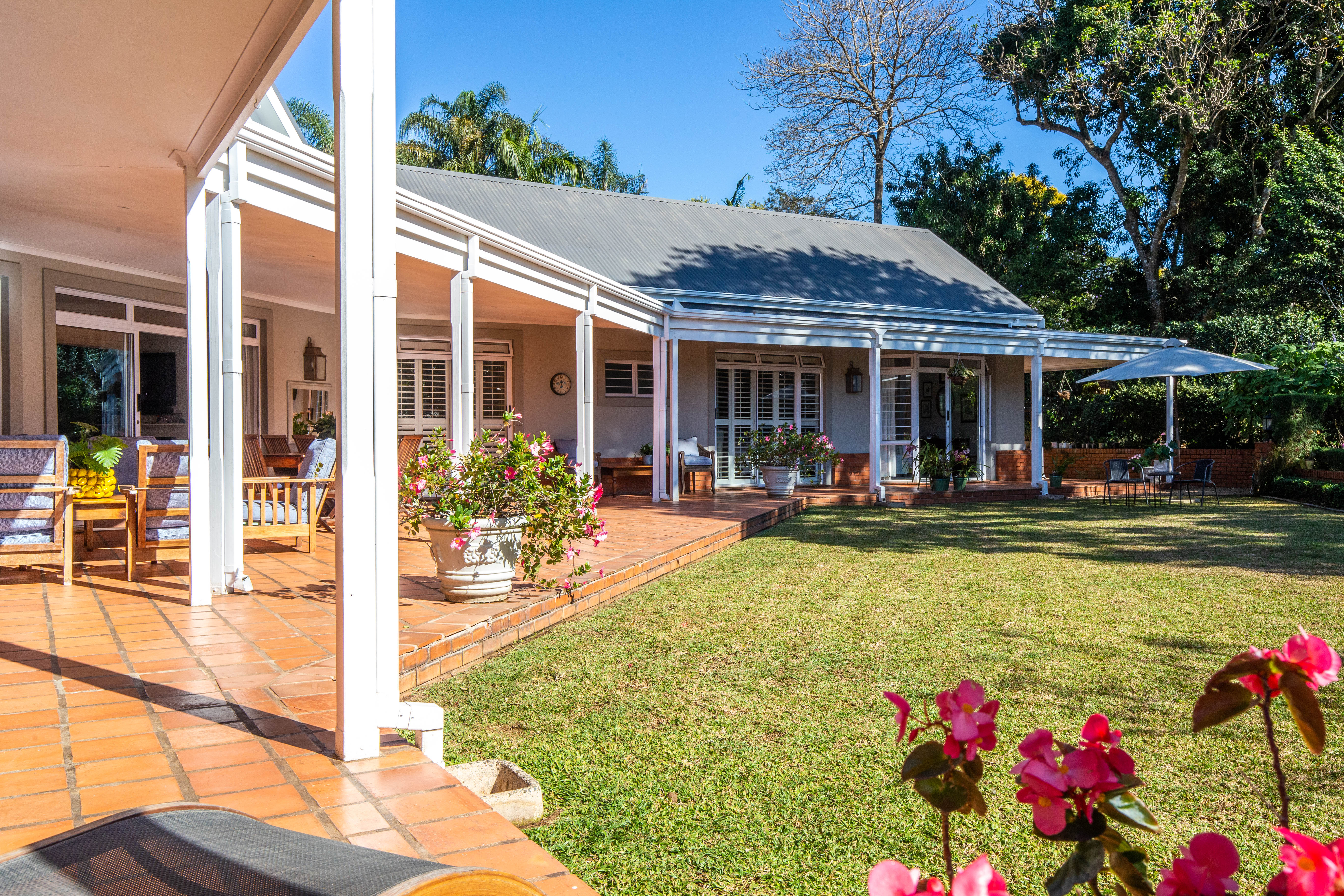 Welcome to gorgeous Hurlstone Estate, the crown jewel of the Kloof Golf Course Blue Zone. This elite private Estate is home to just 5 prestigious homes and offers a superior lifestyle for the discerning investor. A home here is a rare find indeed and we are proud to offer one of the finest! This home has a colonial farmhouse aesthetic with the quintessential expansive wrap verandah leading out to a bowling green level lawn in both the south and north gardens. The landscaping is breathtaking and you have complete privacy from the neighbouring homes. The home boasts solid Oregon feature floors and luxury carpeting throughout. You can enjoy a formal lounge with fireplace that leads out to the verandah as well as a separate formal dining room elegantly appointed. The heart of the home is family focused with an open plan bespoke kitchen that opens to the air-conditioned TV lounge and breakfast room, both of which offer doors to the gardens. The kitchen also has a large utilities room for laundry and scullery space.