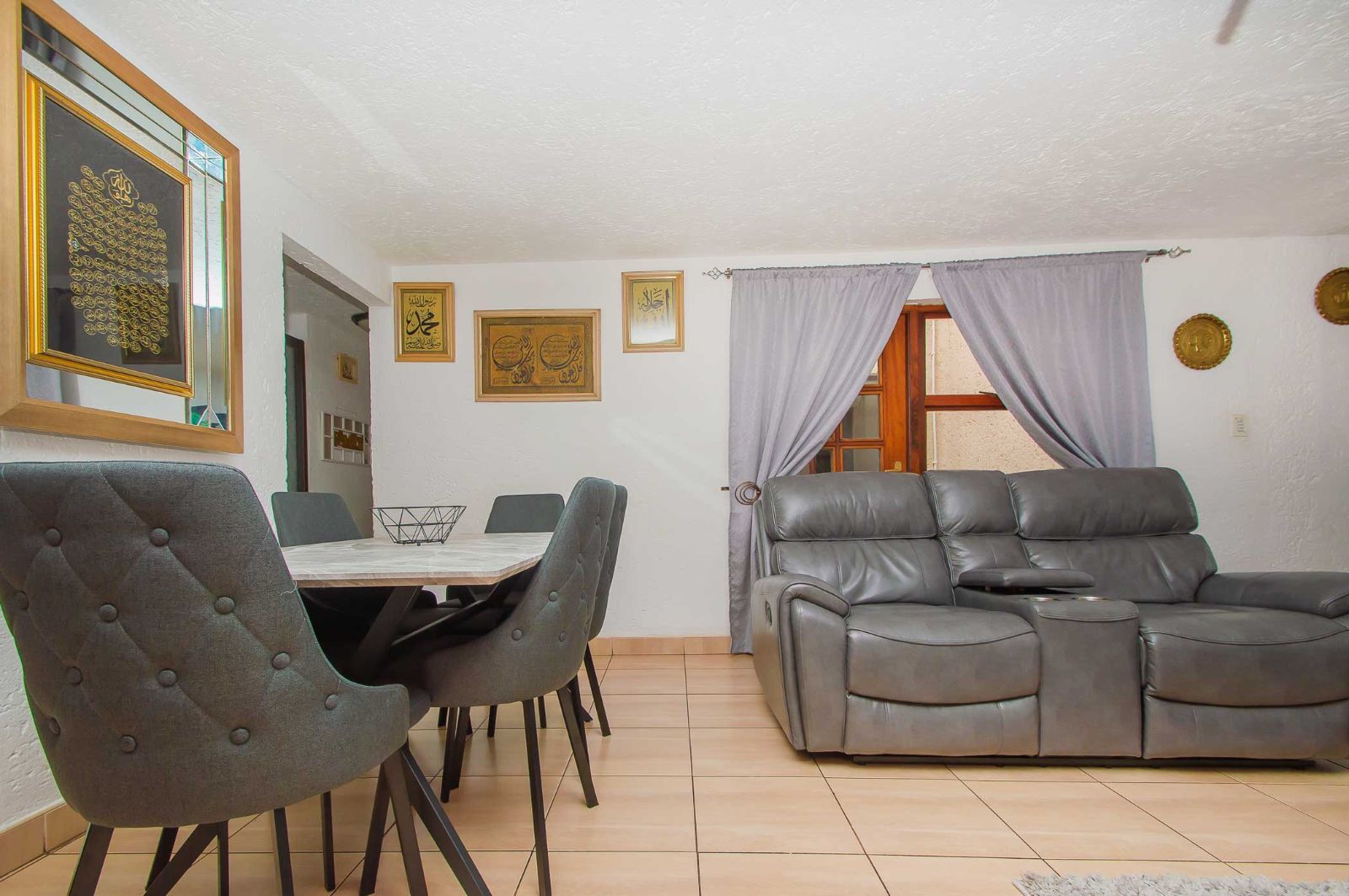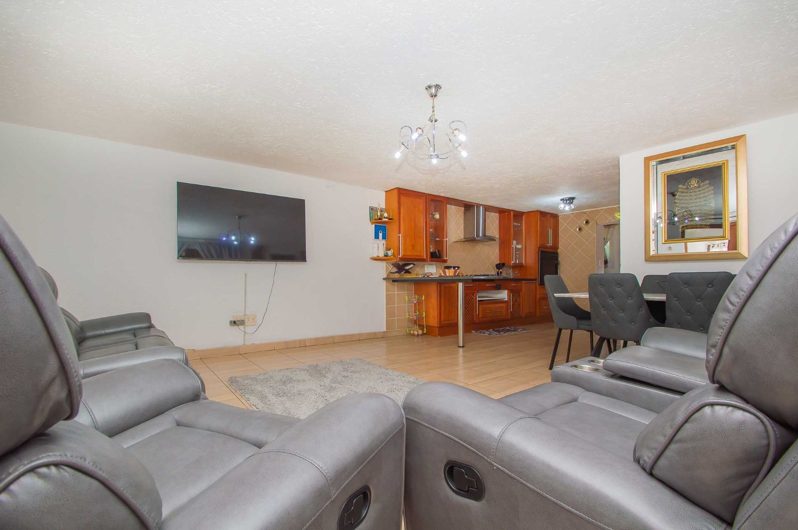 Open plan living, tiled lounge / diningroom seamlessly flows into the kitchen areas with gas hob and scullery