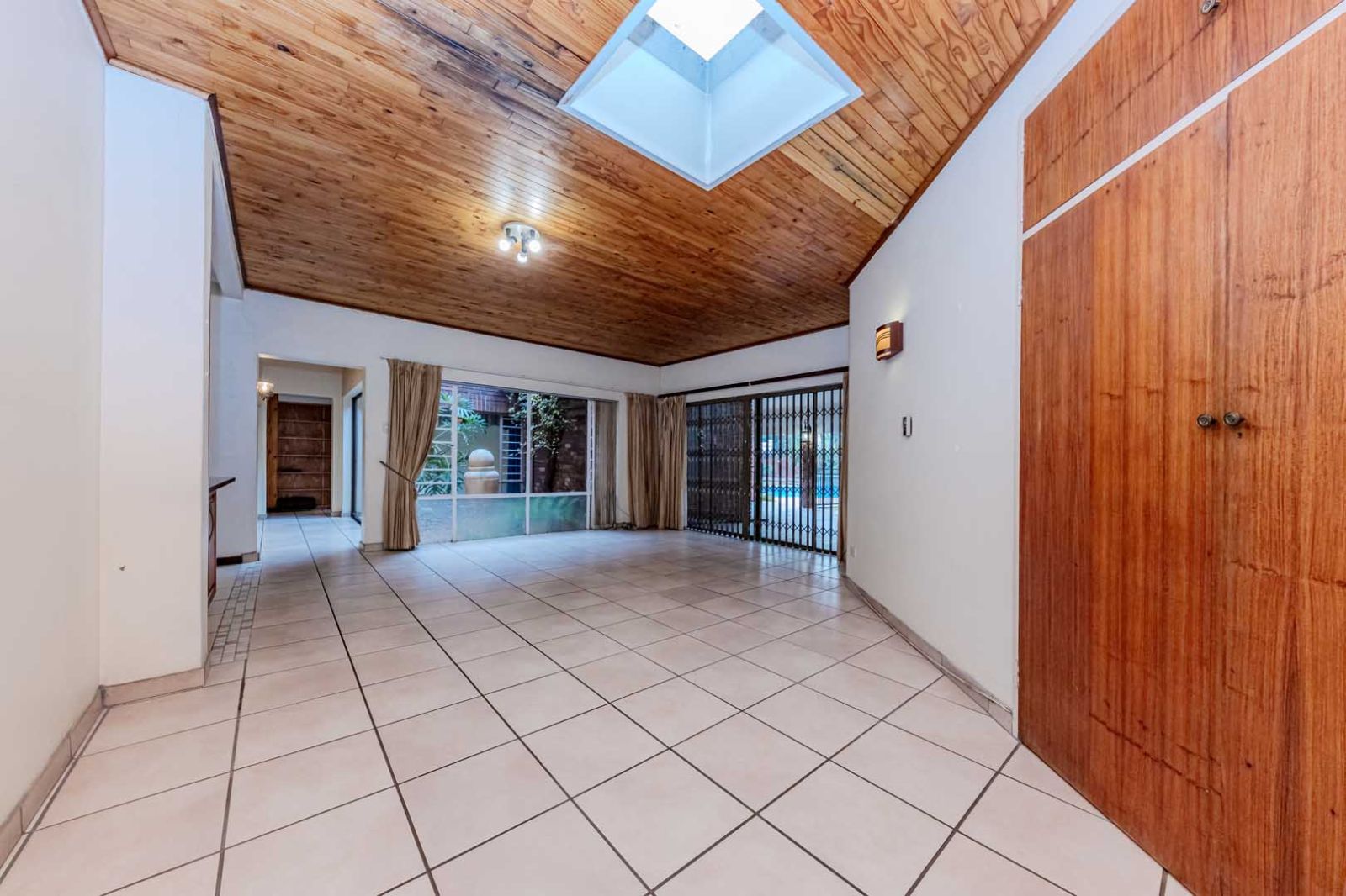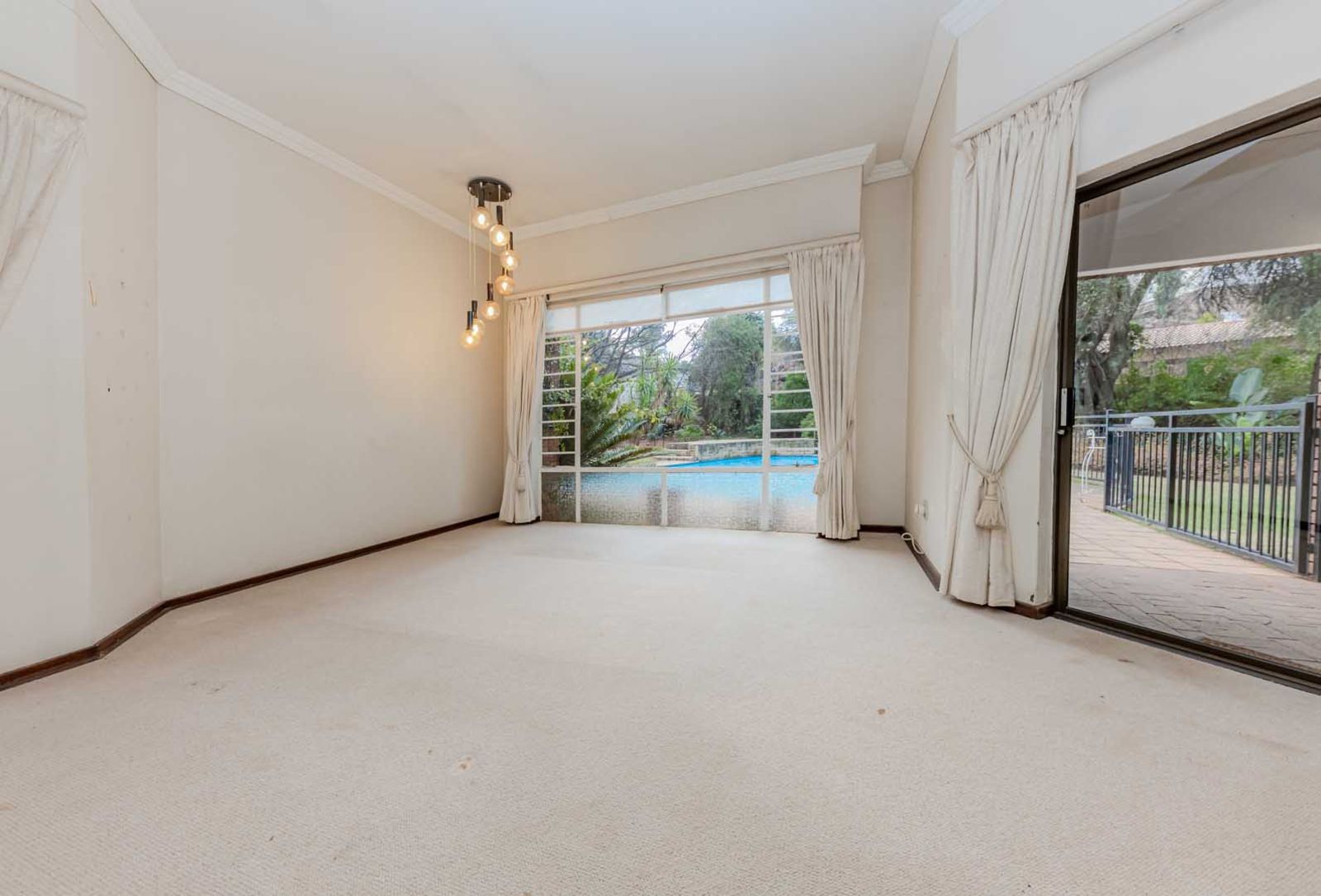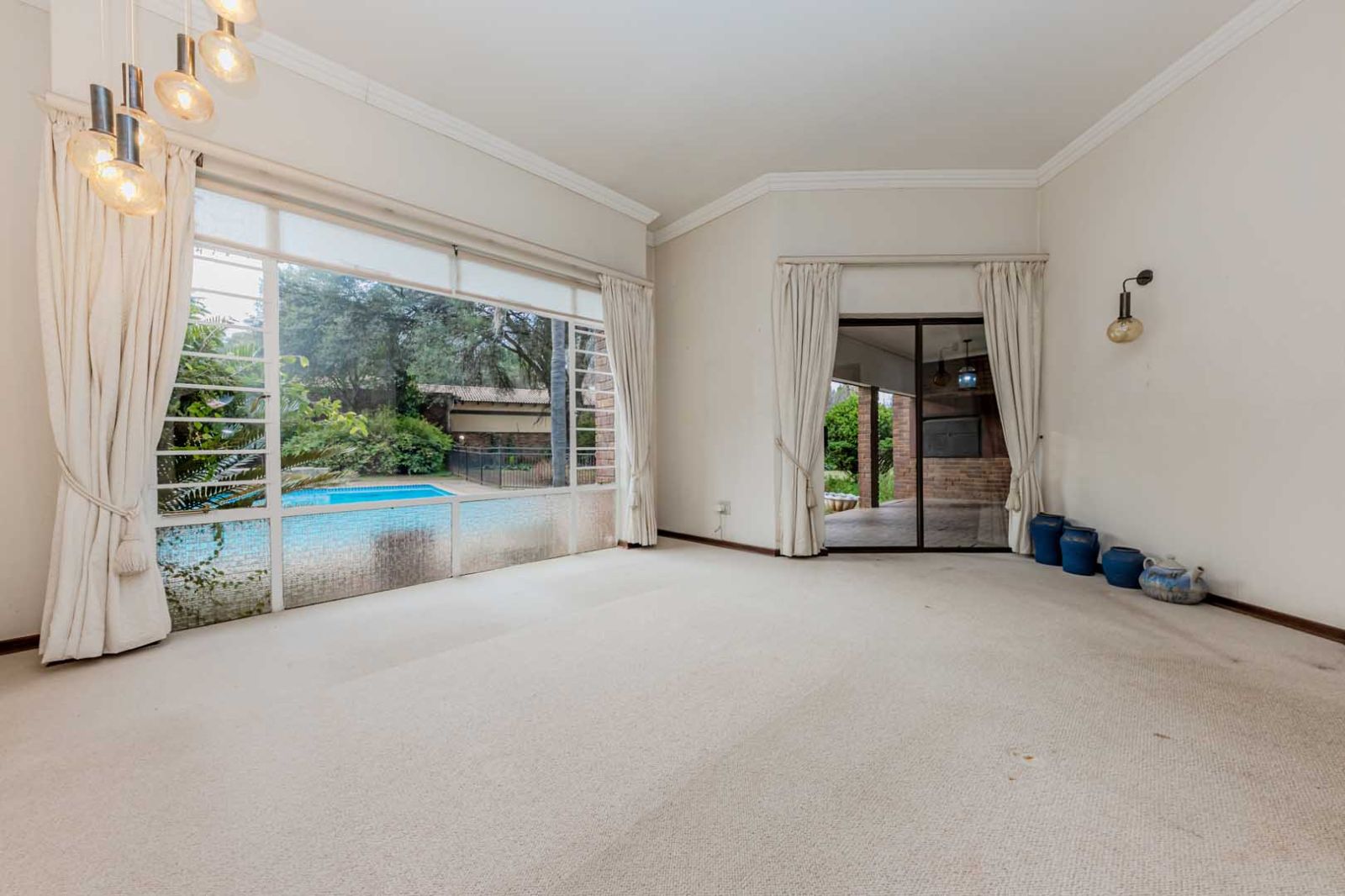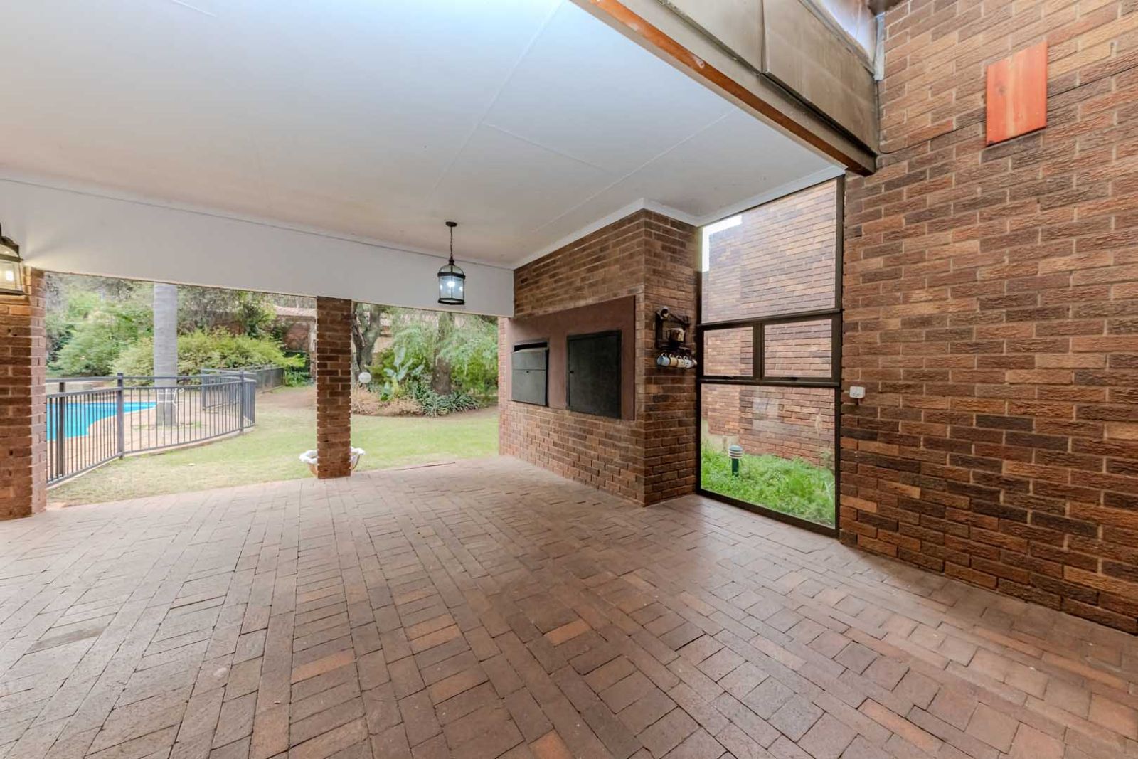 The dining room opens to a covered patio with built in braai, perfect for entertaining while overlooking the sparkling pool and the lush mature garden.