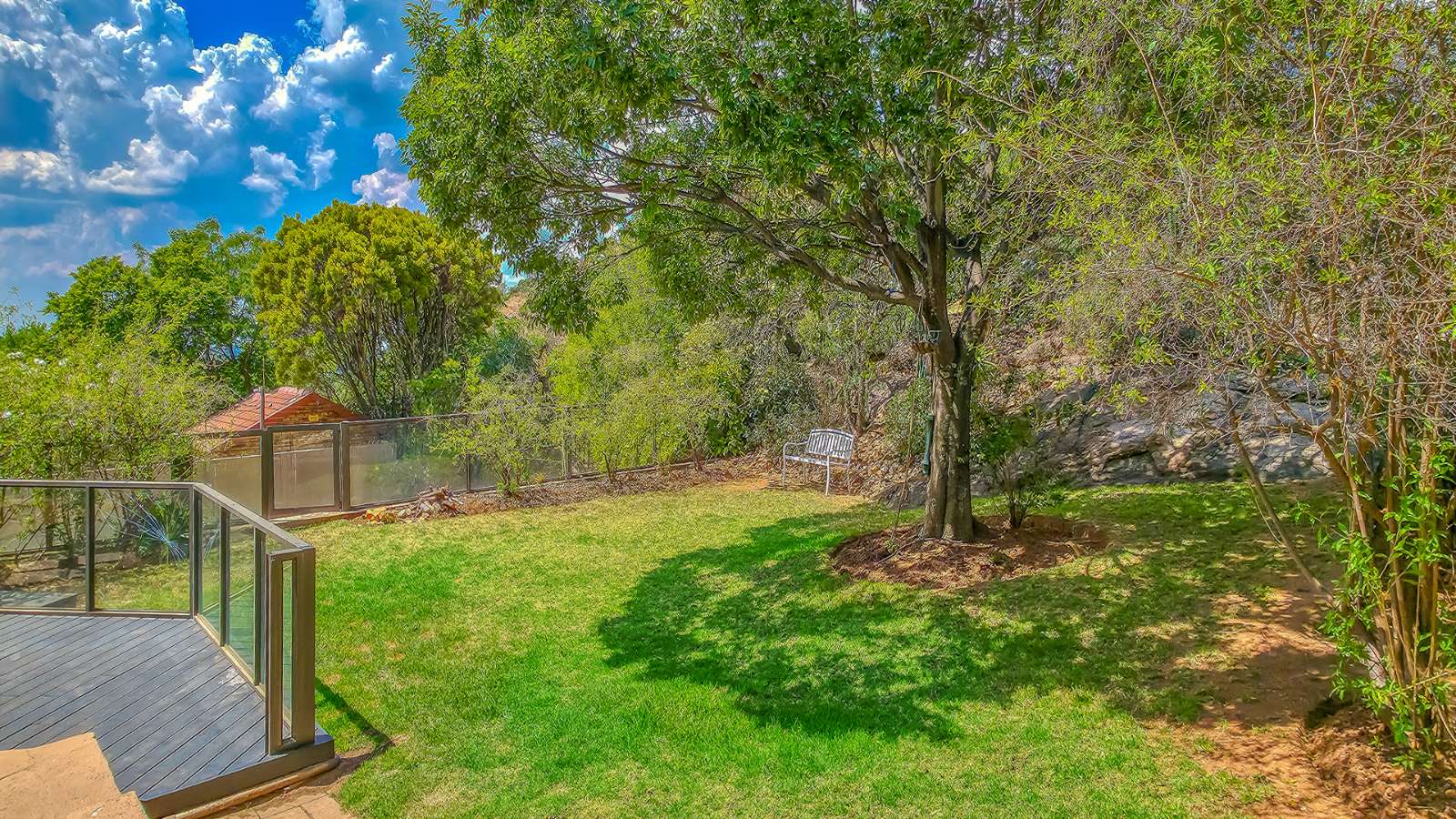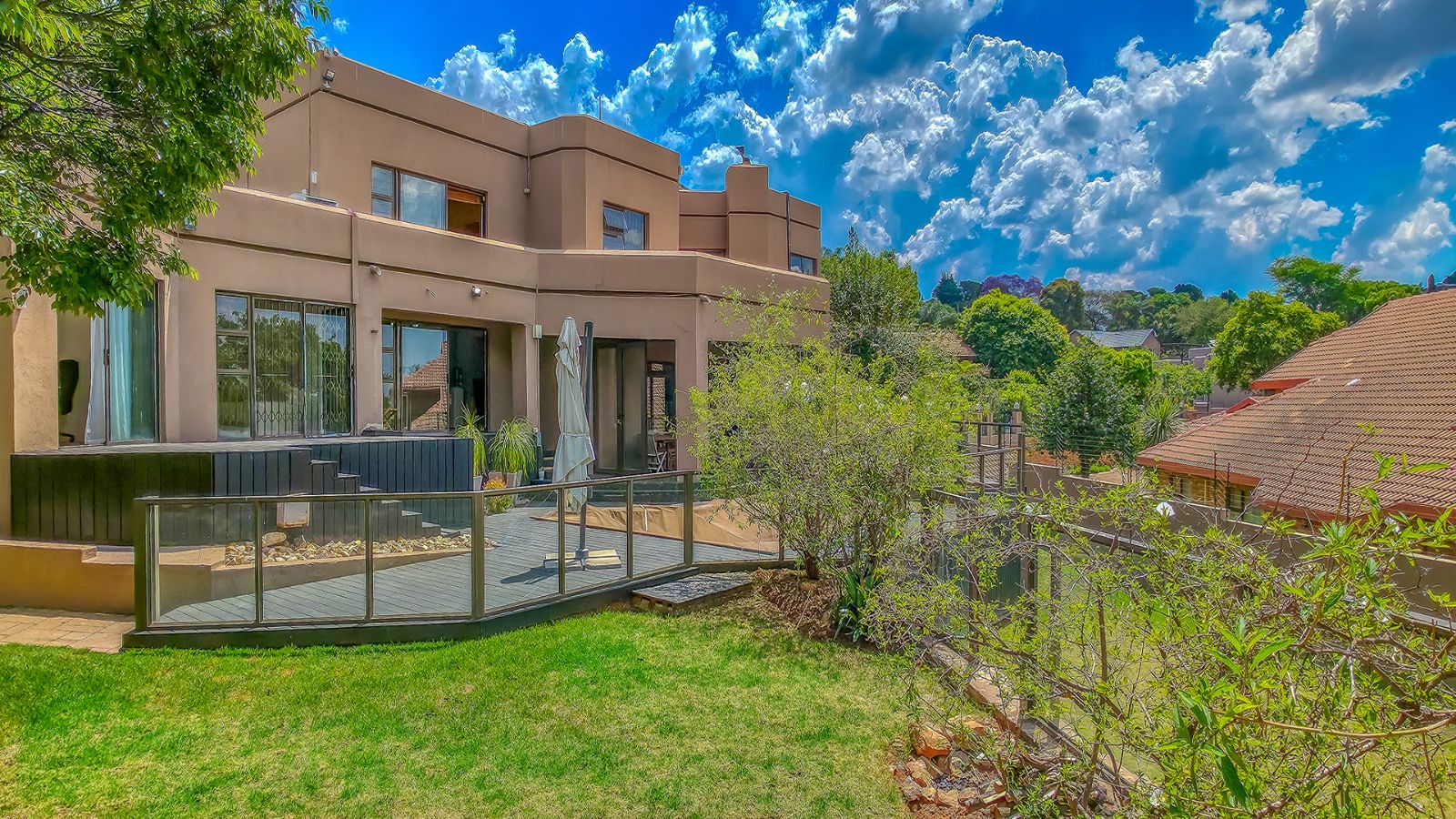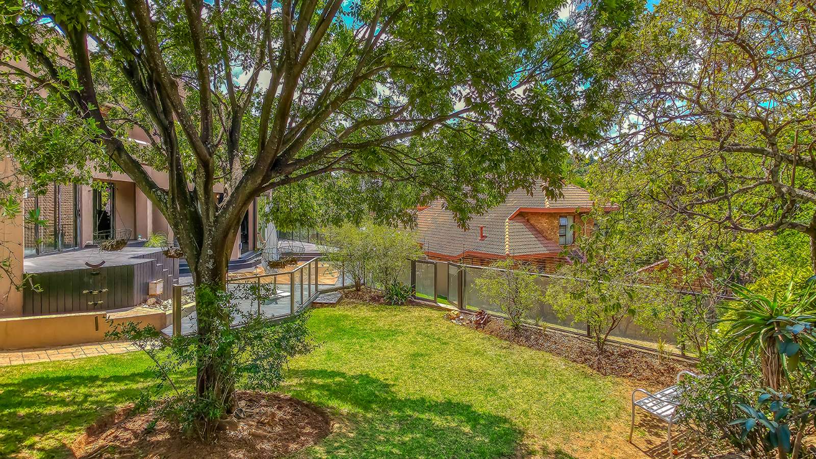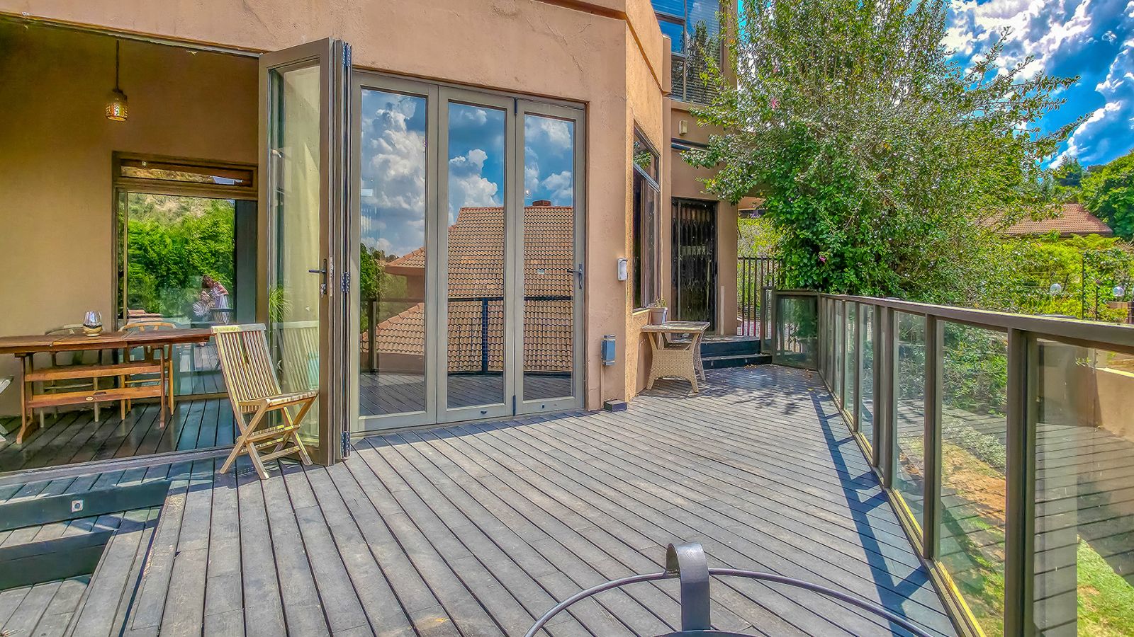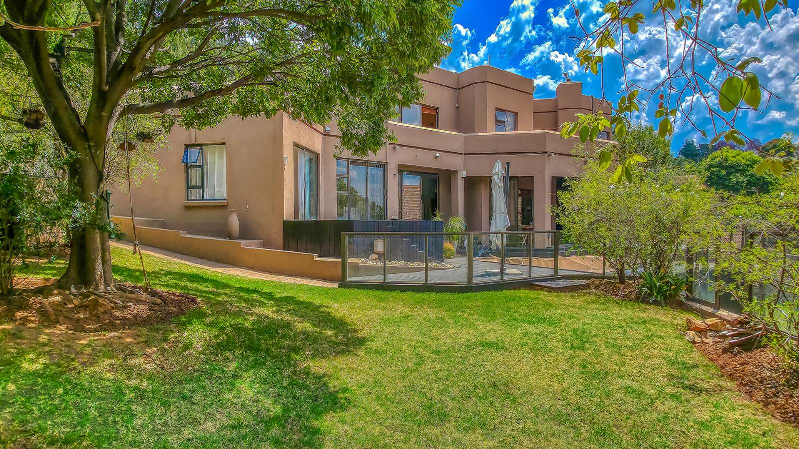 The open plan living areas flow seamlessly onto wooden decks that overlook a manicured garden, a secluded braai area and a secure play area for children - this home is ideal for family living as it also has a large flat that offers versatile space for the extended family or a large functional office.