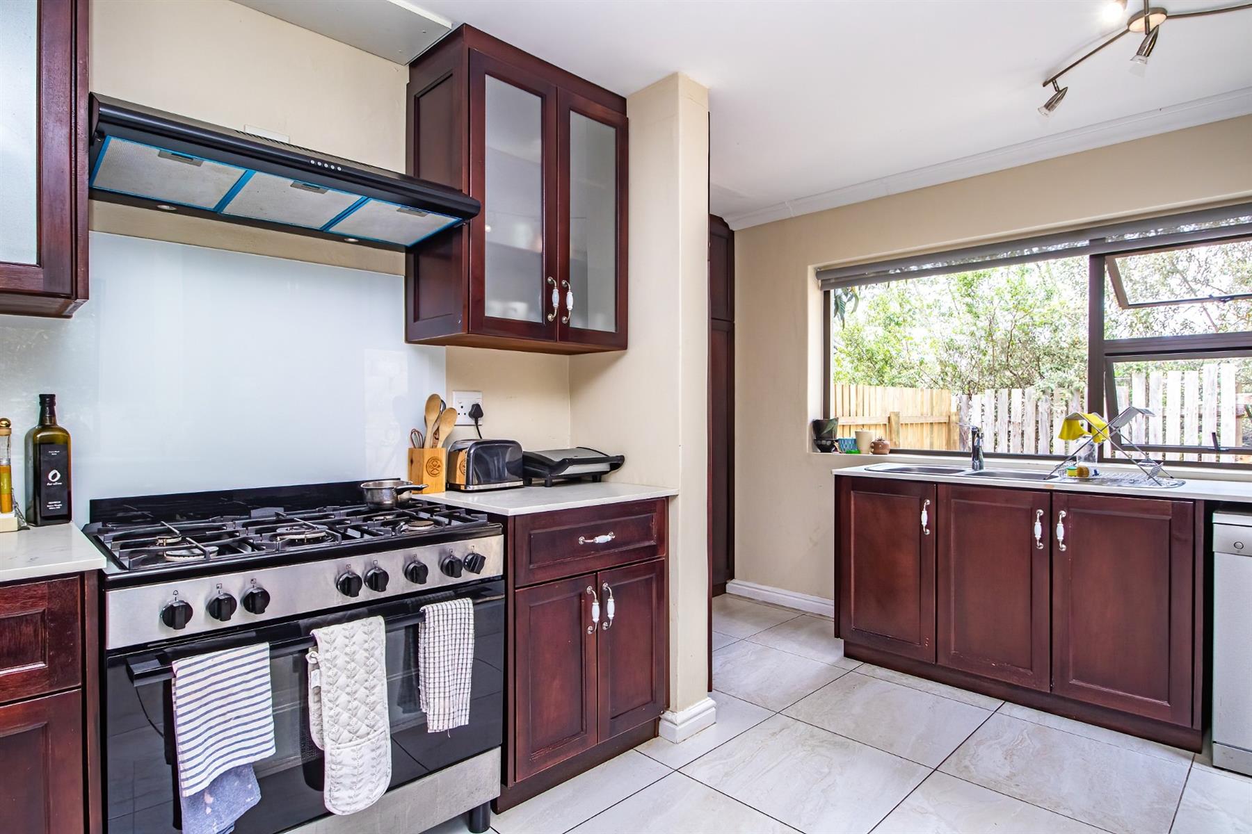The sleek, dark-wood kitchen is both functional and elegant, offering ample cabinetry, a 5-burner gas stove, designated fridge space, a corner cupboard and a separate scullery.